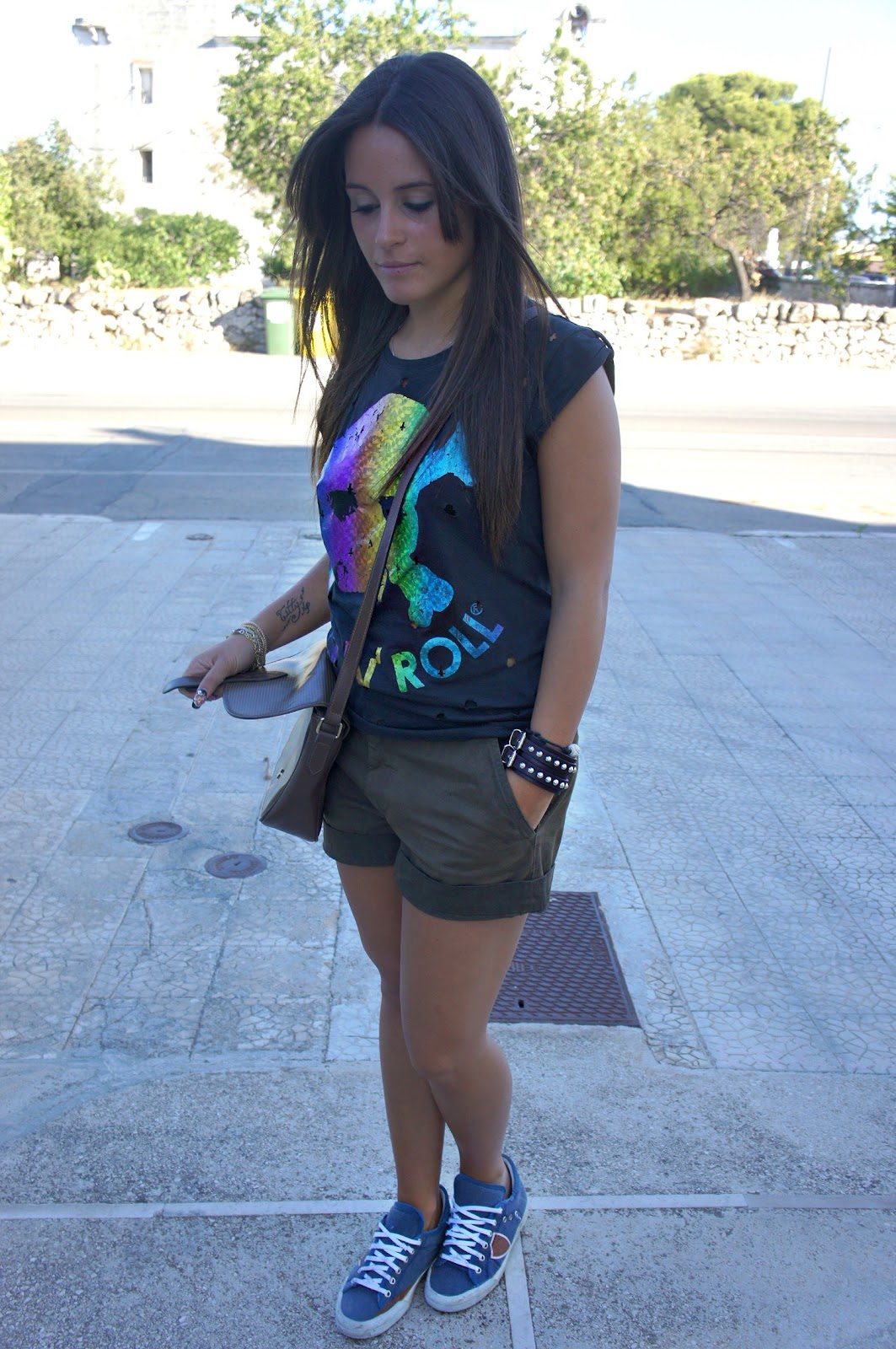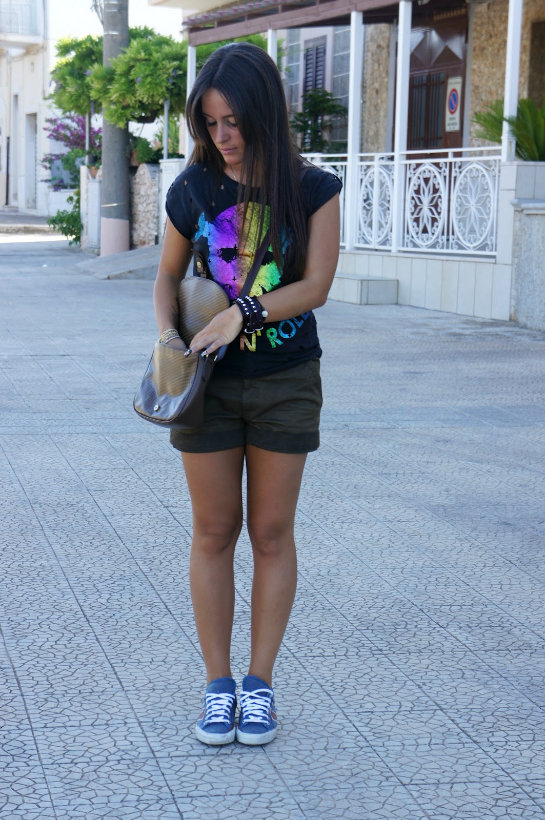 Here’s another outfit of the last few days. You know yesterday after sleeping all day, later on we went to a happy hour on the beach with four friends … a cocktail, a chat and a bit ‘of music, all you need to have fun. In the evening we went to ballare.Potreste ask why there should be so? I reply immediately: Lately I prefer to be comfortable and scatenarmi rather than sit stiffly, unable to move, and so I decided to go with shorts, a t-shirt in my opinion very fashion and gym shoes Philippe Model.