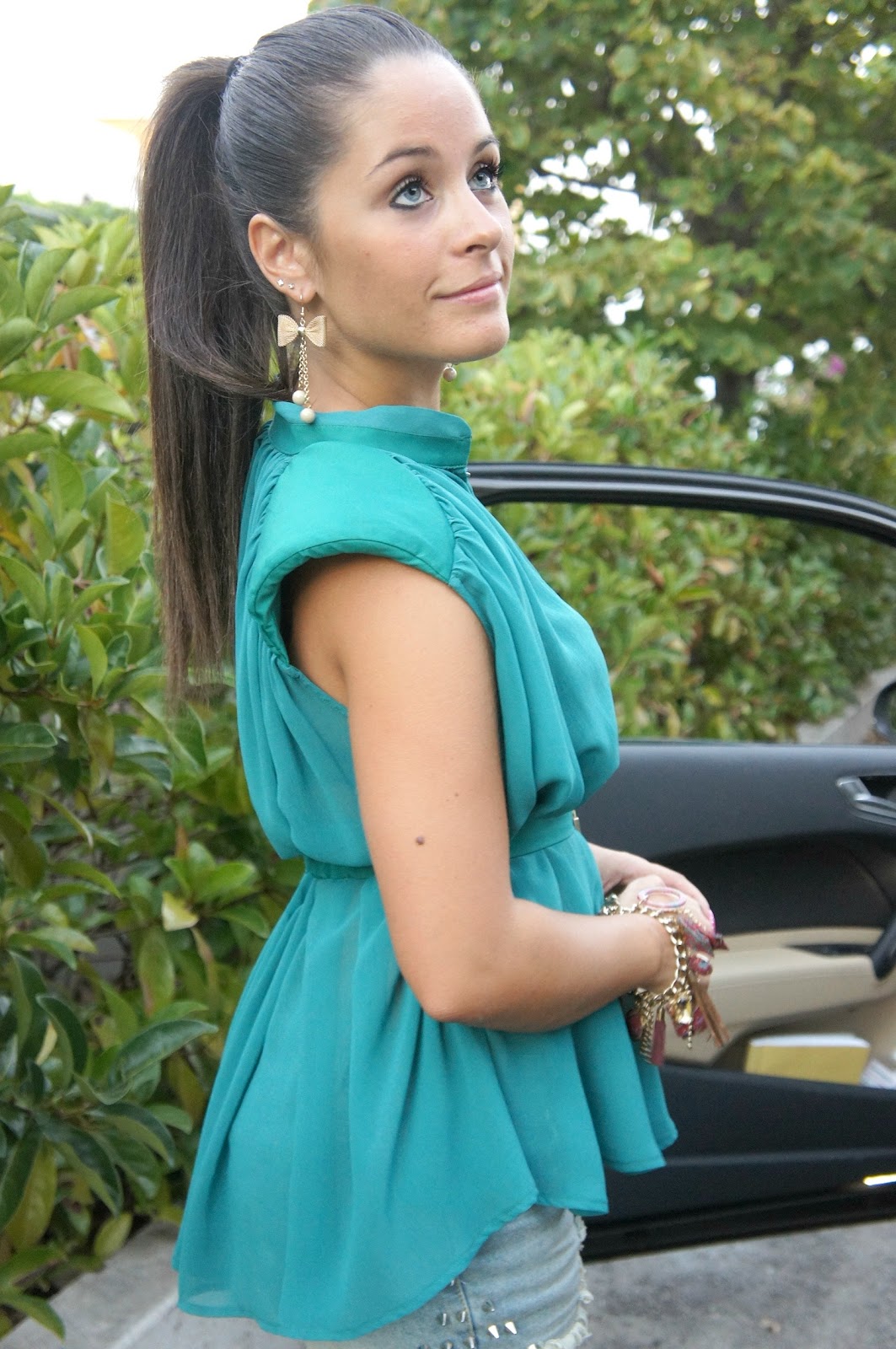 Hello! It is very hot, the air is really suffocating! I prefer to stay at home rather than going out to cool and smother! Maybe in the afternoon head to the beach to cool off a bit ‘there is! My boyfriend is back after 20 days of withdrawal and I must say that I missed a lot. now leave for another two weeks and I am really down in the dumps, but I will refer with friends :-)! On Saturday evening I chose to dress as cool as possible with this green shirt Elisabetta Franchi a little ‘transparent and very short shorts, with the foot of the mythical and dizzy Jeffrey Campbell lace. What do you think?