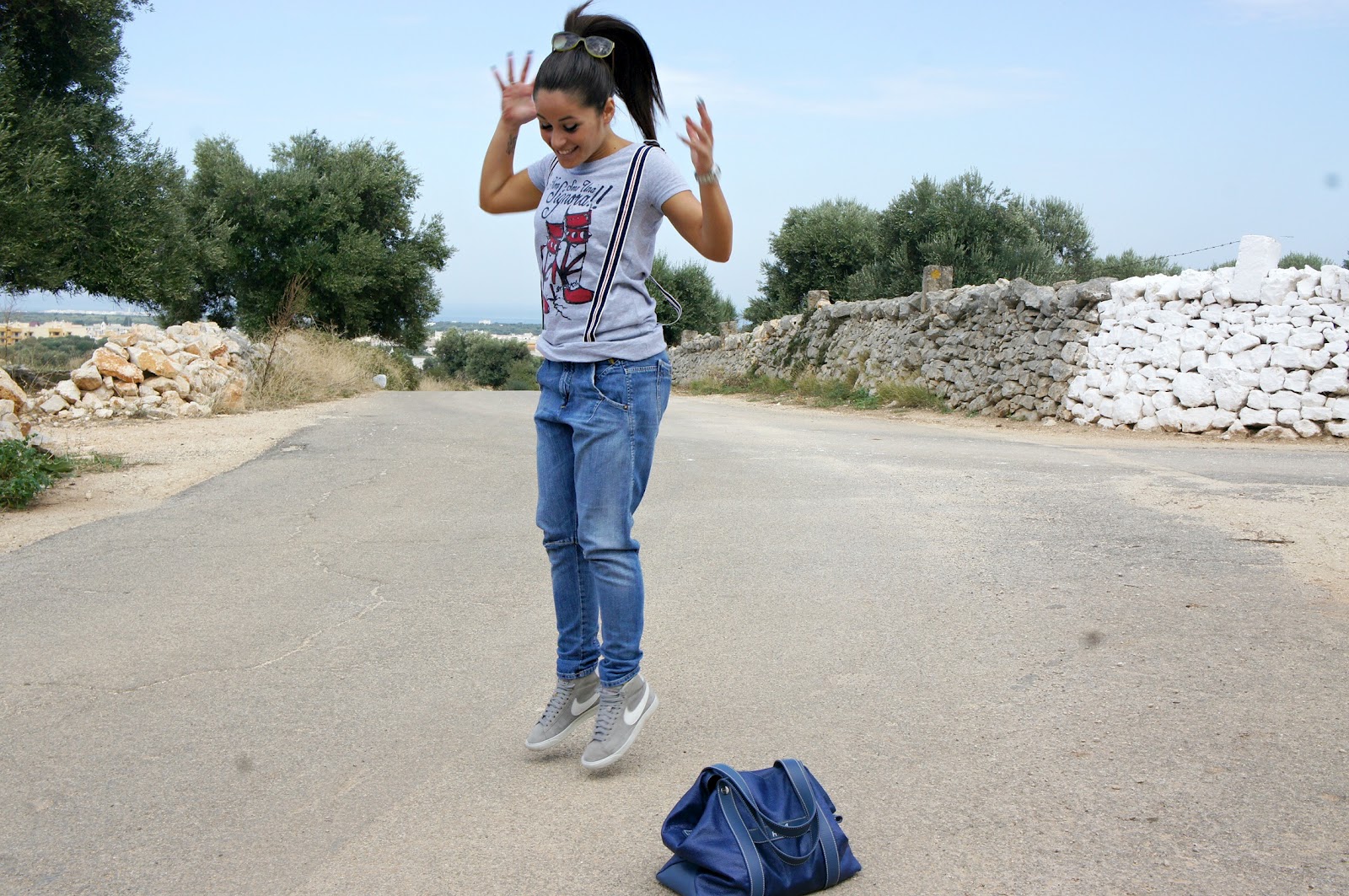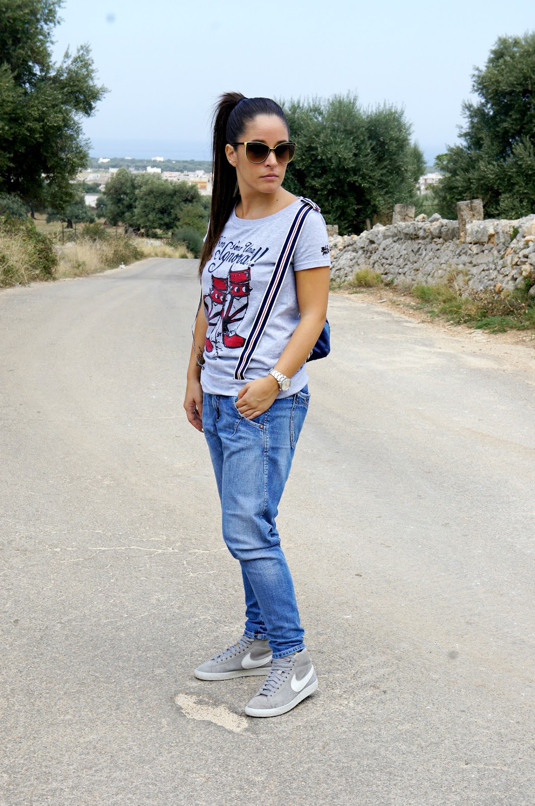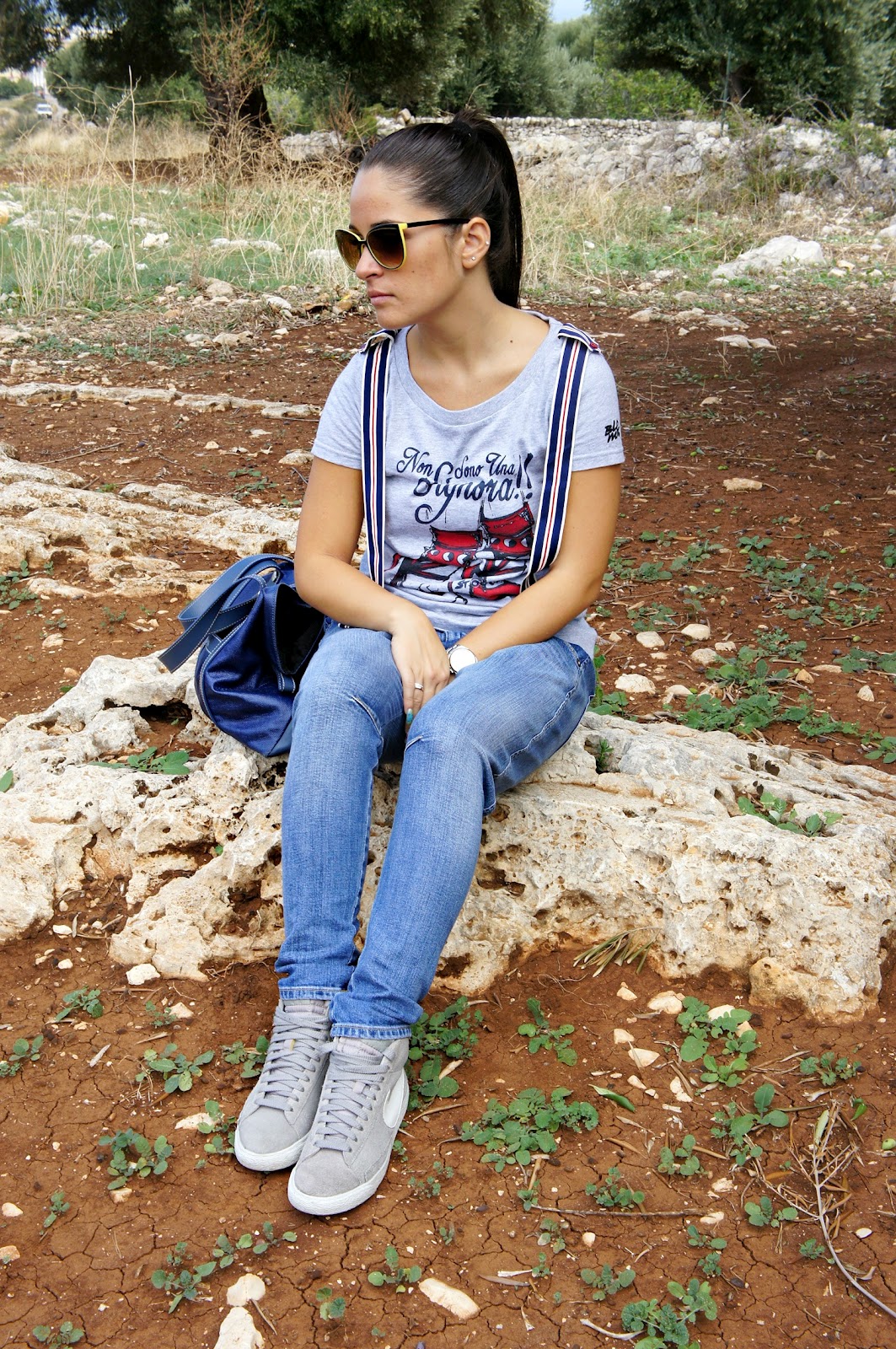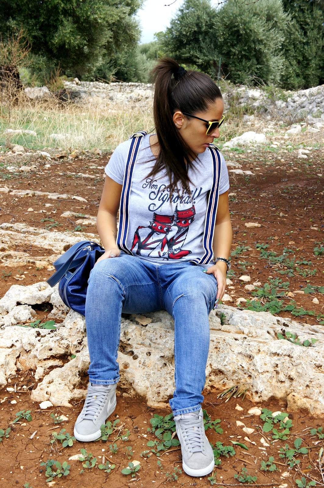 Good day, you know here today is just a beautiful sunny day and this morning after a hurried little ‘chores I took the opportunity to take two shots in a nice quiet place in the country. quiet day, outfit quiet noh? In fact, I chose a horse fell off jeans, a t-shirt with striped suspenders and a pair of Nike sneakers. The choice of the bag, instead, was a bit ‘different from the usual, since the rest dell’outfit is quite sporty.