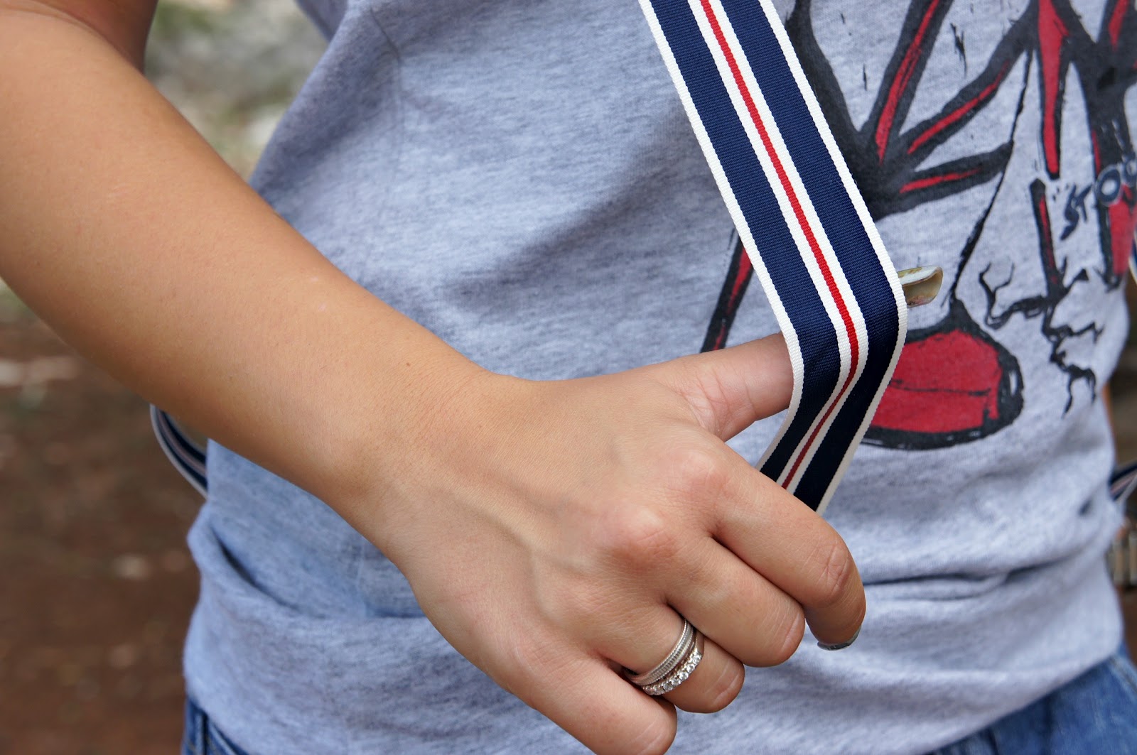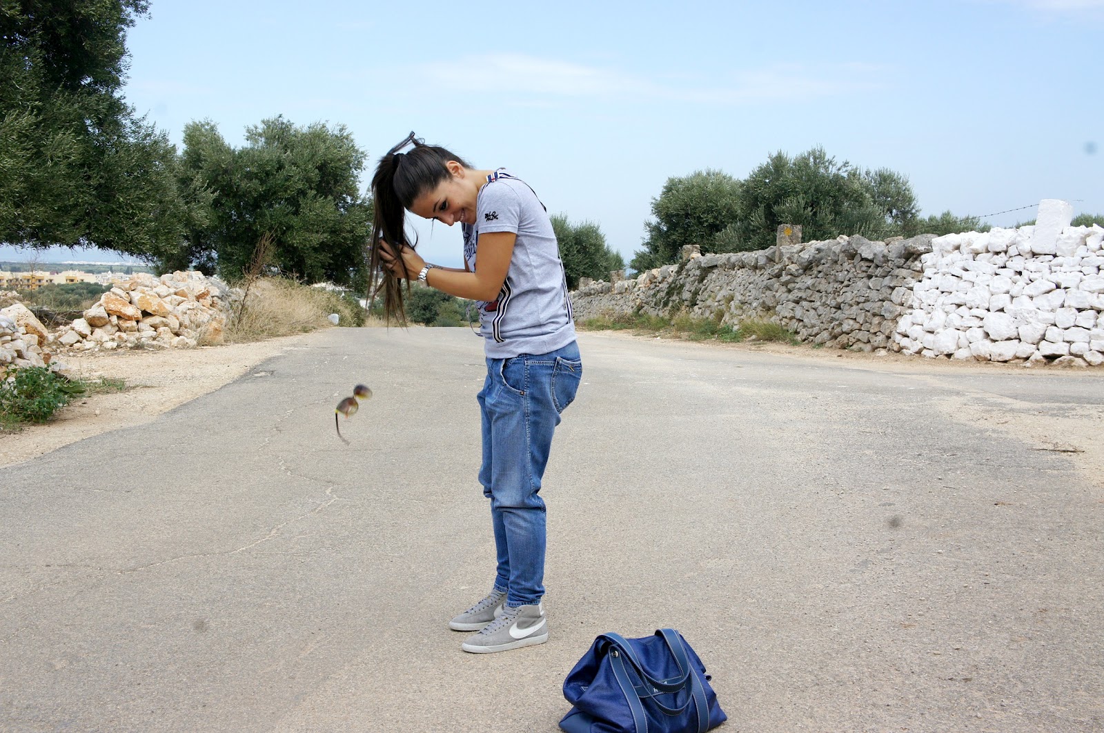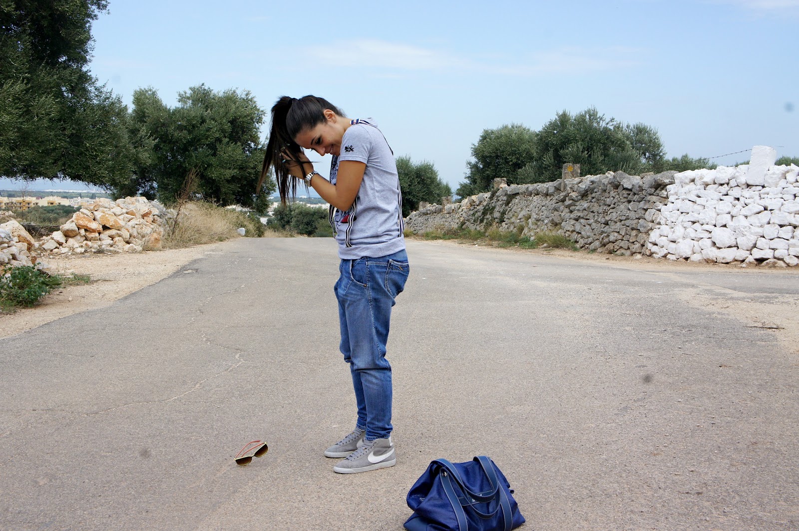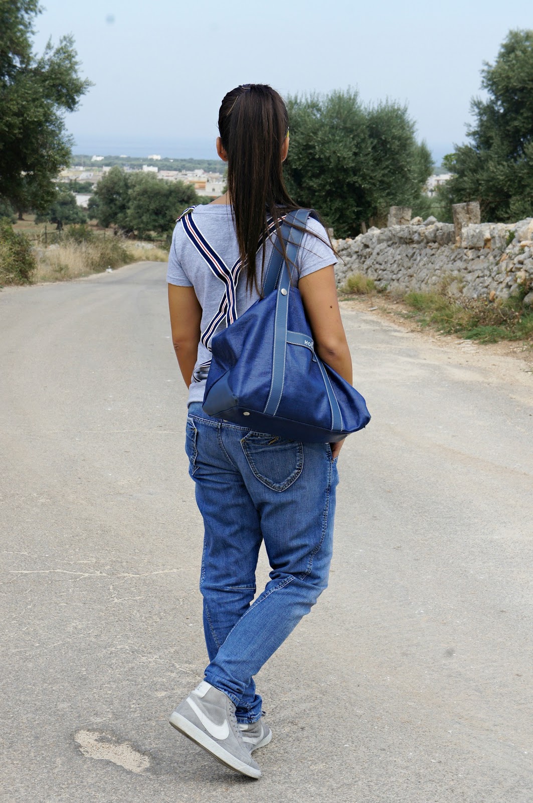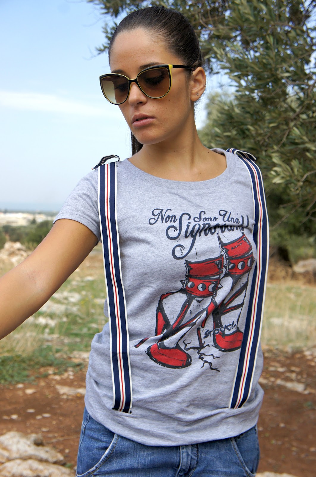 Good day, you know here today is just a beautiful sunny day and this morning after a hurried little ‘chores I took the opportunity to take two shots in a nice quiet place in the country. quiet day, outfit quiet noh? In fact, I chose a horse fell off jeans, a t-shirt with striped suspenders and a pair of Nike sneakers. The choice of the bag, instead, was a bit ‘different from the usual, since the rest dell’outfit is quite sporty.