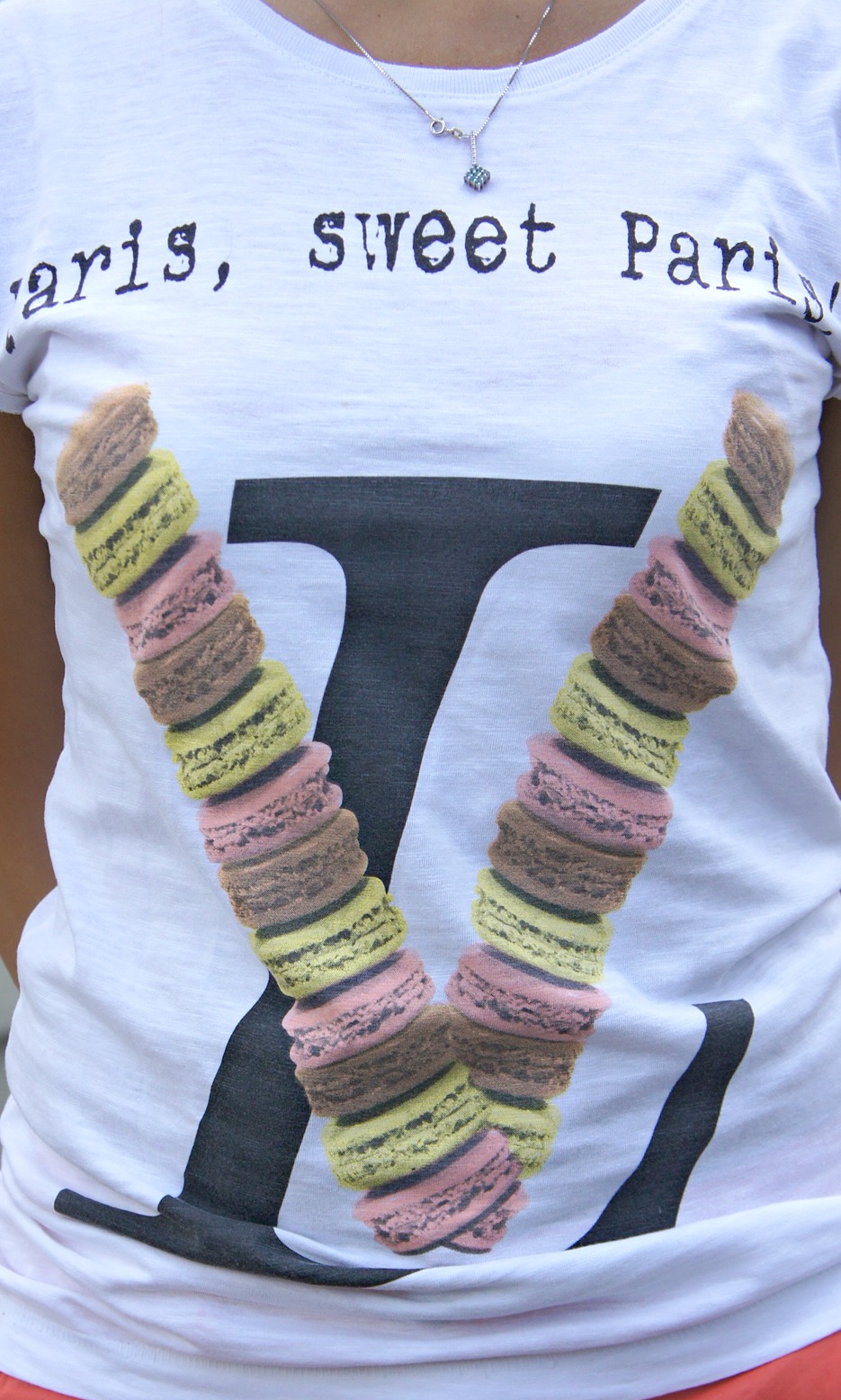Ciao! Ecco qui uno degli outfit indossati in questi giorni…e se devo dire la verità a me non piace affatto: short a metà gamba corallo, t-shirt Happiness con Macaron disegnati su e scarpino Prada per me favoloso. Sapete non vedo l’ora che inizi a fare più freddo e indossare l’invernale…
