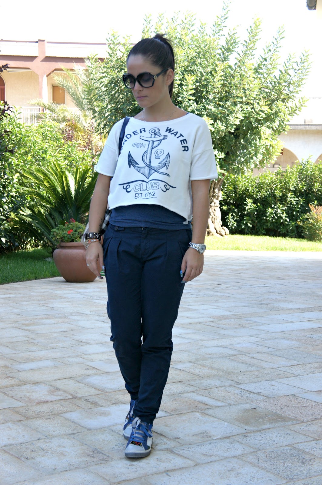 Salve a tutti! Vi piace questo look? è quello da me scelto ieri sera all’ultimissimo momento: pantalone blu a cavallo sceso, canotta e t-shirt larga felpata con questa bellissima ancora disegnata nel centro. Le scarpe, le ho selte come primo indumento e in base a queste ho deciso cosa indossare…