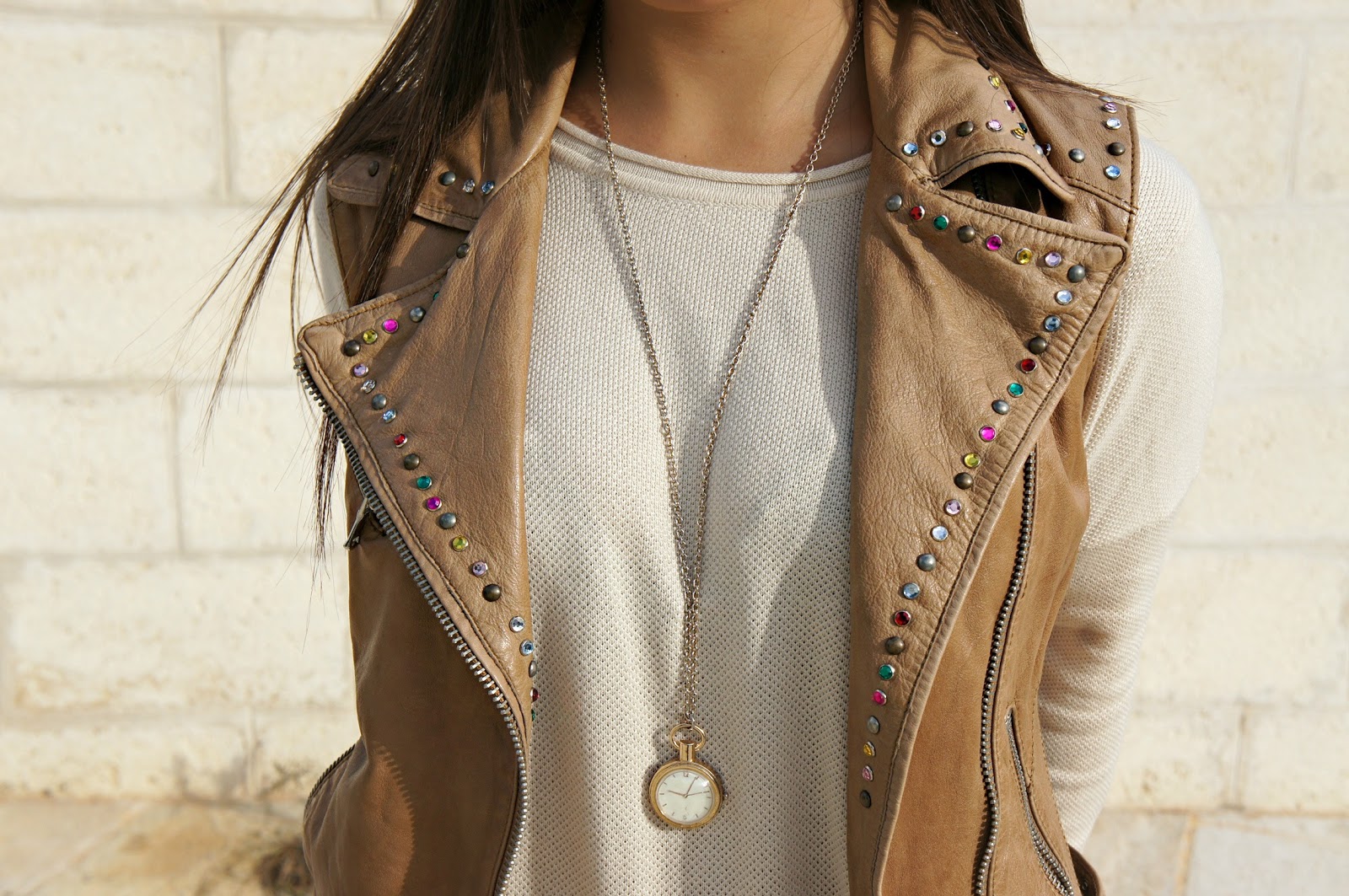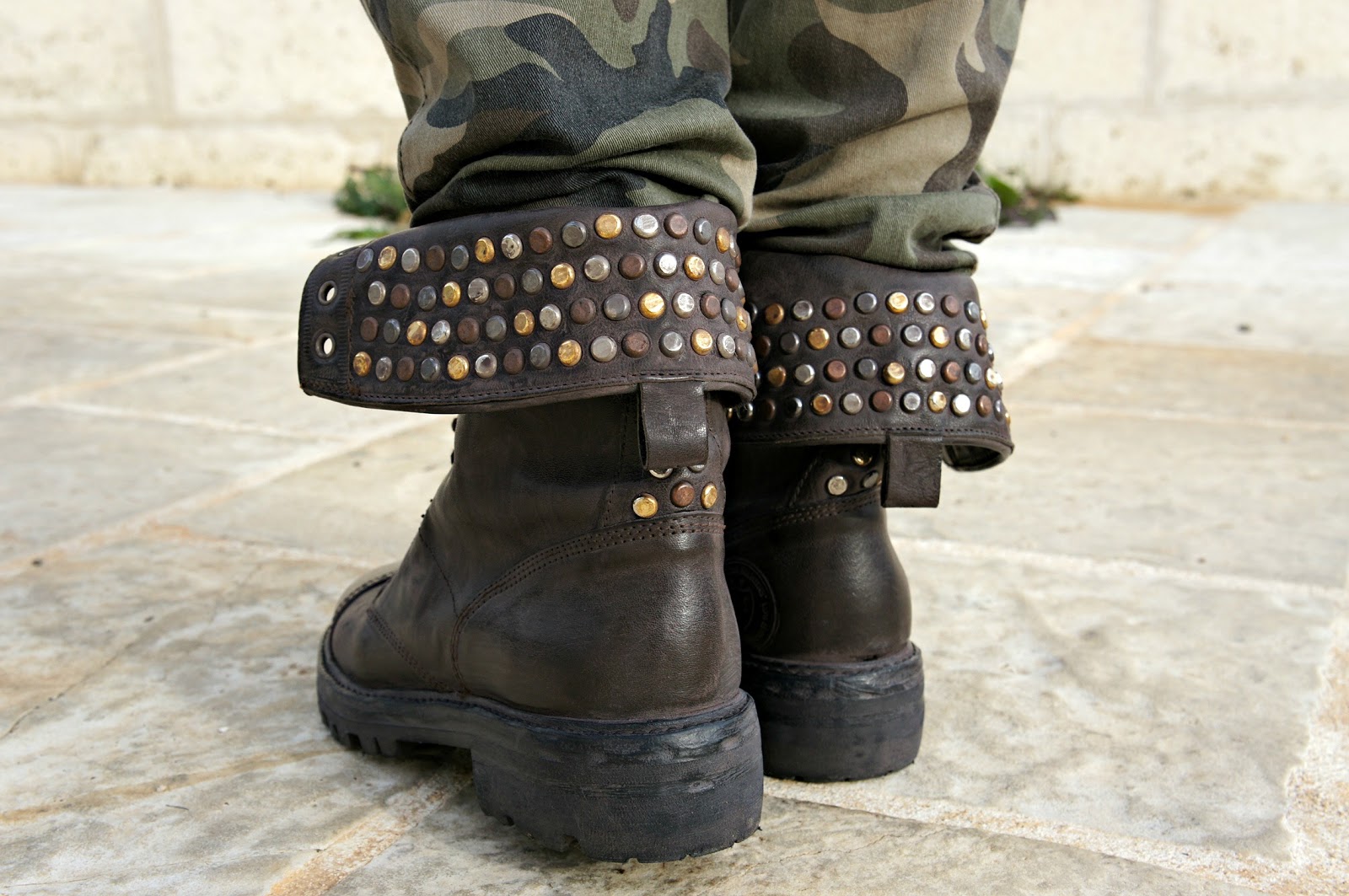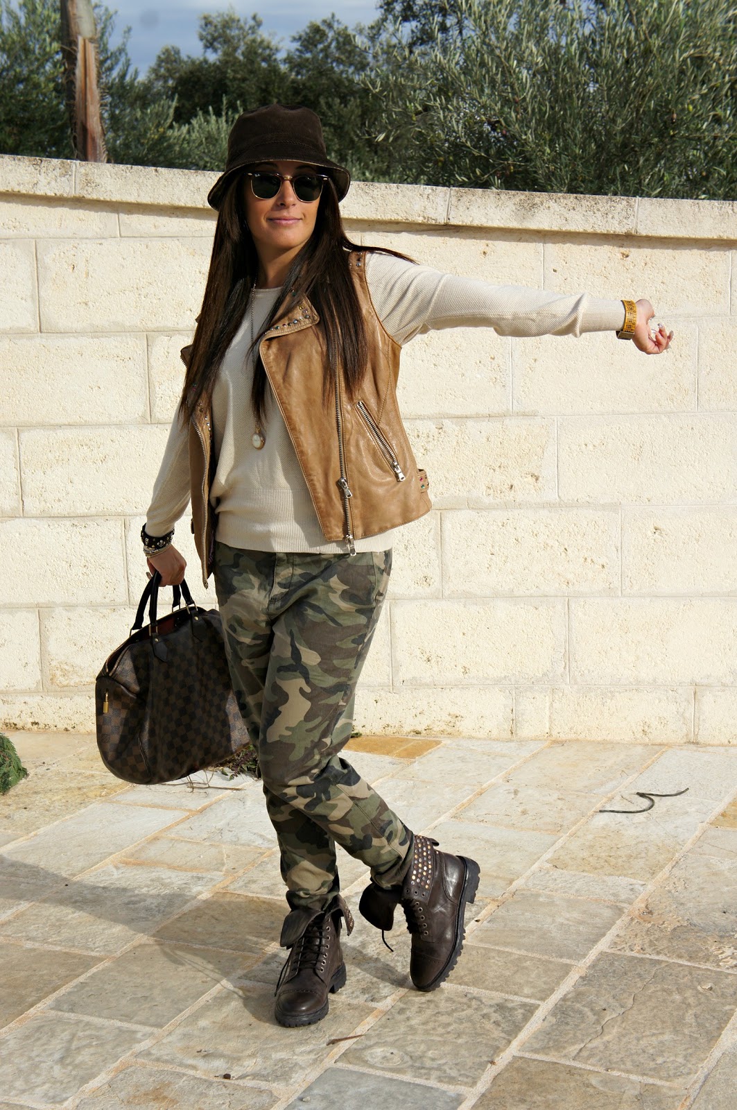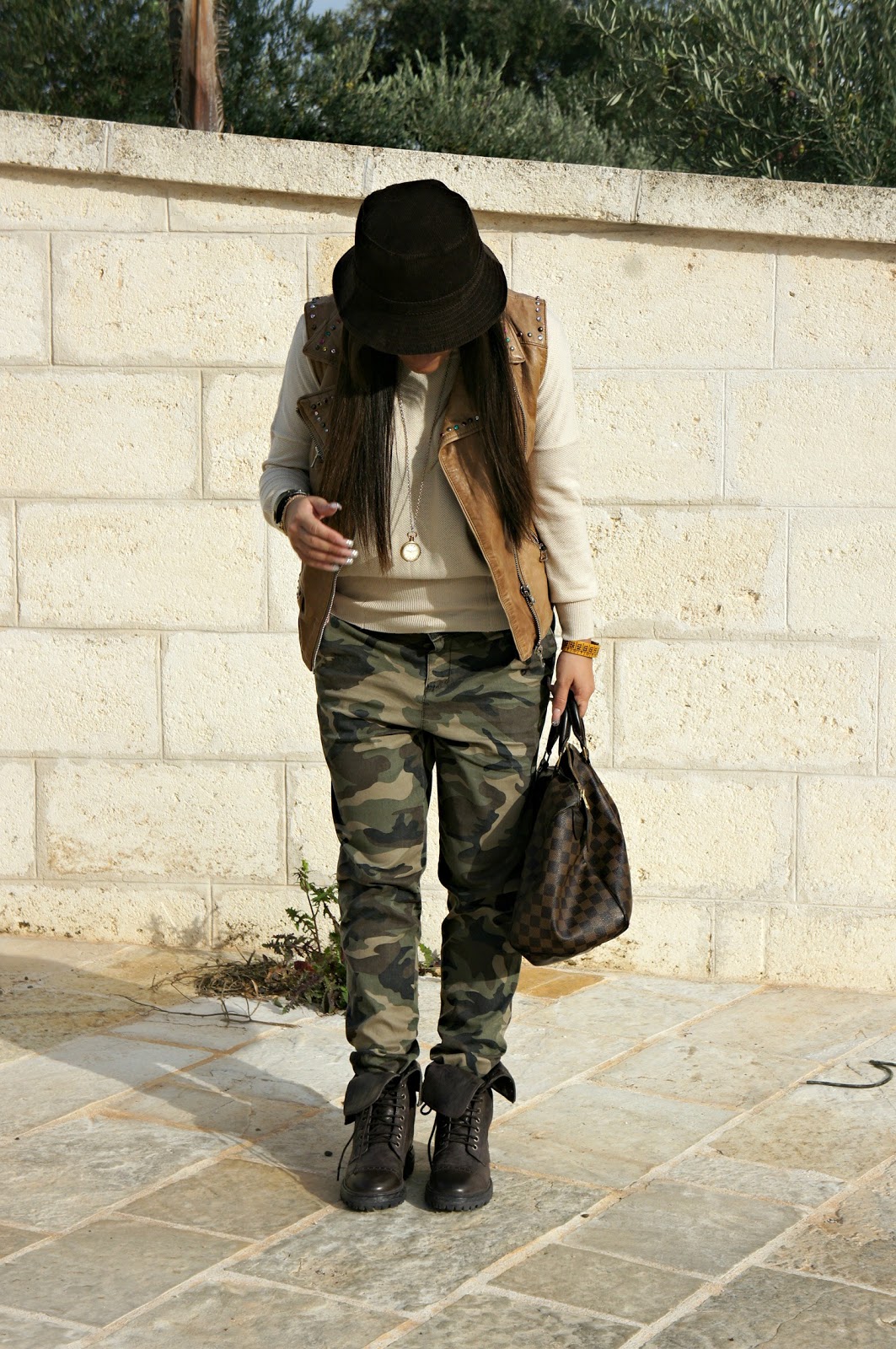 Good day! Here is a new post for you. I finally got to wear this camouflage pants that I bought a few month ago … then I have combined? I chose to wear these boots to mo ‘military and a sweater in cool wool, because you know it is not yet time to put something heavier, although it seems that the cold will arrive in a few days. In addition, since I could not get away with just the sweater, I decided to put one of my absolute favorite leaders who do not give up for anything in the world, and I think you will see me very often, the studded leather vest in Le Sentier, a brand that I’m in love. Finally, as regards the accessories I went on the simple, bracelet and necklace with clock centimeter, plus I wanted to add this hat brown. I must admit that the final effect I liked very much and you? A big kiss to all!