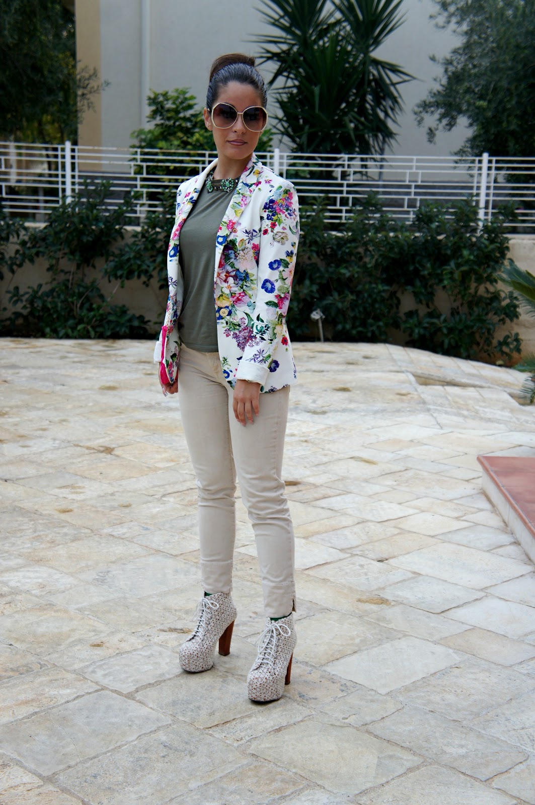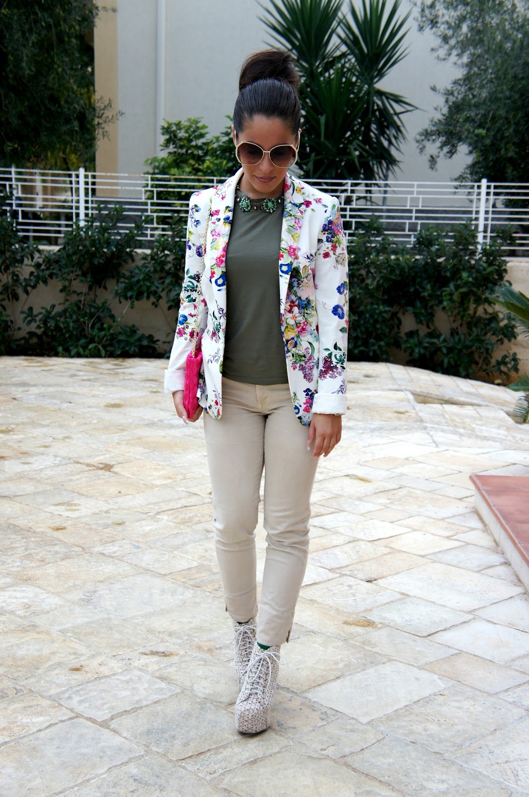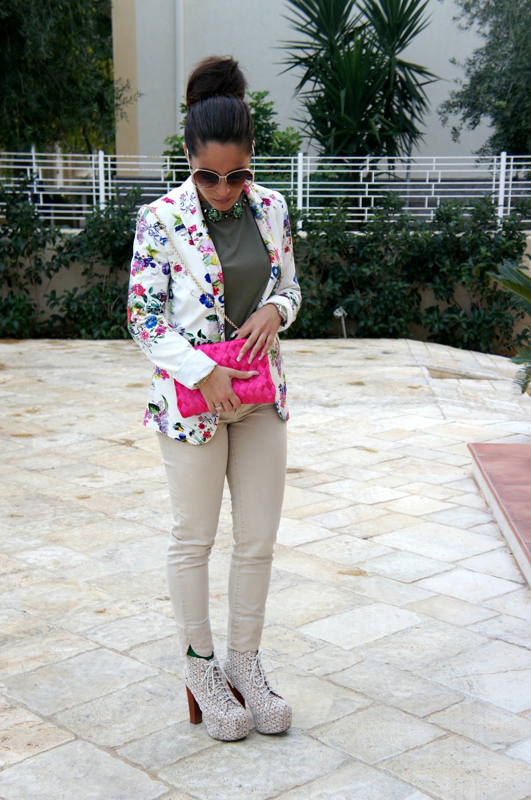 Good Sunday to you all! After the post of my latest purchases, I’m here to offer you an outfit that I wore the pink clutch. Everything has been chosen on the basis of it, first the jacket as you can see is more flowery and also picks up the color of the bag and I think it’s fine. As for the rest, I chose a clear capri pants, which if you remember I wore HERE also, a green shirt on a necklace of pearls surrounded with effect necklace and Jeffrey Campbell lace, my first Jeffrey Campbell (as now I have more than a couple). I will tell you a little something: I love quest ‘outfit!