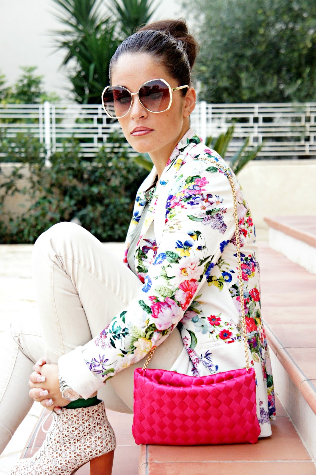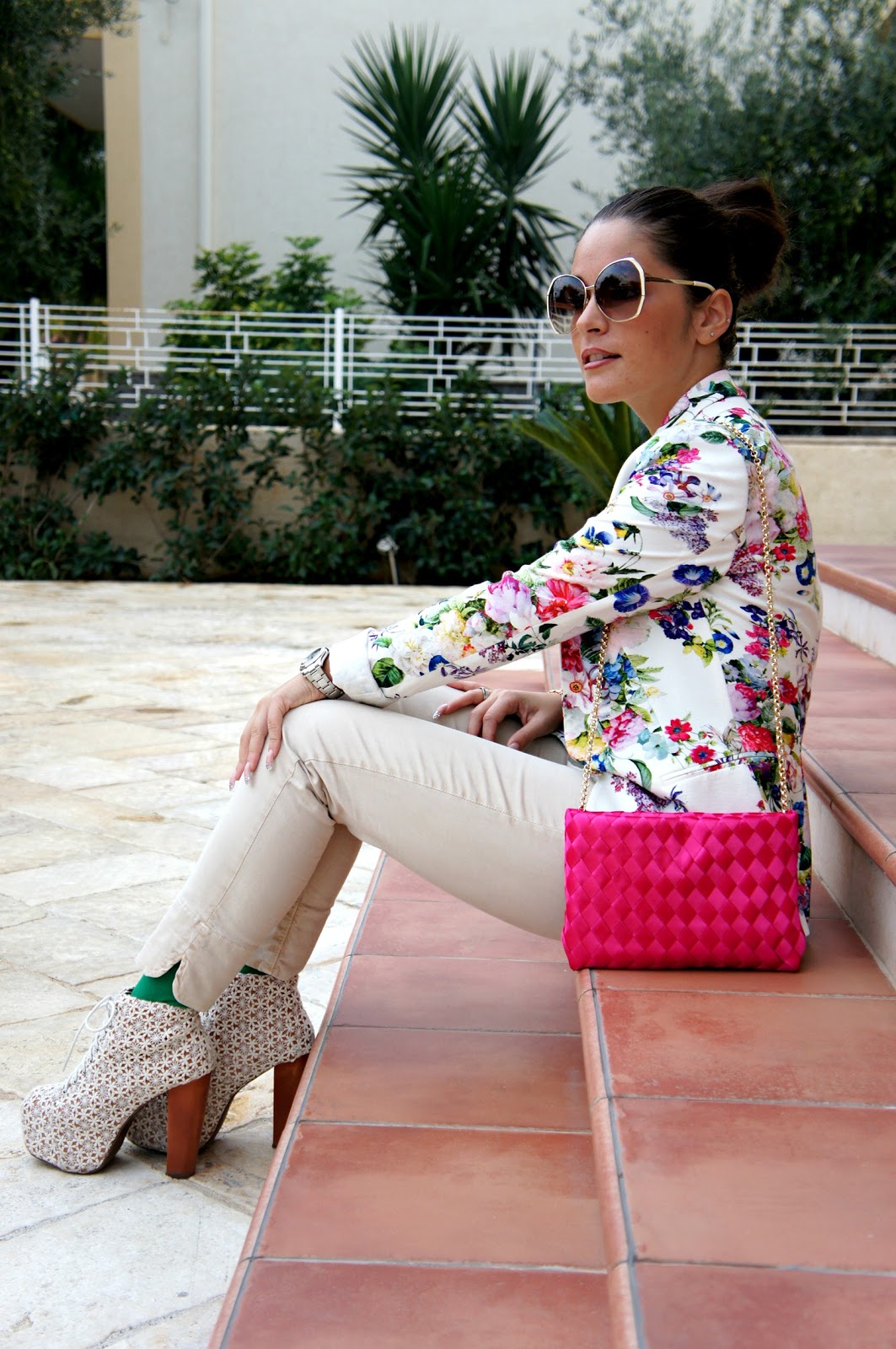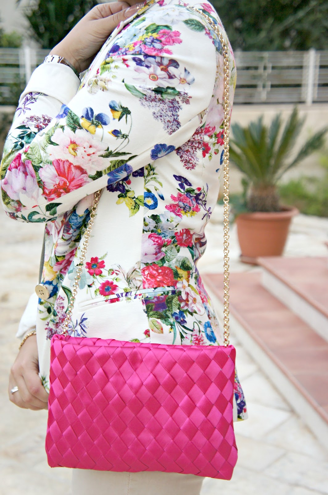 Buona domenica a tutte voi! Dopo il post dei miei ultimissimi acquisti, eccomi qui a proporvi un outfit in cui ho indossato la pochette fucsia. Tutto è stato scelto in base ad essa, in primis la giacca che come potete vedere è fiorata e per di più riprende anche il colore della borsa stessa e secondo me ci sta benissimo…