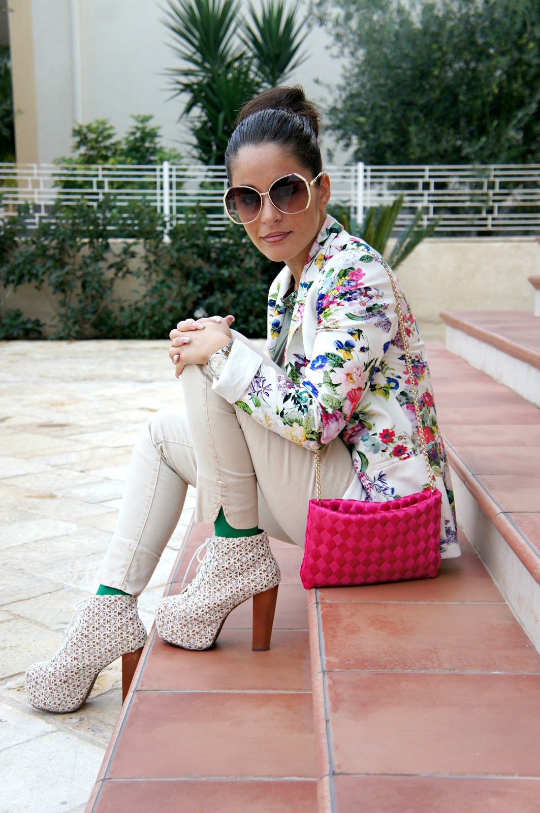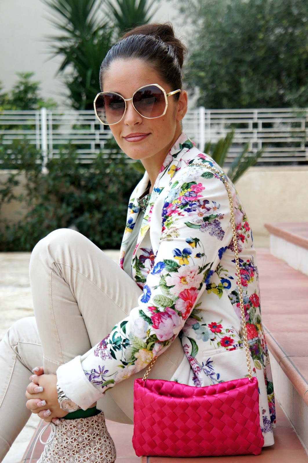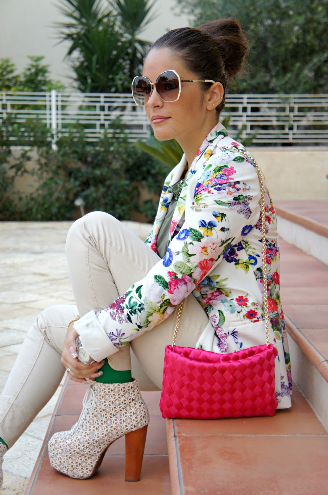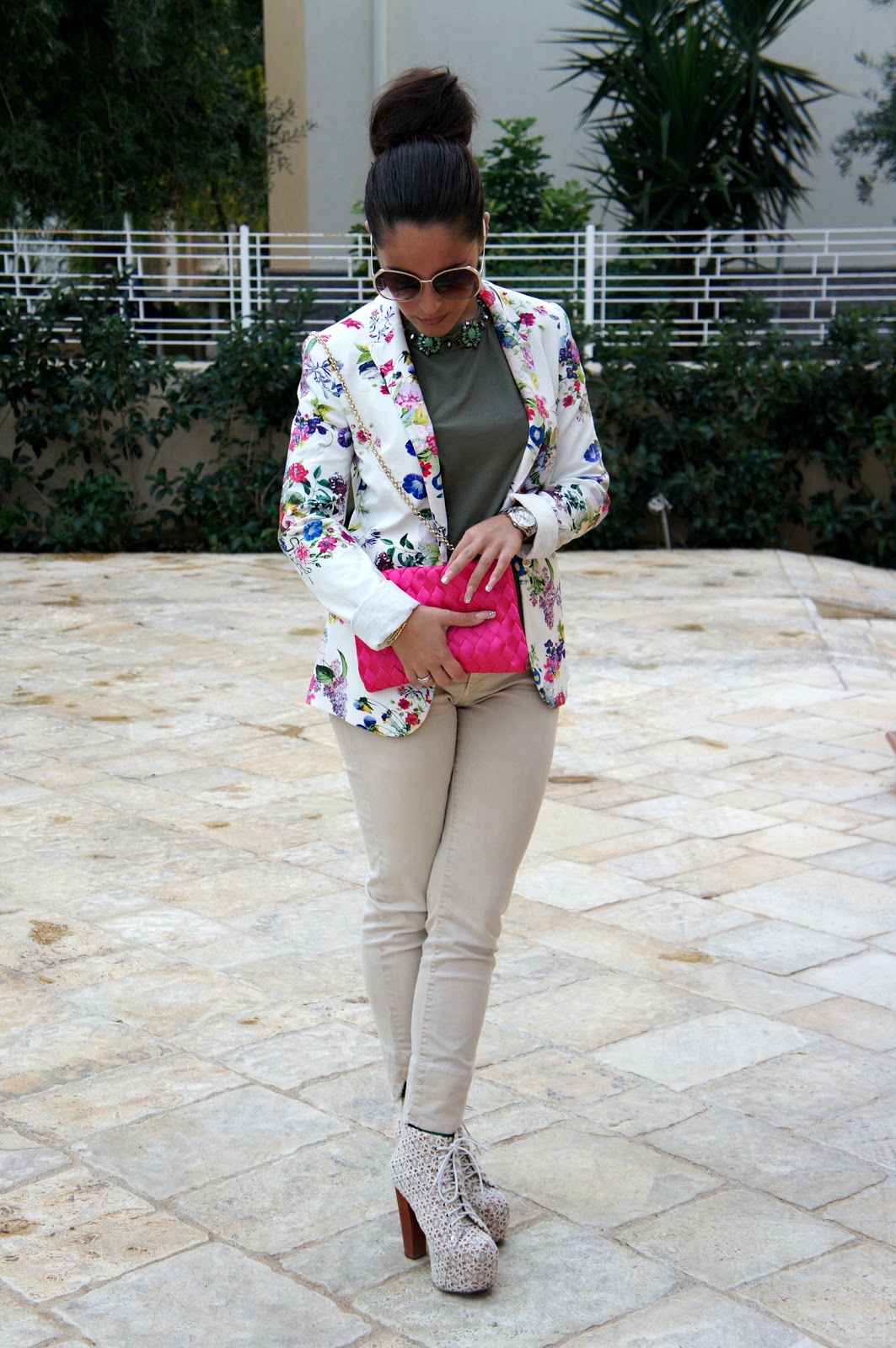 Buona domenica a tutte voi! Dopo il post dei miei ultimissimi acquisti, eccomi qui a proporvi un outfit in cui ho indossato la pochette fucsia. Tutto è stato scelto in base ad essa, in primis la giacca che come potete vedere è fiorata e per di più riprende anche il colore della borsa stessa e secondo me ci sta benissimo…