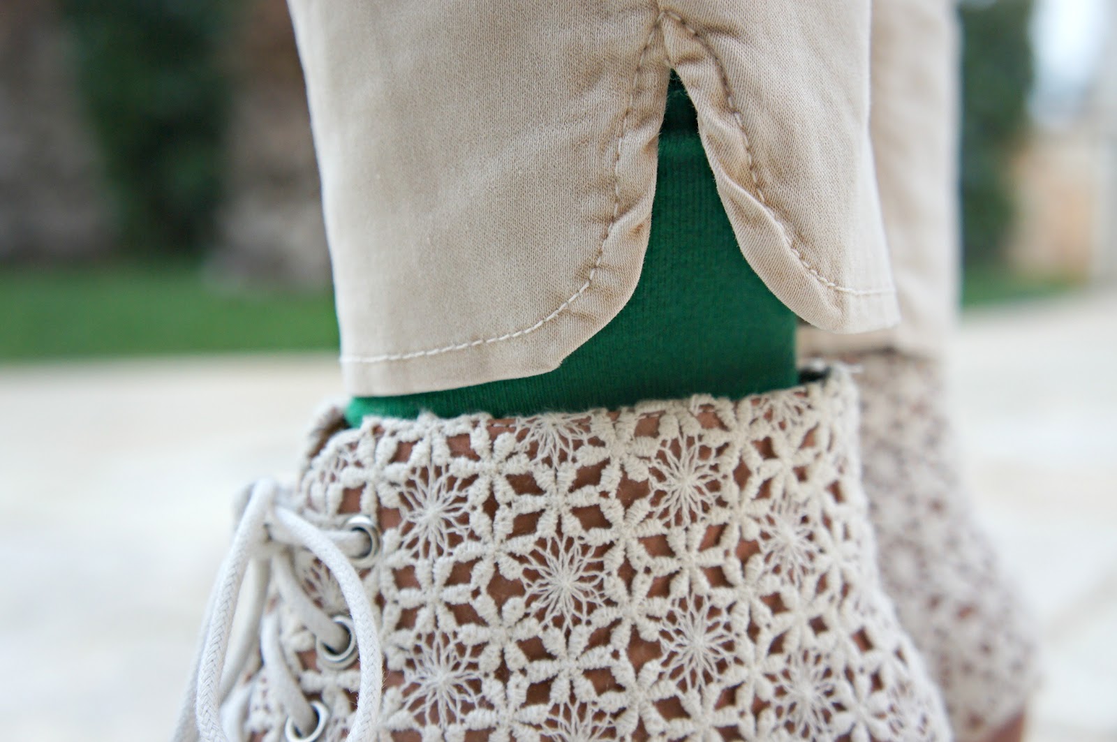 Per quanto riguarda il resto, ho scelto un pantalone chiaro a pinocchietto, che se ricordate ho indossato anche QUI, una maglia sul verde a girocollo contornata di perle con effetto collana e le Jeffrey Campbell in pizzo, le mie prime Jeffrey Campbell (visto che adesso ho più di un paio). Vi svelo una cosetta: io adoro quest’ outfit!