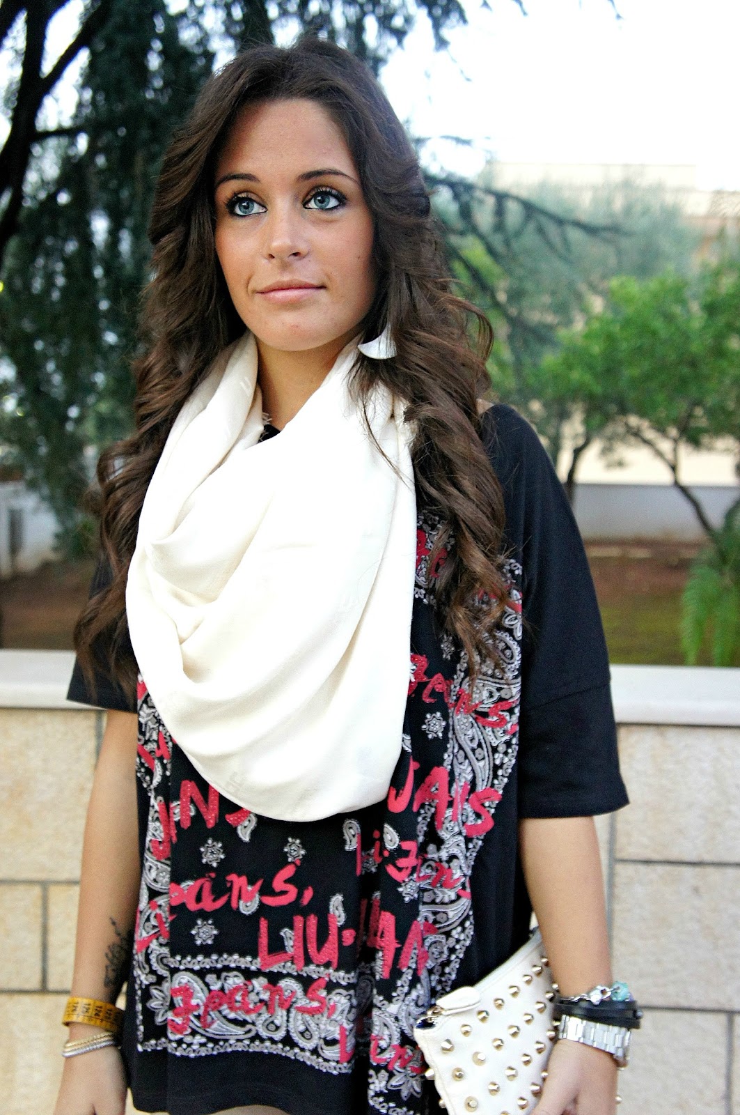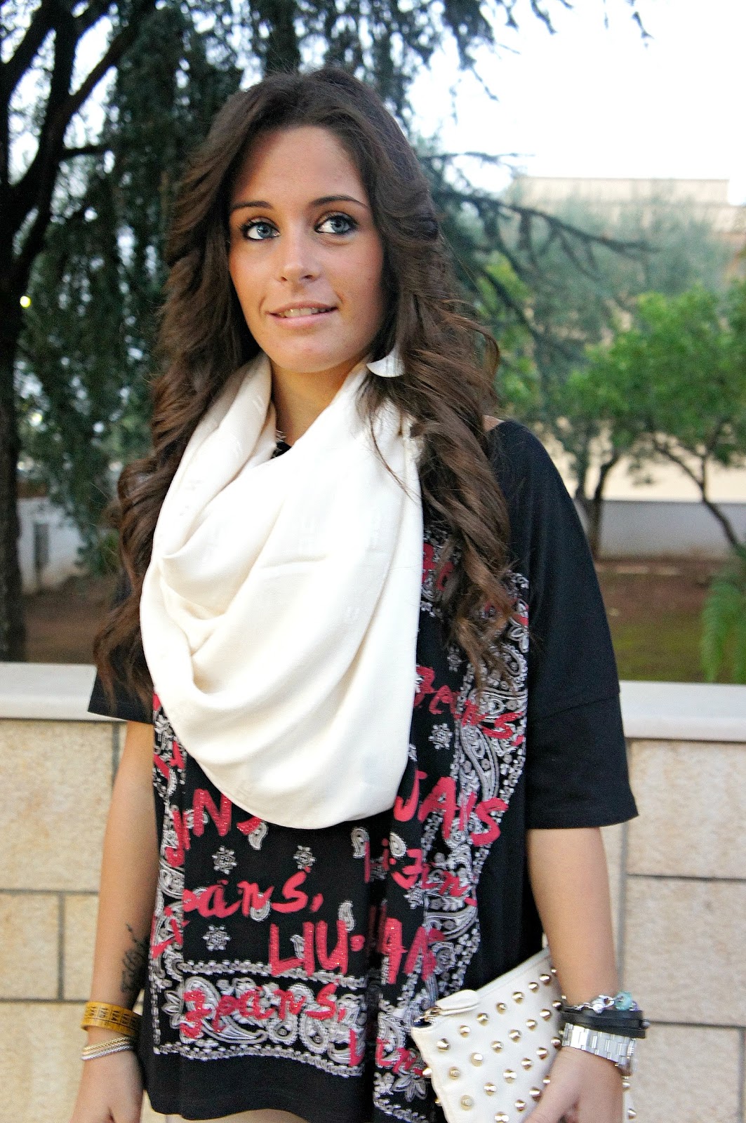Devo dire che nel complesso questo look mi piace tanto, non so se per i colori o per l’acconciatura che mi cambia radicalmente! Come potete vedere ho scelto un jeans stretto sul beige, una maxi t-shirt nera che avete già visto nella versione fucsia QUI e le ballerine con stampa animalier. In più ho scelto questa enorme sciarpa di Celyn B. by Elisabetta Franchi e come vi ho già detto la nuova borsetta! Spero che questo mio nuovo look vi piaccia!