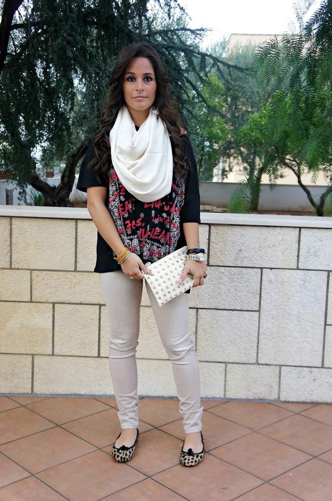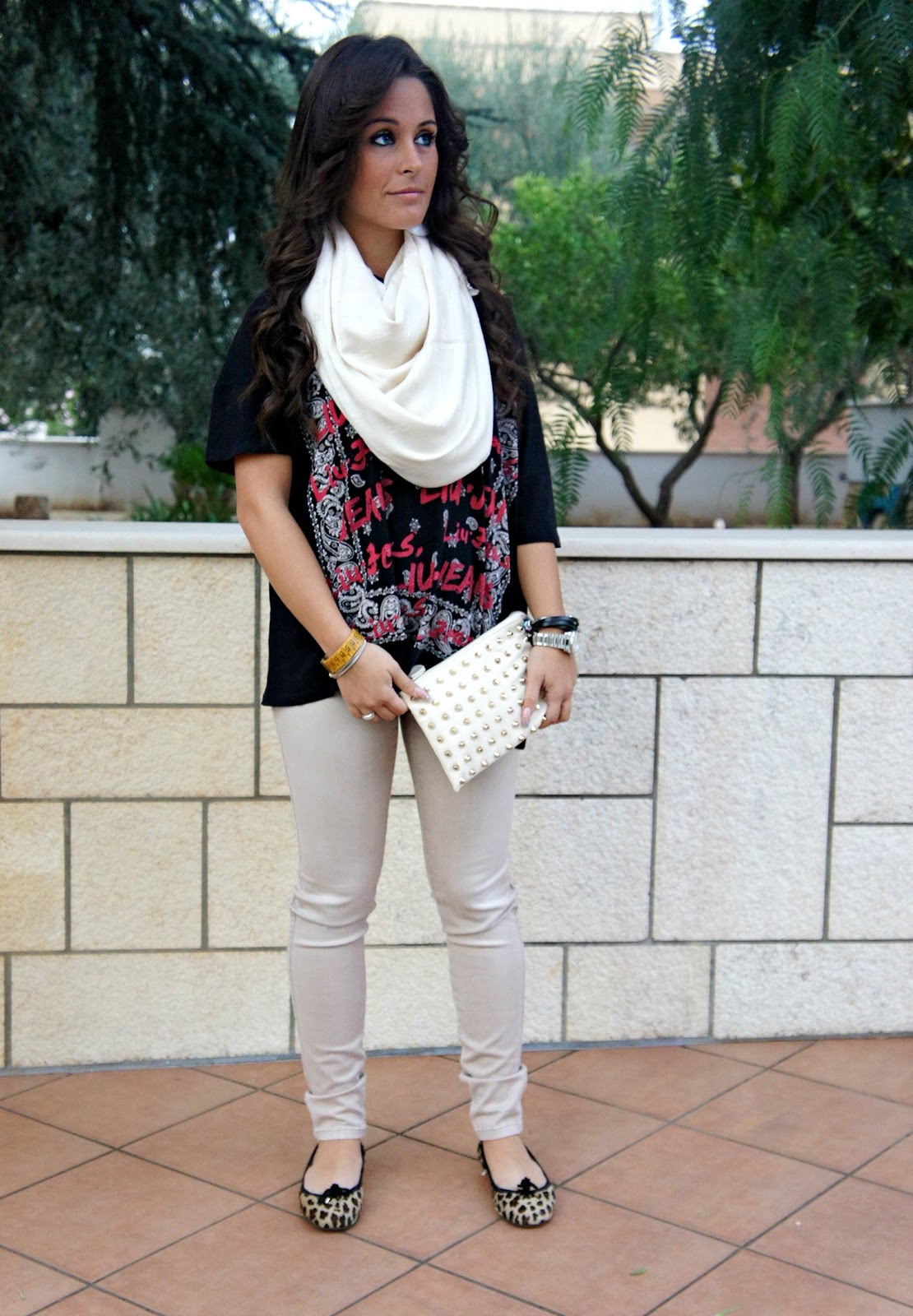 Welcome back to my blog! How are you? Today I want to show you the outfit I decided to wear my new bag. I bought this clutch from Zara a few days ago … I particularly liked the color and decided to buy it. I must say that overall I really like this look, I do not know if the colors or the hairstyle that I radically changed! As you can see I chose a tight jeans on beige, a big black t-shirt that you have already seen the pink version HERE and the dancers with animal print. In addition, I chose this huge scarf Celyn B. by Elisabetta Franchi and as I have already said the new purse! I hope this new look you like it!