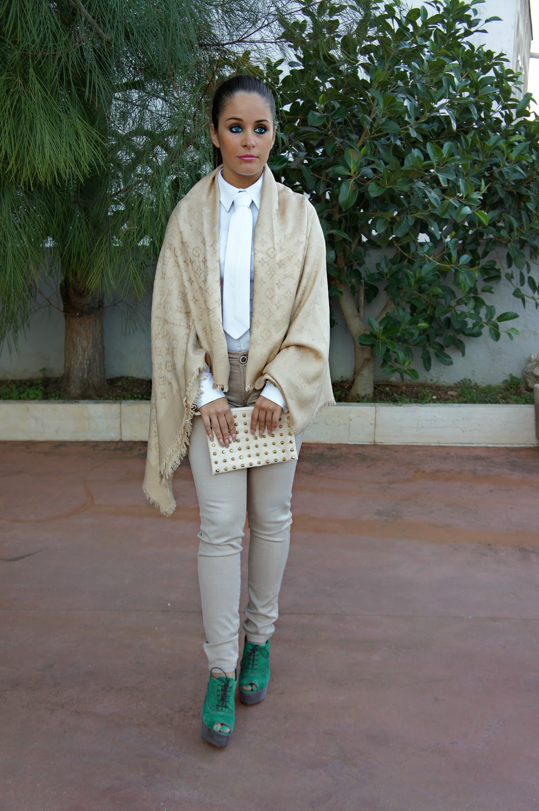 Goodafternoon! Today we offred you an outfit based on neutral and subdued colors like the beige of pants and of LV stole, and the white of shirt. Pure colors that I personally love a lot because they are easly combined and beautiful tosee like the clothes that I wear today. The masterpiece of the outfit are the bright green shoes whit high heels and super plateau. What do you think about tie? Do you like it? Do you wear it? But I have to say that it is incorporated into the shirt. In these last days, like you can see, I have gather my hair in a hosetail, it is hairstyle that I would often do it because I think that it’s comfortable. Good week-end to everyboody!