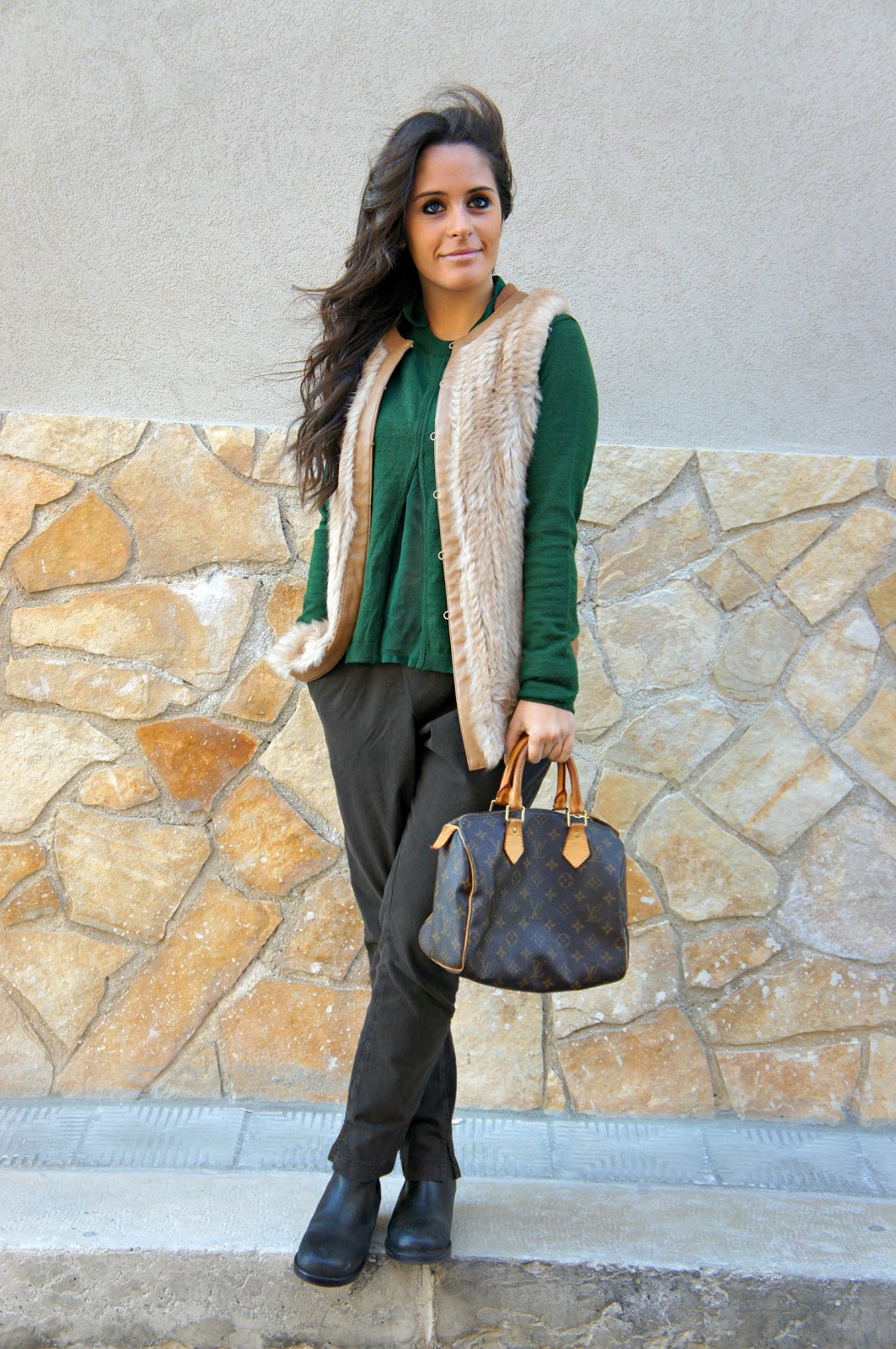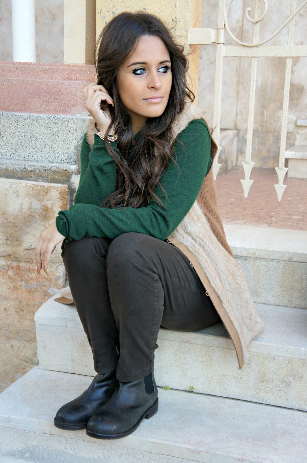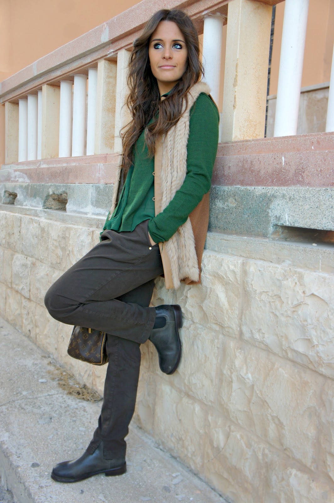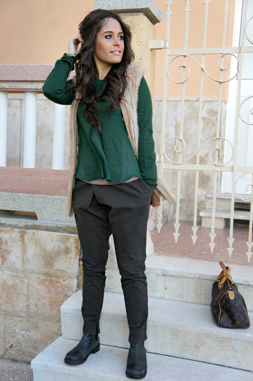 Hello fashionblogger or not, today’s post sees Annalisa returning to a style a little more sporty and casual: brown pants Manila Grace and sweater green, as you can see is not your typical sweater girogola, but has its own particular the neck and waist. Wearing a fur vest Pinko, to whom I am very fond of and which I believe to be a leader rather easy to match. I looked in the mirror, trying this boot Mister Wolf I saw that I was able to center the outfit I had in mind. It was windy that day, in fact once the hair fluttered in the photos here and there.