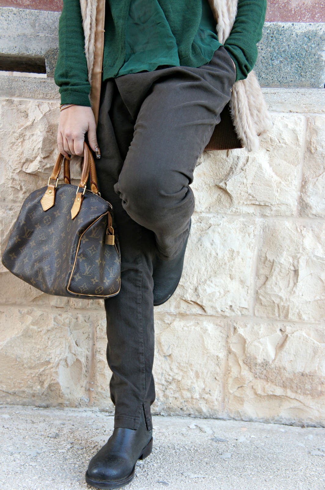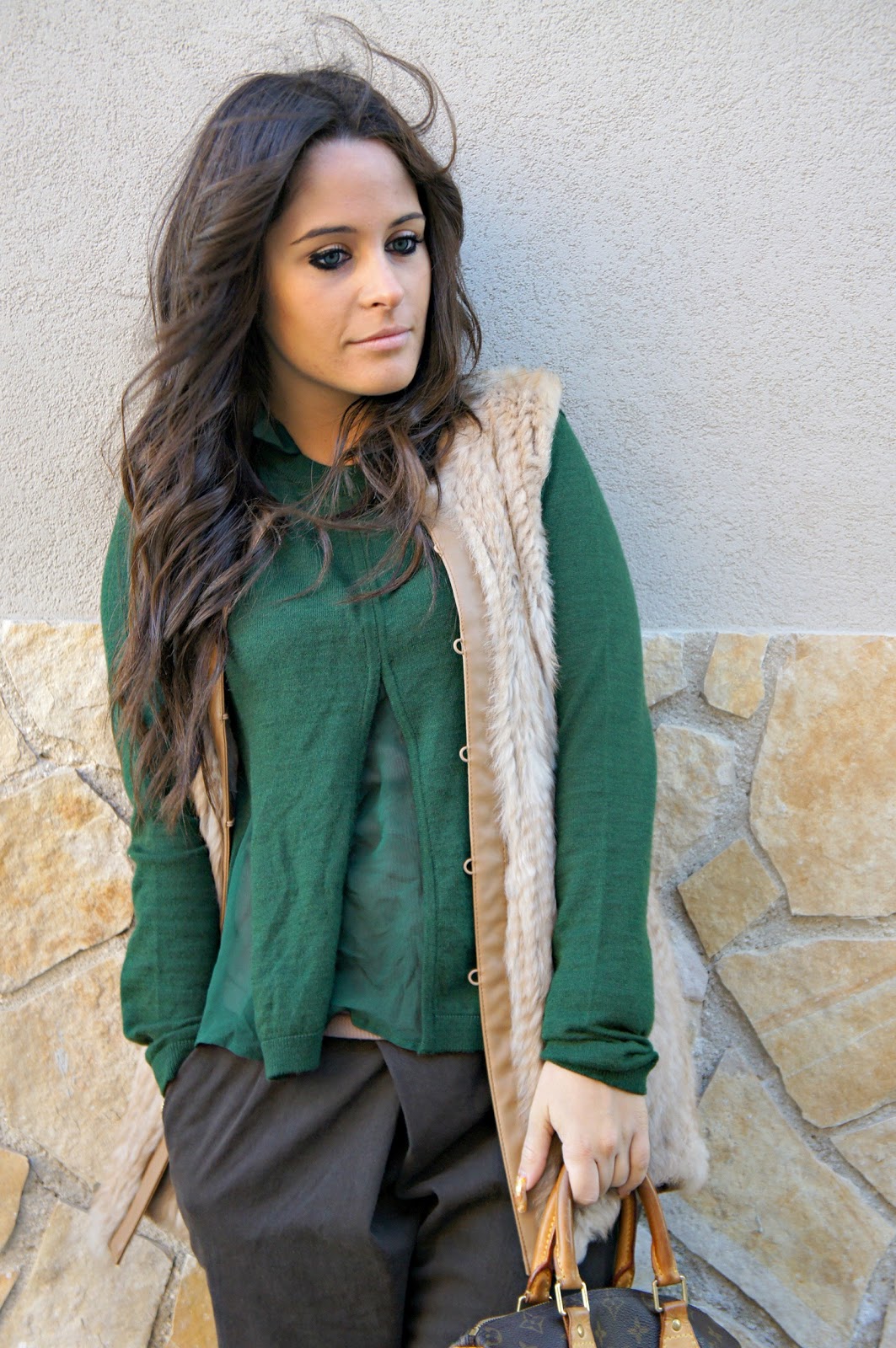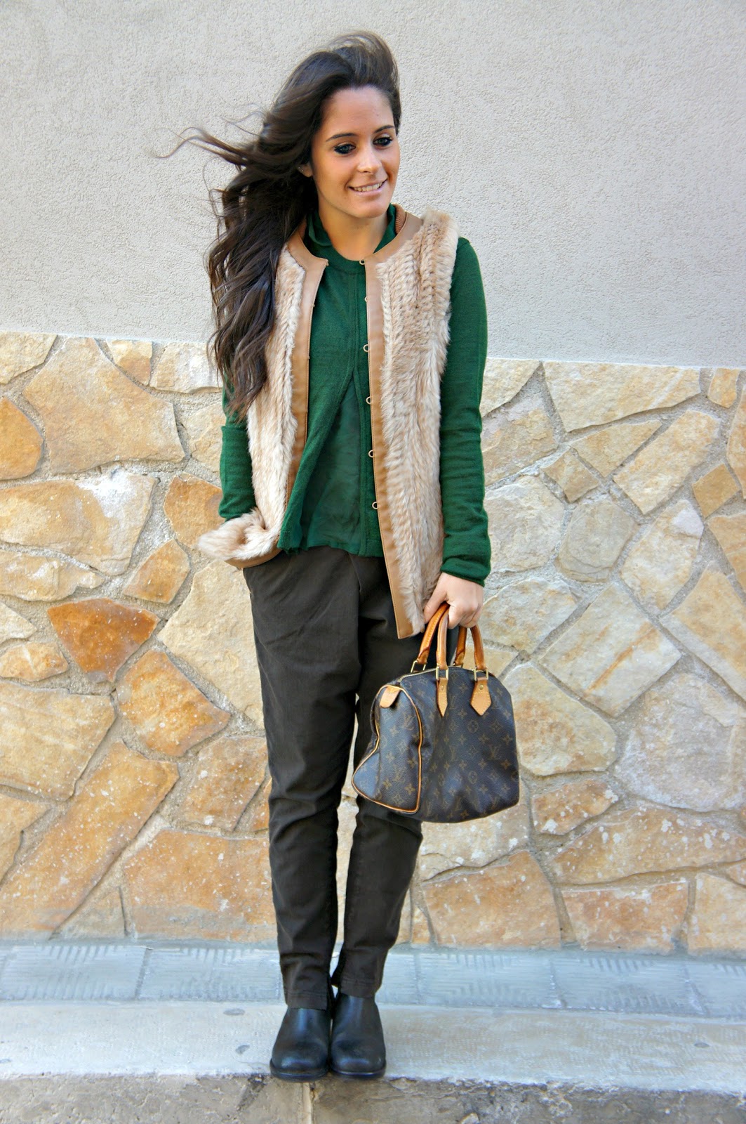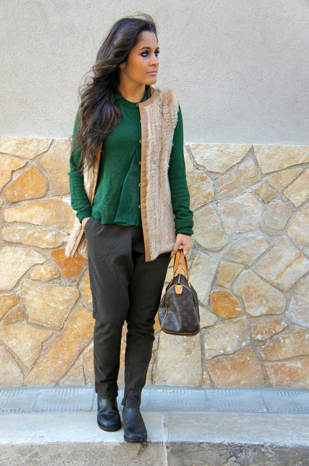 Hello fashionblogger or not, today’s post sees Annalisa returning to a style a little more sporty and casual: brown pants Manila Grace and sweater green, as you can see is not your typical sweater girogola, but has its own particular the neck and waist. Wearing a fur vest Pinko, to whom I am very fond of and which I believe to be a leader rather easy to match. I looked in the mirror, trying this boot Mister Wolf I saw that I was able to center the outfit I had in mind. It was windy that day, in fact once the hair fluttered in the photos here and there.