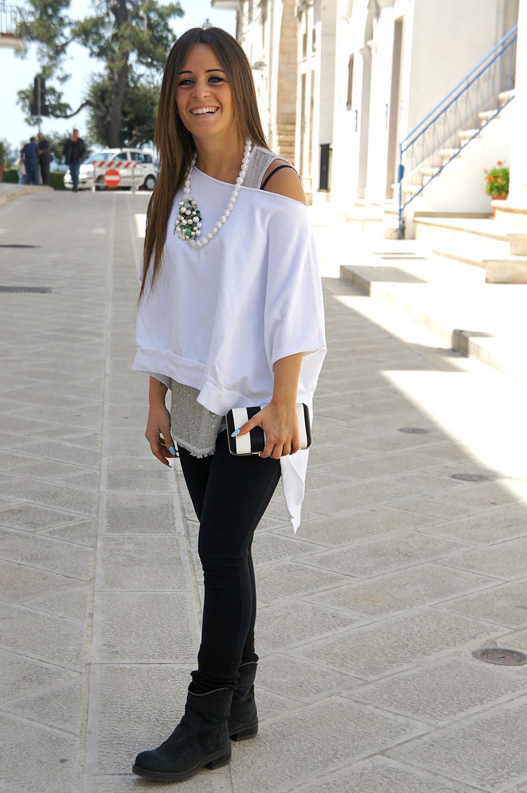 Here I am with a new post and a new look. What do you think of these photos? It does not seem to be in Heaven? I was surrounded by white: the houses, the streets, the walls, everything can be said. The photos were taken in one of the most beautiful places of Puglia, specifically in the town of Cisternino, (in case any of you decide to come). I wear today look easy, and once again black and white. The only glimmer of light is given by the color of the stones on the necklace, which I had never used until now. I hope you enjoy it.