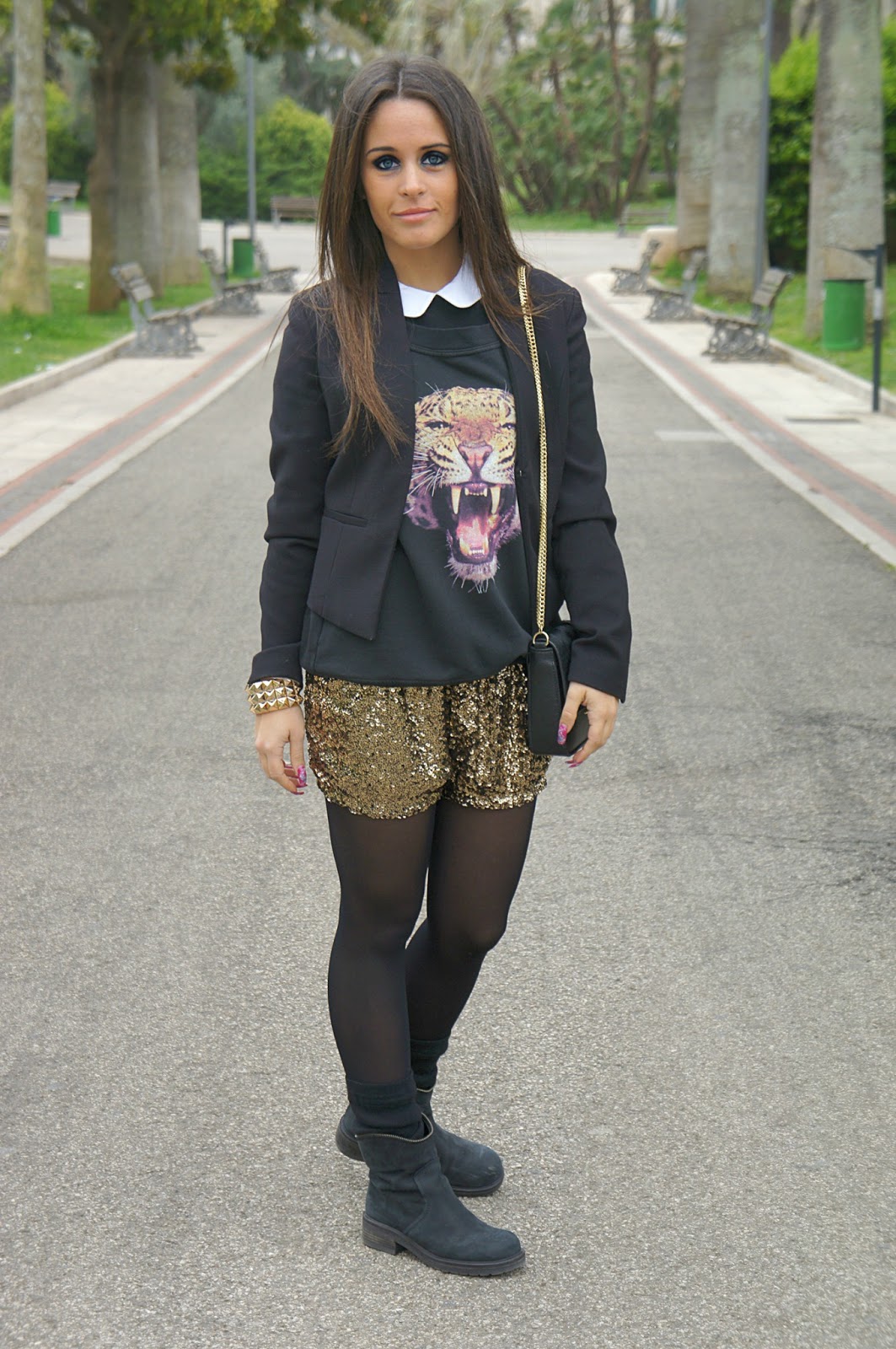 Good morning. Today is a beautiful day, the sun stands out and I’m in a good mood. In one of my last post I told you that I would have had different looks to show you, and then here’s another ready for you. Once again, an all-black, with accessories and gilded details and sparkly. How not to notice my sequinned shorts? Until today I had only worn in a ‘occasion, or Christmas Eve, but I was sorry to leave it in the closet because in a little while’ there will be an opportunity to be able to wear. Certainly, with the strap is the highlight of the whole outfit, because it can turn, enrich and give light, but I would not rule out even the plush tiger, definitely the coolest head. Those of you who have in their closet as a leader or simply with animal print? Now are a must have for us women and I personally heads so they would buy in large quantities. I wish you a good day waiting for your comments. A kiss!
