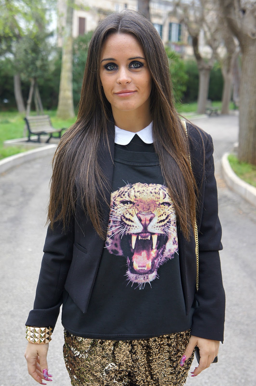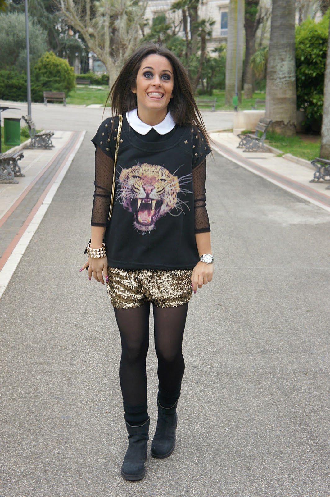 Eh si, come non notare il mio shorts paillettato? Fino ad oggi l’avevo indossato soltanto in un’ occasione, ovvero la vigilia di Natale, ma mi dispiaceva lasciarlo lì nell’armadio visto che fra un po’ non ci sarà più l’occasione per poterlo indossare. Senz’altro, insieme al bracciale è il pezzo forte dell’intero outfit, perchè in grado di accendere, di arricchire e donare luce…ma io non escluderei neanche la felpa tiger, decisamente il capo più cool. Chi di voi non ha nel proprio armadio un capo così o anche semplicemente con stampa animalier? Ormai sono un must have per noi donne ed io personalmente di pezzi così ne comprerei a bizzeffe. Vi auguro una buona giornata aspetto i vostri commenti. Un bacio!