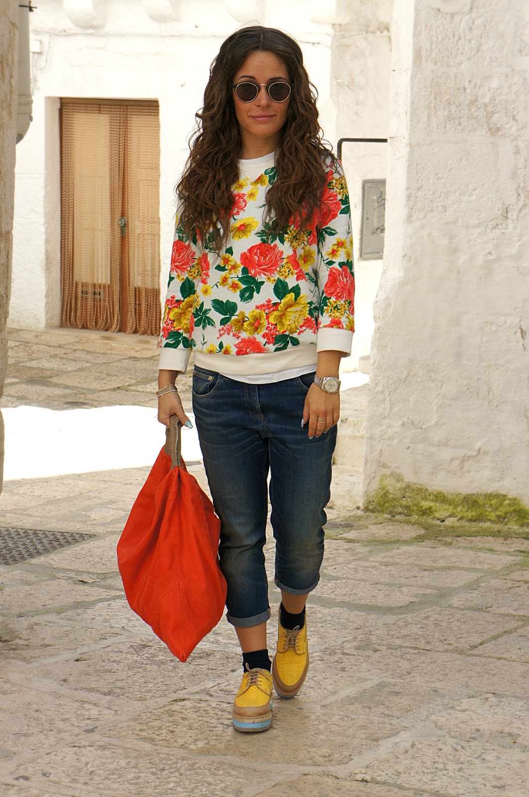 vi ricordate la giornata che ho trascorso a Milano due settimane fa? Ecco, lo indossai anche in giro per la città..Mi piace così tanto. Esprime tanta allegria, sarà sicuramente per l invasione di colori e per la luce delle foto così calda. Anche questo un look semplice, street ma ricercato nella scelta dei capi. Il maglione fiorato è senz’altro uno dei punti forti dell’intero look, acquistato da poco e disponibile in vari colori e modelli. La scelta del jeans non è un caso, ho scelto io di accostare un modello corto e morbido nella parte superiore, dando risalto alla scarpa! Fatemi sapere cosa ne pensate! Buon weekend !!