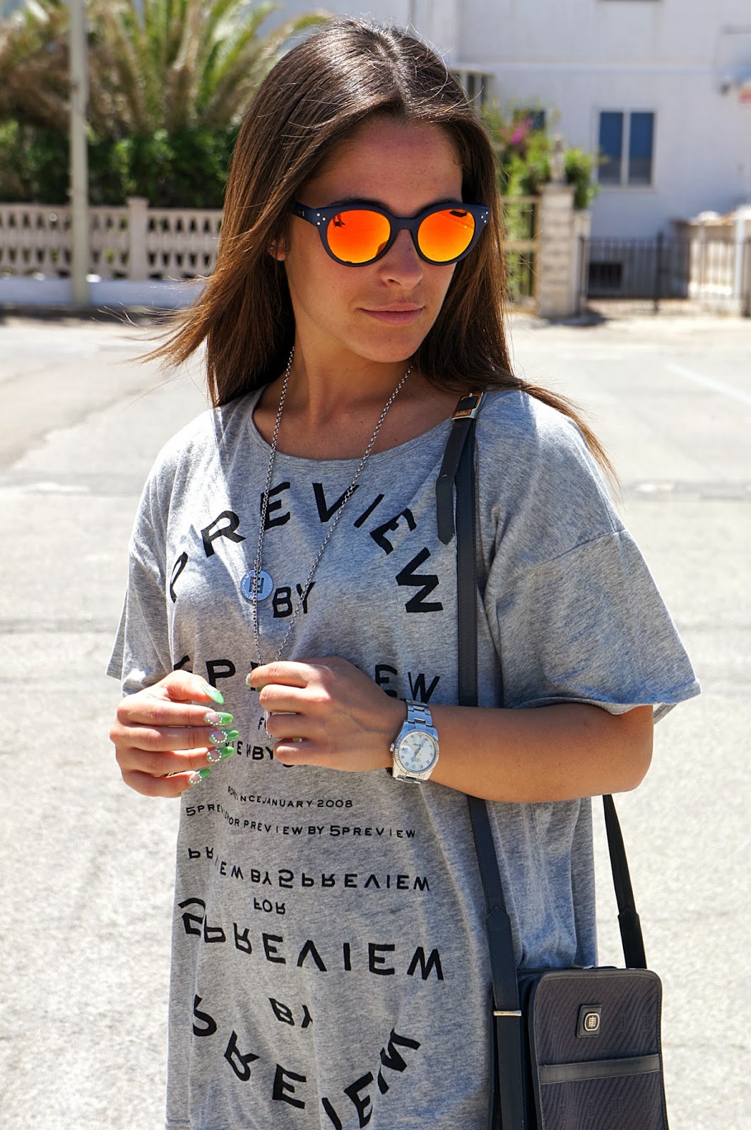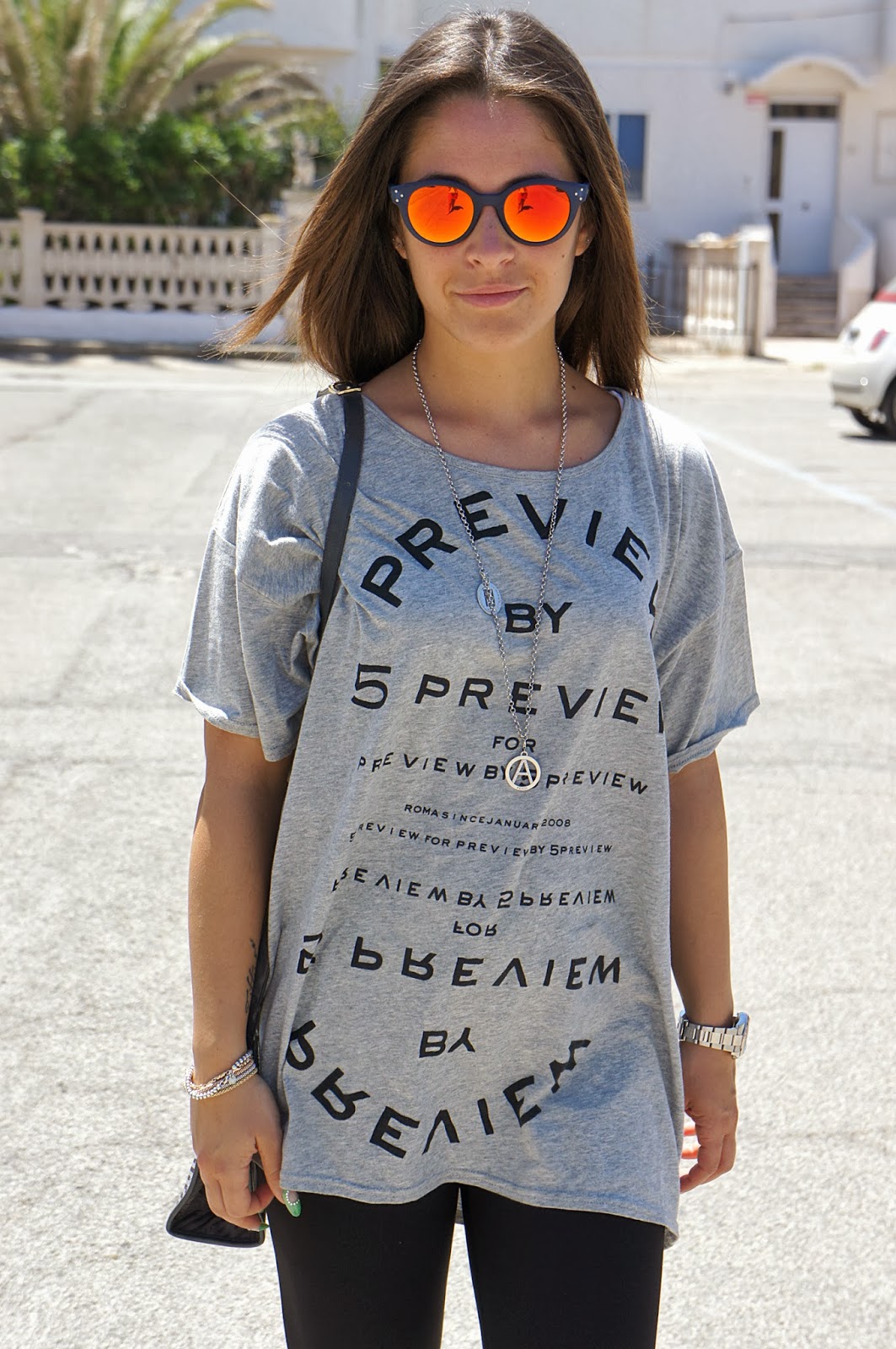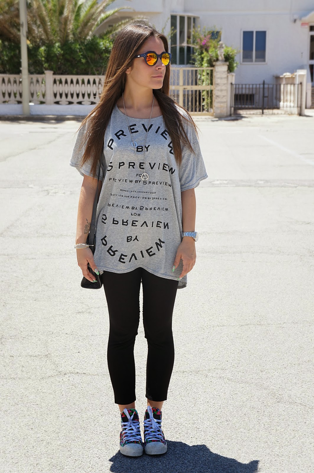 Hello readers. What a beautiful day. Here the heat is really oppressive and I oscillate between the sea and air conditioning. This my look goes back to a week ago and even more, even when the temperatures reached almost 33 degrees, in fact wearing leggings strictly blacks although pretty cool. Above I chose this maxi gray t-shirt and my eyes 5 Preview the inevitable Kyme, now become a must have. But now let me tell you of my beautiful shoes, I purchased here and are signed Gienchi! I love sneakers and as you may have seen in various posts I’ve truly many. I think they are comfortable and versatile enough to wear with a variety of looks. This struck me particularly because of their imagination so colorful and different from the usual.