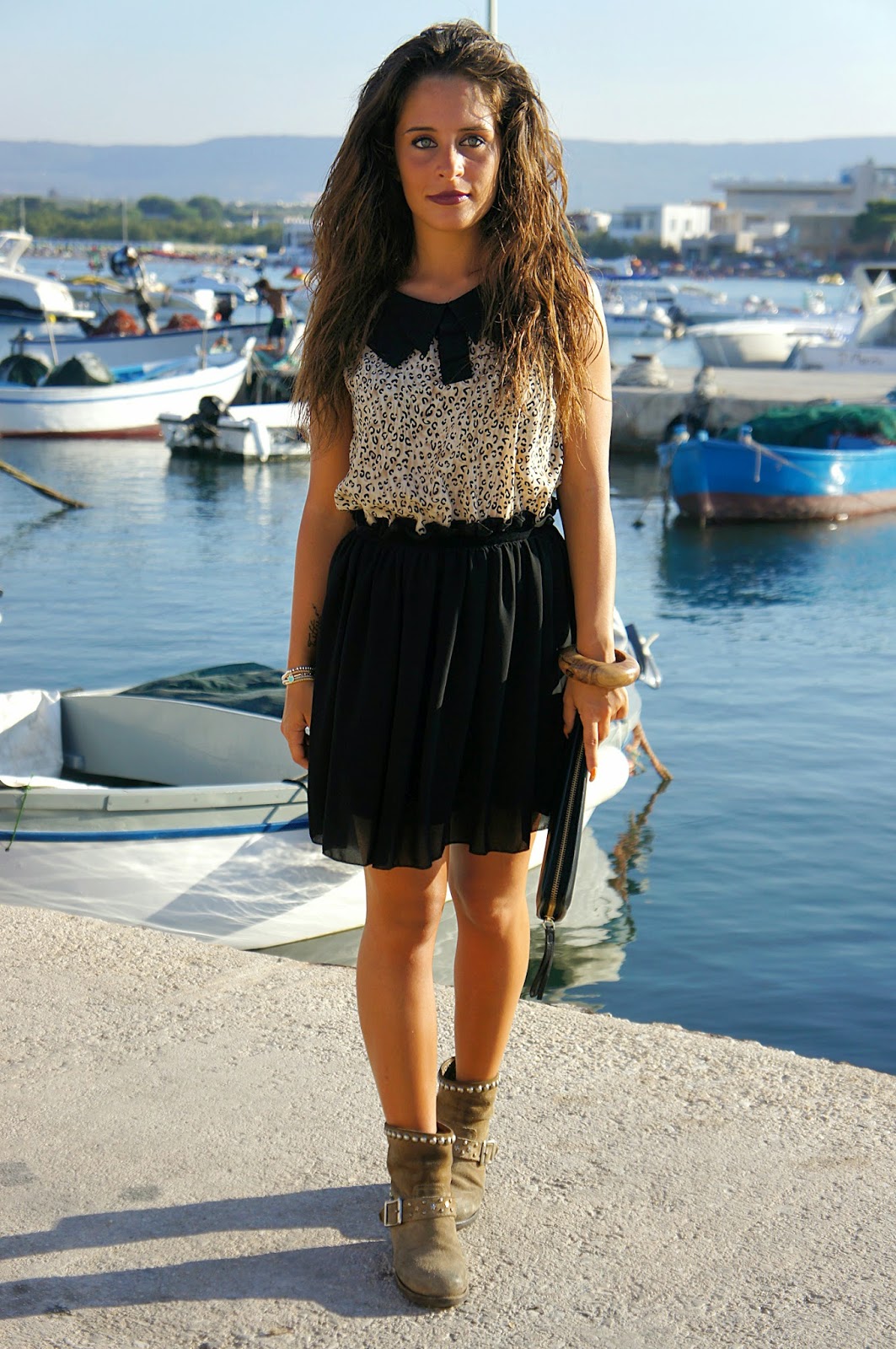 Per una come me che ama le scarpe più di qualsiasi altra cosa, non possono di certo mancare nell’armadio vari stivaletti di questo genere e di vari colori. Qui e Qui potrete vedere due dei miei ultimi look con indosso i biker boots. Questa volta a differenza degli altri due outfit in cui li ho indossati con un abito lungo e con un maxi dress over size, li ho abbinati ad un carinissimo vestito abbastanza ampio ma che segna il punto vita quel po’ che basta. A dare un tocco più aggressivo, ci hanno pensato i miei capelli da leonessa e il rossetto scuro scelto appositamente per la mise.