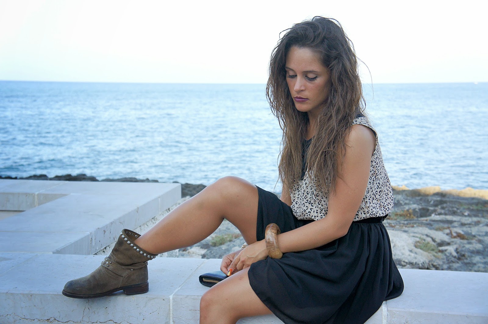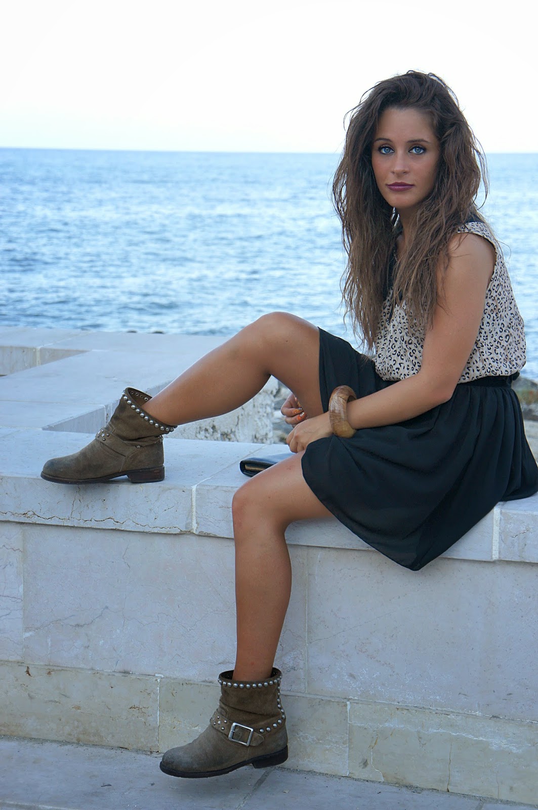 Good afternoon my readers. Here I am with a new outfit. As I often say, I love sports especially with sneakers dress, but I also like for sure that bikers now a bit ‘of years have become a must have for us women. For someone like me who loves shoes more than anything else, can not certainly miss many boots in the closet of this kind and of various colors. Here and Here you can see two of my last look wearing the biker boots. This time, unlike the other two outfits that I’ve worn with a long dress and a maxi dress over size, I have them paired with a cute outfit but broad enough that marks the life that bit ‘that’s it. To give a touch more aggressive, they thought my hair a lioness and dark lipstick chosen specifically for the outfit.