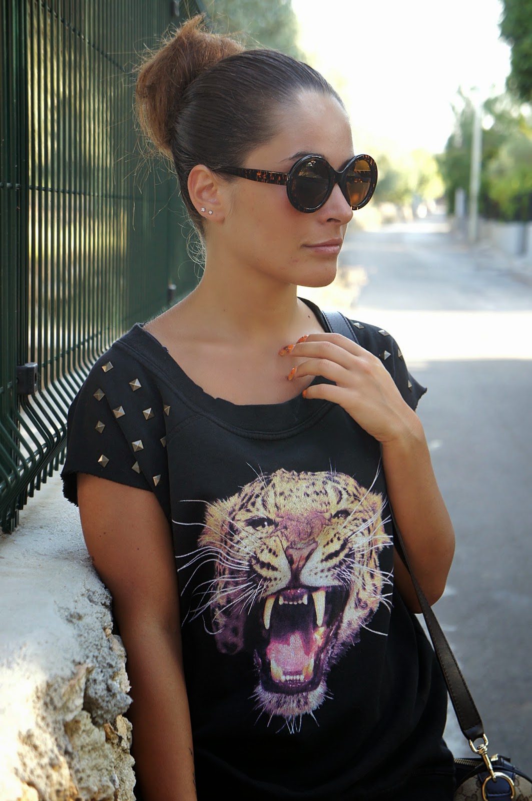 Honestly, I am so happy, because after weeks of scorching heat the air became unbreathable, and needed a change of climate, to ensure that the air rinfrescasse. As I have written in previous posts I have several look to show you, and now it’s up to this: an easy outfit to wear to the streets of the country. I wanted to show off my new red boots desired for months and purchased online at a price nothing short of extraordinary. I searched in several stores in my part, but my number was not available as usual. I love the color, pattern, and especially the application that we are on, and I have chosen to combine them to one of my favorite sweatshirts Tee-Trend with a huge tiger printed above. Mega hair in bun and glasses vintage Moschino received as a gift from my dad. Good Sunday to all.
