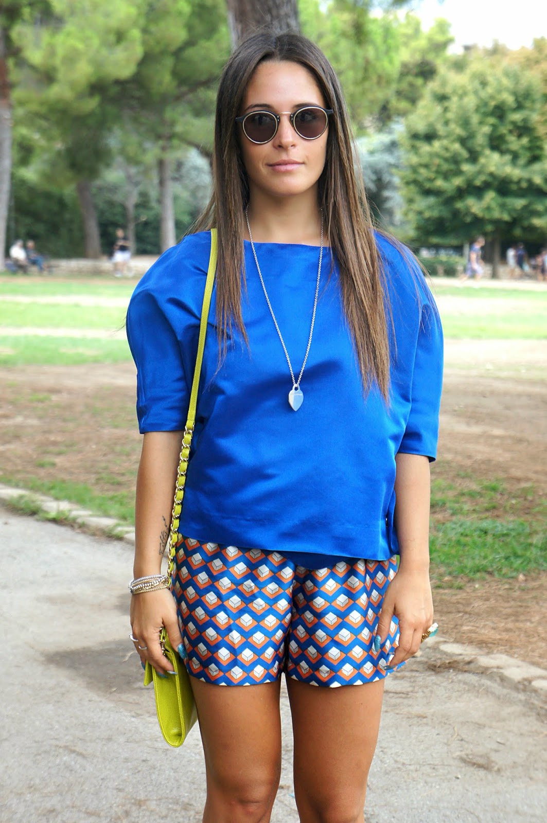 Here I am, in my nice cozy cottage to publish a new look. Honestly, it’s a bit ‘strange readjust after spending three months in another house and another climate … but fortunately I can not complain because even here is good (at least for now). These beautiful photos were taken in the park of Bari, a beautiful place that my region offers to all the guys who want to disconnect from the routine of everyday life and want to enjoy reading, study, or simply chat with friends or a long walk. Unfortunately distal quite a lot ‘of miles, because otherwise I would go more often. Of course I was there to do some shopping, because in the summer with 40 degrees Bari is not really the ideal place to live, and so I said to myself <why not take advantage of this coming to do some shooting with a look that enjoys particularly of my sympathy (ihihihih)?>. I wear this beautiful jacket electric blue capsules, combined with a brightly colored patterned shorts and a pair of wedges Giorgio Fabiani among other things very comfortable. I consider “appropriate” the combination of these two leaders, as the shades mixed together, give a sense of harmony. Inevitable YSL ring that I felt perfect for this type of outfit. I leave you to watch the rest of the post. A hug.