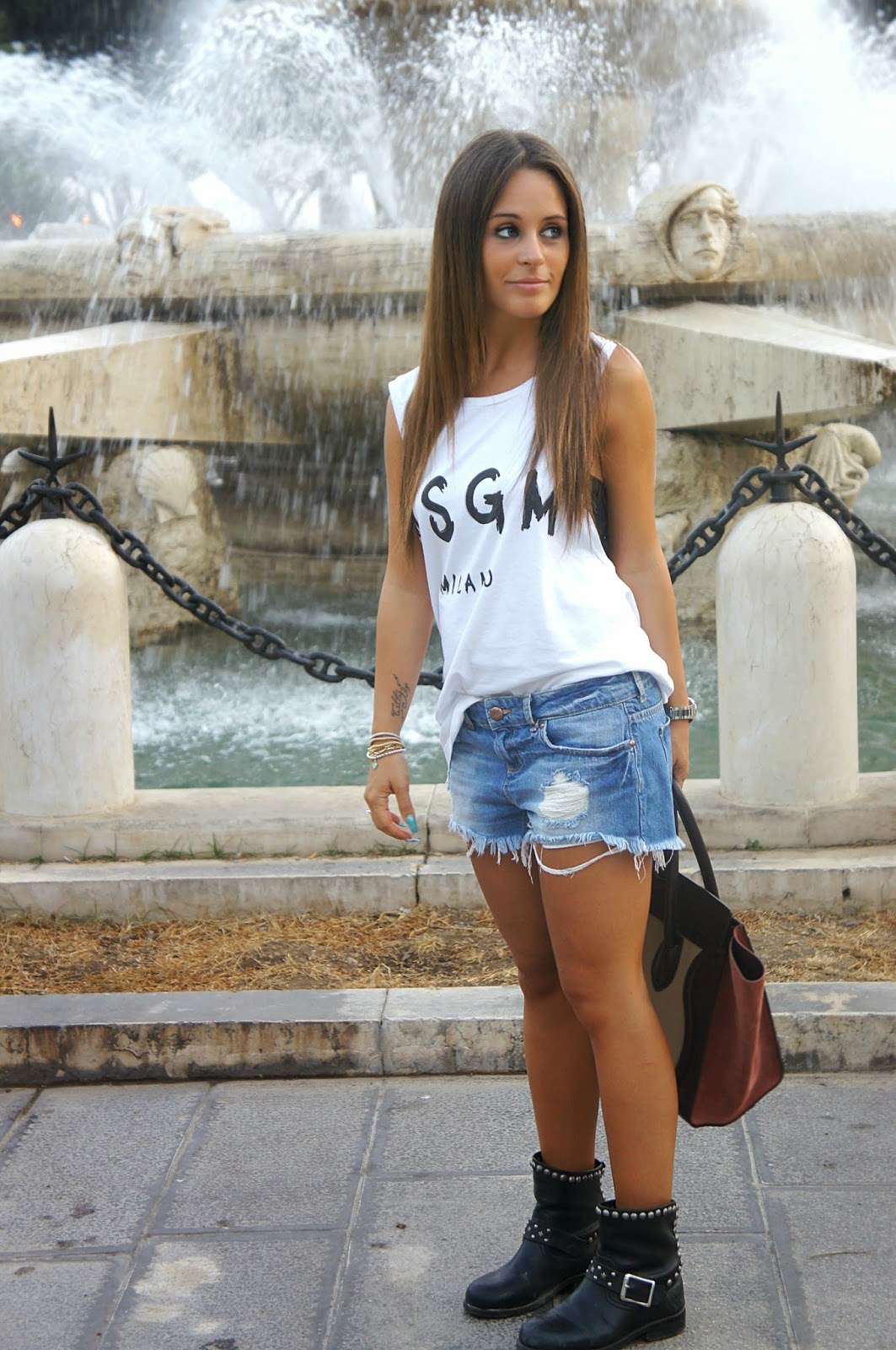 Good morning and welcome back to my blog. Today I am particularly happy to show you these pictures, not only for the look I’m wearing, but mainly because they were taken in Taranto, a city that I adore. The sea, the harbor, the long avenues full of great shops. My boyfriend often leads us, because he knows how much I like to walk along the streets and strange but true also really like him. I was there a week ago, and these are the pictures that you see right there. It took me a bit ‘of time before you choose the photos to be published because as you can see I’m not really sharp, but I can not complain, come on, he’s not used to it :-). I have done a hundred shots, but 80% were photos where I was laughing out loud with him. In an afternoon of shopping and relaxation I could not wear comfortable clothing but chic at the same time, so I opted for my vest and my inevitable MSGM demin shorts Bershka. I have to tell you a little secret … as well as being there because I love the city, I went there because I have a new super purchase in Serbia after my Celine, which I hope to do my very soon. I run away, now I will be in an inauguration of a tattoo shop, where he also will present a new collection of flash be.FLUO, which I can not wait to show you.