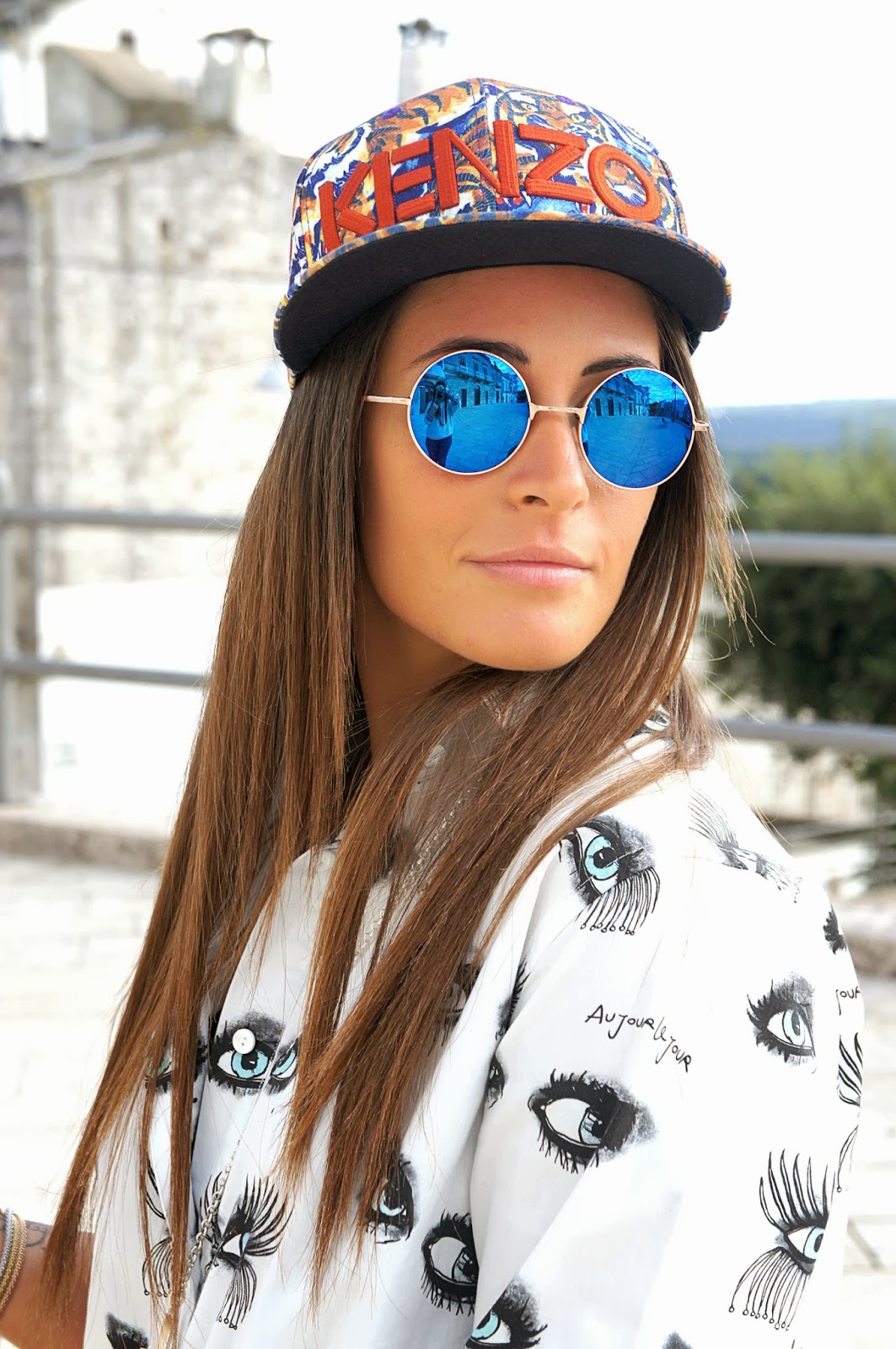 Ecco, il cappellino è l’unico modo di portare la tigre di Kenzo che apprezzo! Mi piace molto abbinato agli occhiali a specchio!