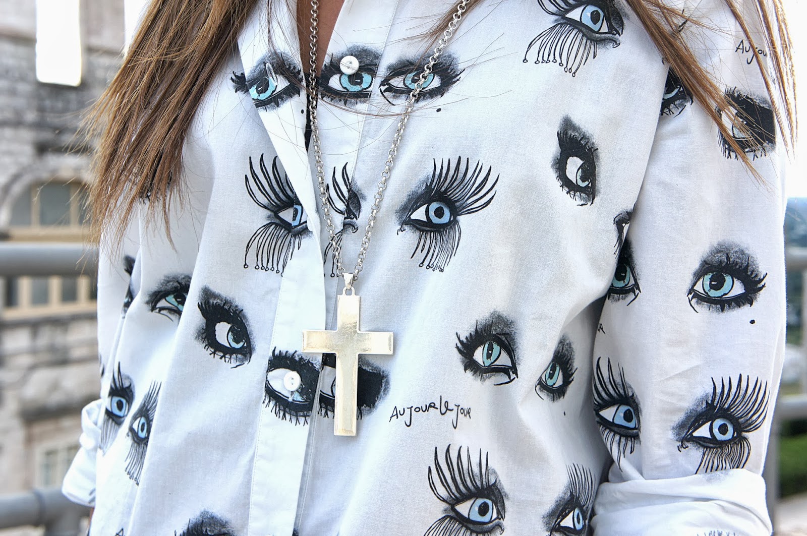 Oggi tocca a questo mio nuovo look. Non ci sono molte parole per descriverlo, io oserei quasi dire “al caso mio”, ma contemporaneamente ci sarebbe molto da dire, a partire dalla mia nuova camicia over size Au Jour Le Jour. Chi di voi conosce questo brand avrà visto la nuova collezione ricca di disegni uno più simpatico dell’altro: scimmiette, occhi, bocche, omini che sciano. A dir la verità sono attratta da ogni singolo modello. Questa camicia è stata l’ultima che ho adocchiato della collezione e il giorno dopo ero subito in boutique. Non bastandomi, ho anche ordinato la felpa con le bocche e spero mi arriverà in fretta.