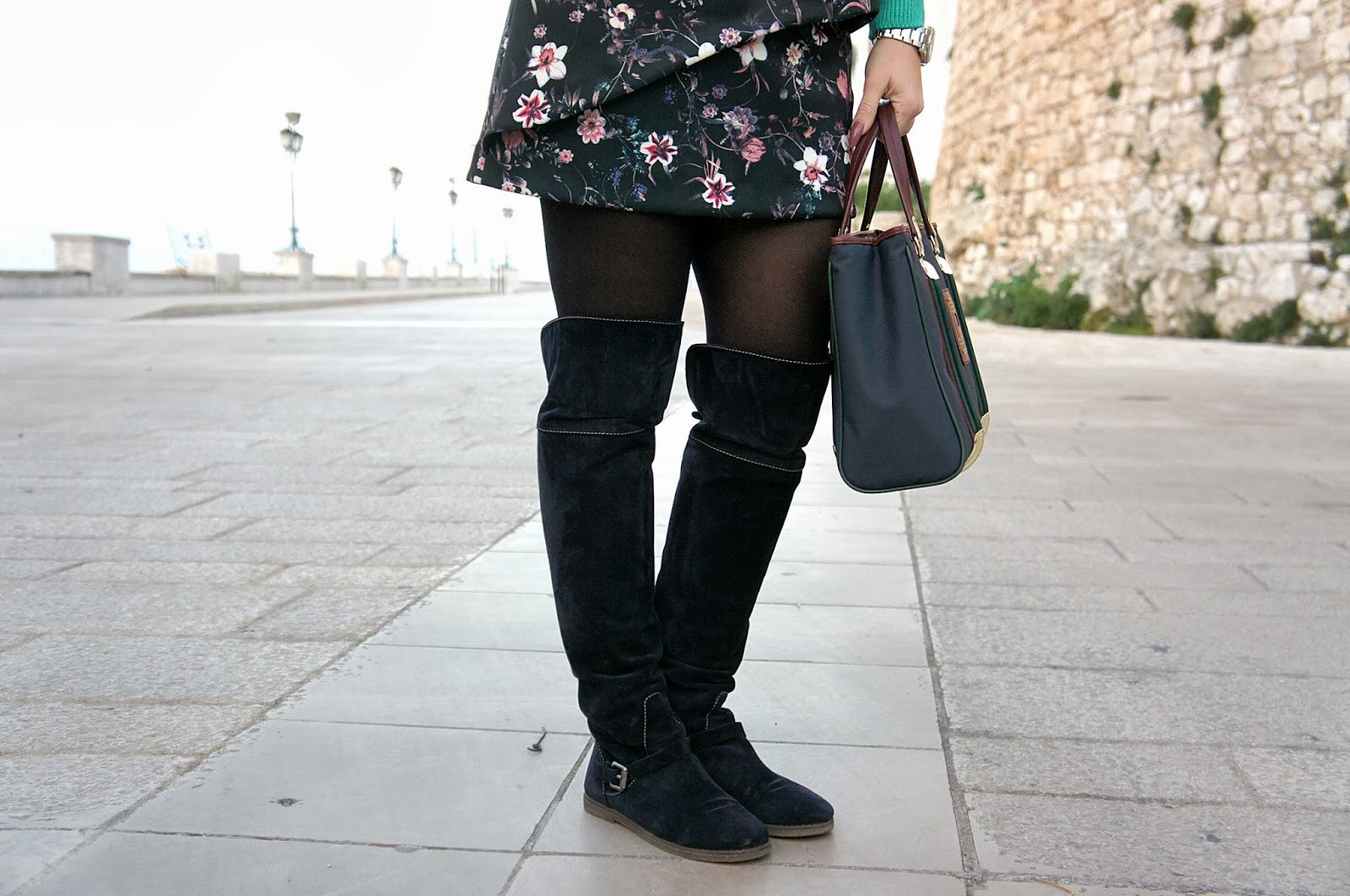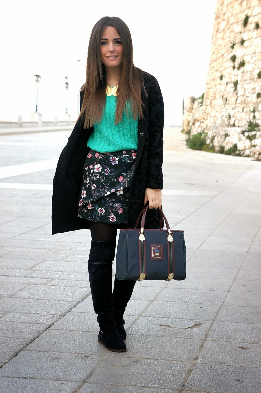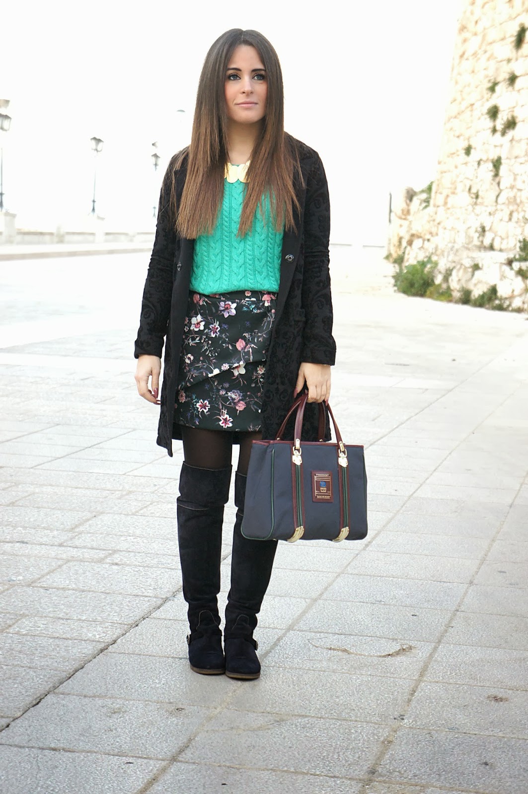 Ho tirato fuori dal mio armadio questi stivali che non indossavo da più di un anno ed ho scelto di abbinarli a questo look. Avete notato l’accostamento fra il blu ed il nero? Cosa ne pensate? A me piace davvero molto, d’altronde è uno degli abbinamenti più utilizzati per questa stagione. Ultimi ma non meno importanti sono il maglione H&M a otto e il cappottino Jijil damascato, più sofisticato ma reso casual dal suo abbinamento.