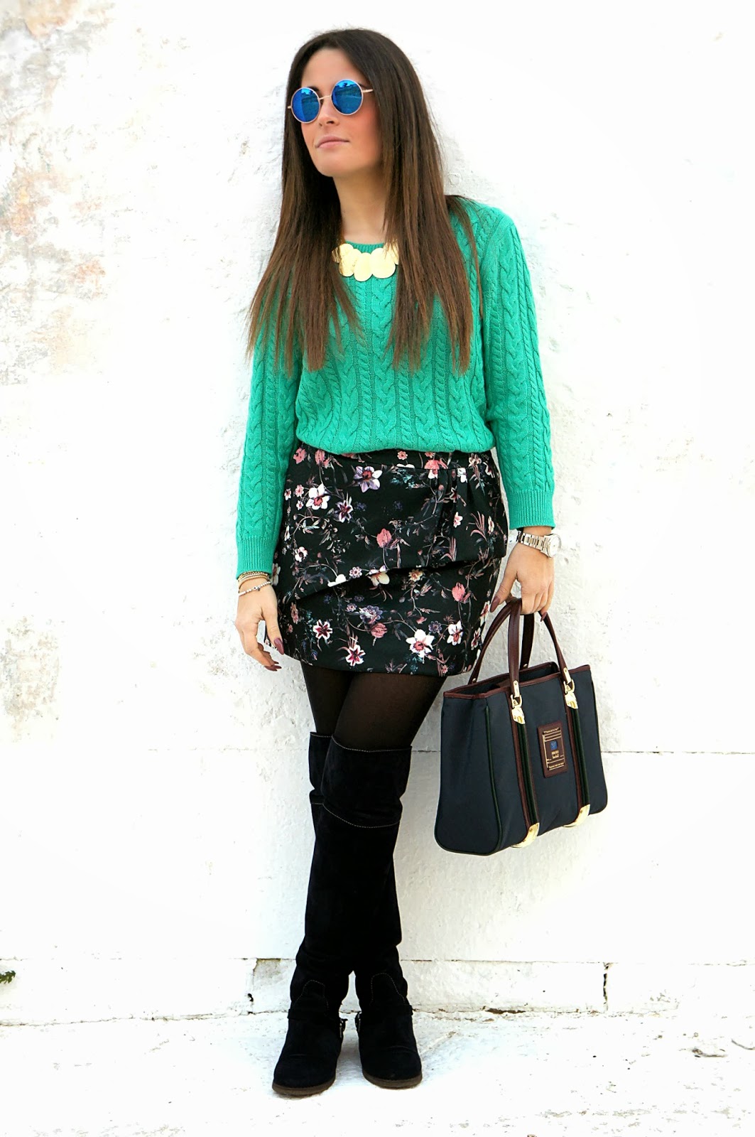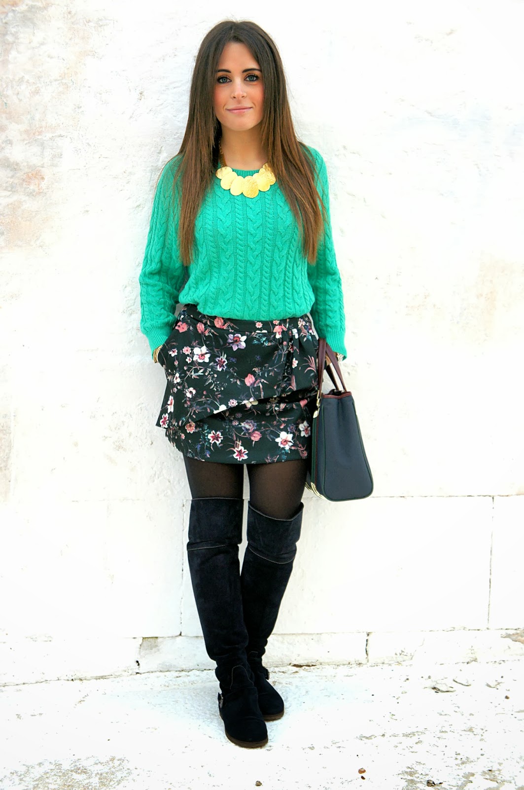Adoro il maglioncino color menta, e la gonna floreale è un tocco davvero speciale. Bellissimo look!