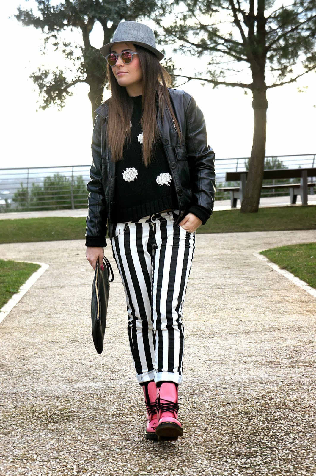 One trend seen in most of fashion show and in our boutiques this year is definitely the striped black and white. Pants, jackets, sweaters (see a look), shoes, and even bags (see a look), have this type of fantasy. Despite my paranoia, as in this case sometimes then I allow myself some exceptions, seen that it is seen that a pant of this kind tend to gain weight in two sizes. This model is second time that I wear it (see another look) but this time it’s a look very comfortable and chic at the same time, because along with the strong presence of the pants, there are also my Dr.Martens Smile adorable and my new hat. A look that I’ve used in a shopping day looking for some last-minute deal. What do you think?