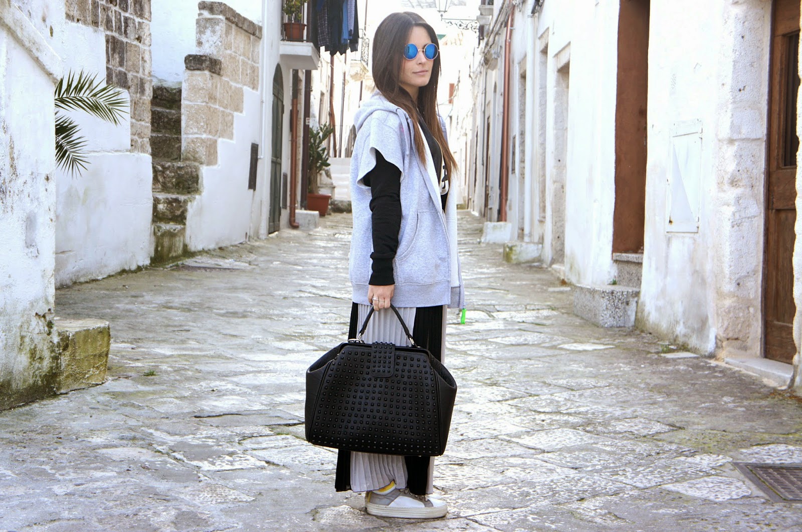 Return the Black & White in my looks after a whole week, almost a record for me :-). I’m back from you today and always with a convenient daily outfits, but at the same time chic and distinguished, in my opinion. Clothing “street” as the Lemarè sneakers, the be.FLUO maxi sweatshirt and b&w skirt, combined with materials such as silk shirt 5 Preview (see here). The Mivite skirt is actually a gift that I have done personally to my sister, but she so far has not yet worn, so I took the opportunity and here’s the result. I wanted to complete the whole outfit, putting my new Mia Bag (also worn here) and mirrored Chicnova sunglasses.