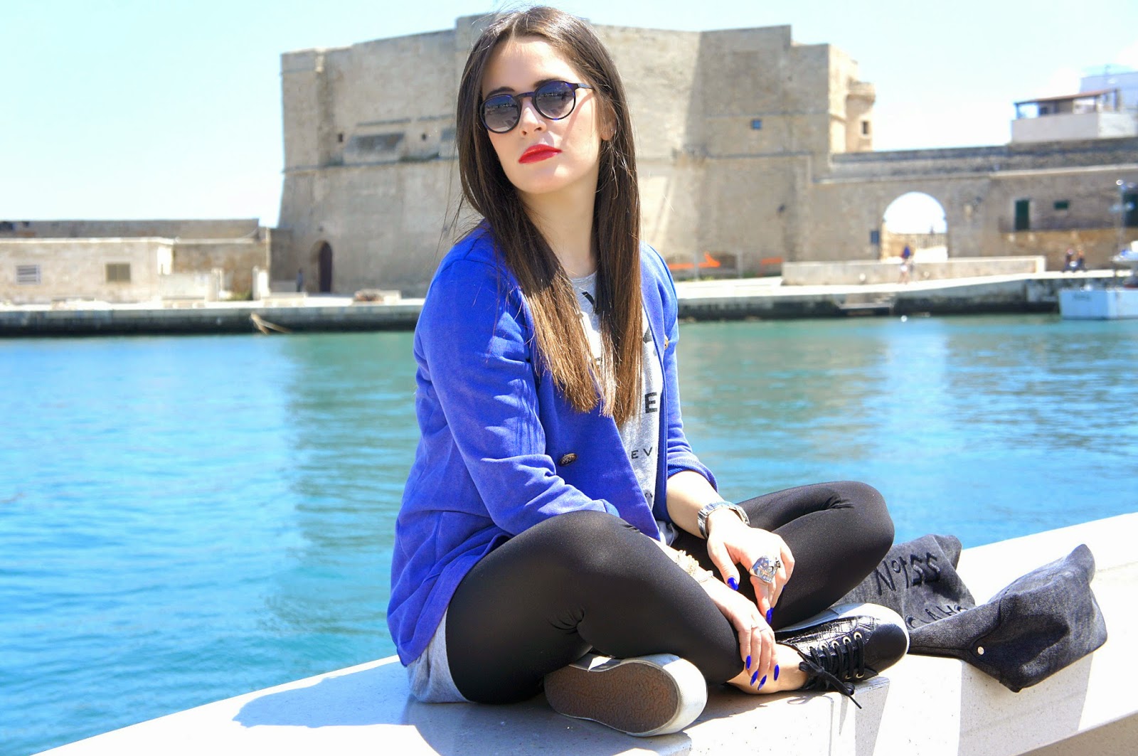 Dopo un paio di look in cui indossavo gonne lunghe e per di più entrambe nere, quest oggi ritorno con un look semplice e sopratutto pratico. Mi trovavo sul porto di Monopoli a passeggiare con Federica, la mia fedele accompagnatrice quando ci siamo accorte che sarebbe stata un ottima idea realizzare due scatti sia con il mare a farci da sfondo e sia con queste bellissime aiuole con meravigliosi fiori rossi. Come vi dicevo è un look molto semplice: un leggings nero Twin Set, una maxi tee e una giacca azzurra 5 Preview e le mie comodissime superga platform. Ho scelto inoltre di colorare le mie labbra con un bel rossetto rosso della linea Yves Rocher. Buona Domenica!!