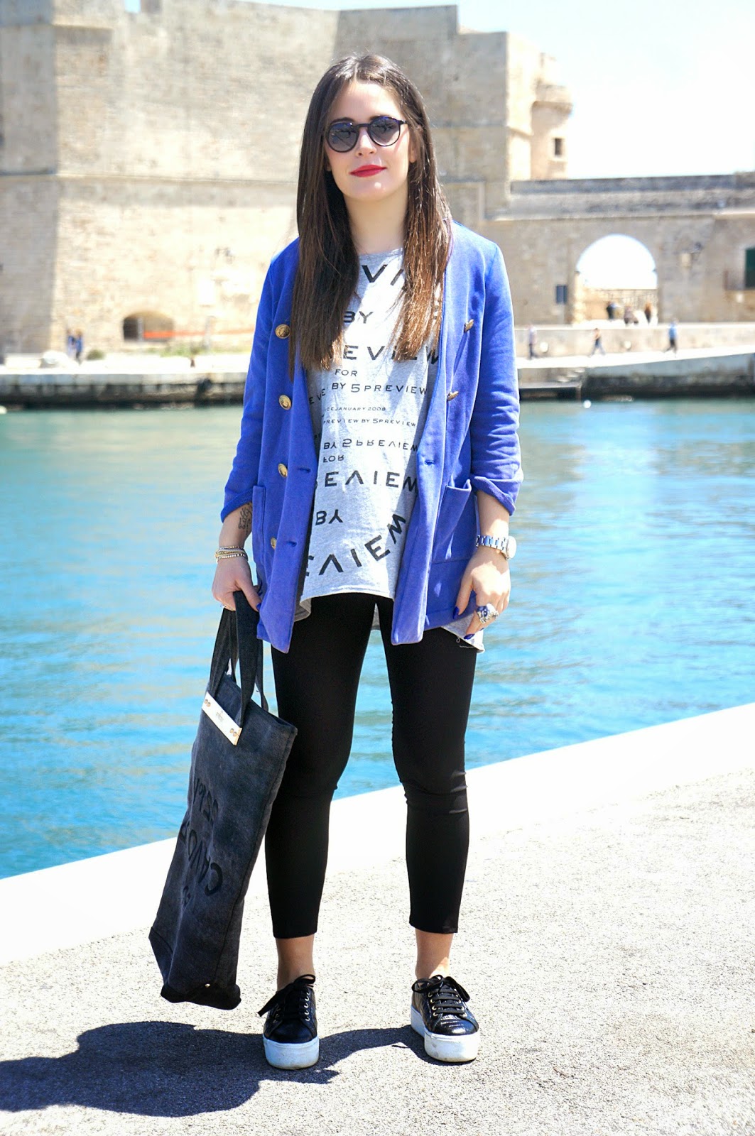 It is Sunday and many of you, on a day like this will be gone by the sea or at least to take a nice walk, while I’m busy with work that will keep me busy until late at night. After a couple of looks in which I wore long black skirts, return today with a simple look and above all practical. I was on the port of Monopoli to walk with Federica, my faithful companion, when we realized that it would be a good idea make two shots with the sea in the background and also with these beautiful flower beds with beautiful red flowers. As I said it is a very simple look: a Twin-Set black leggings, a maxi tee and a 5 Preview blue jacket and my cushy Superga platform. I also chose to paint my lips with a nice red lipstick Yves Rocher. Good Sunday!