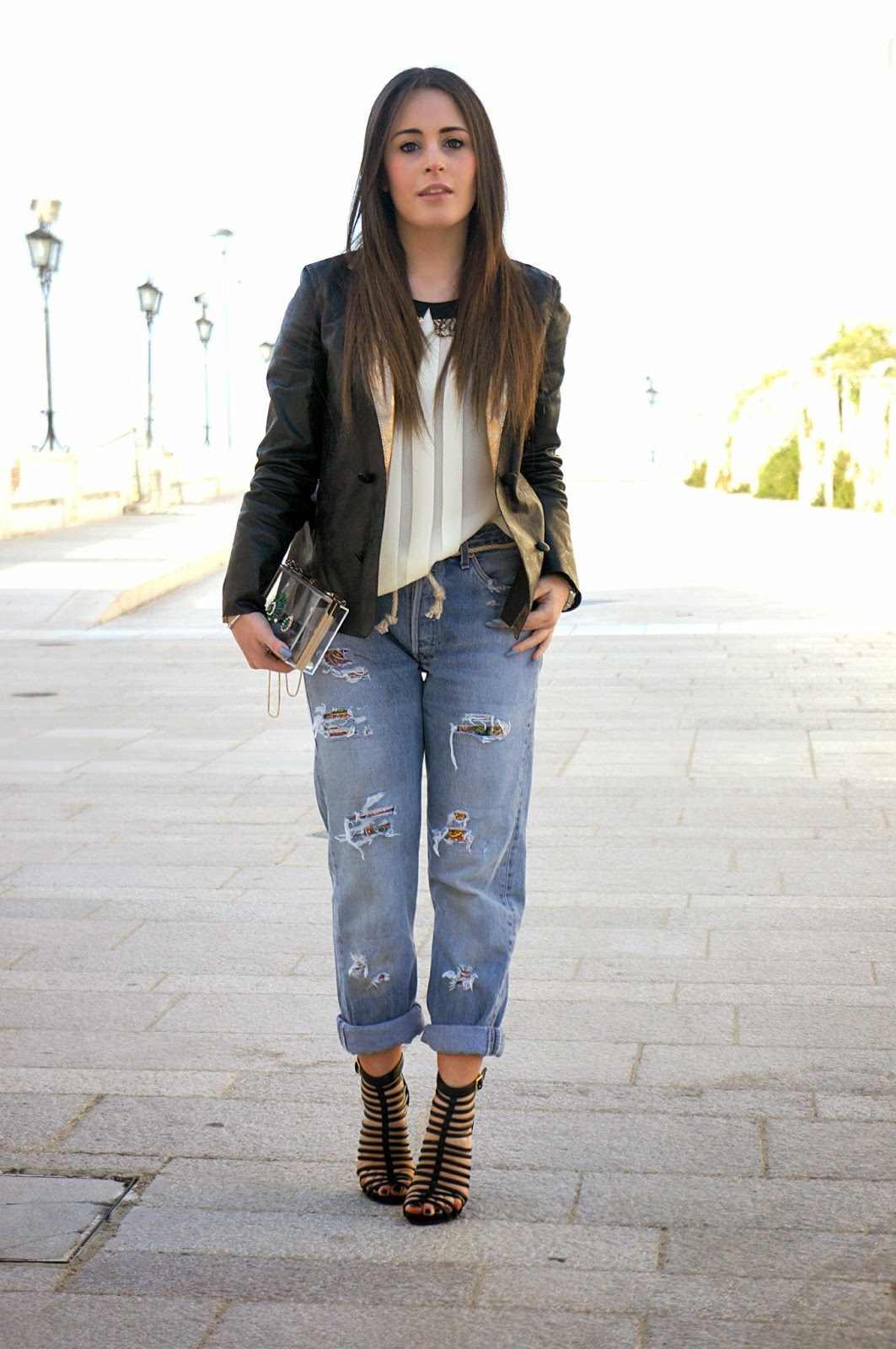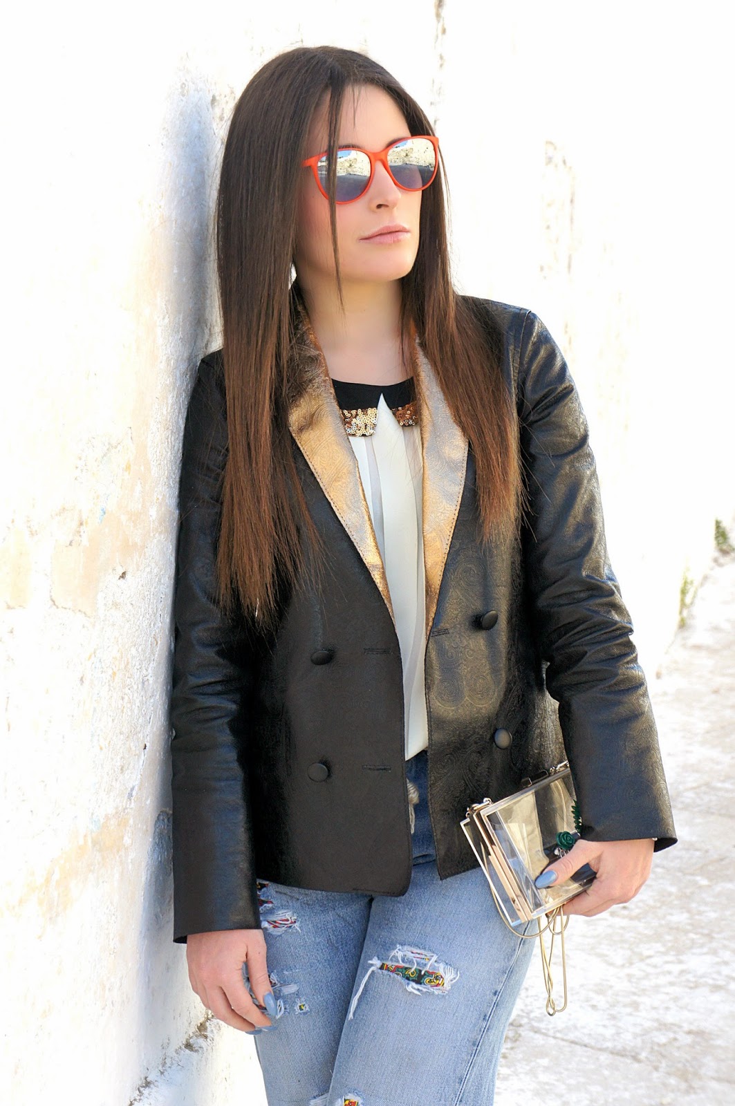 Today’s outfit, relies on shades like beige and black, but the effect of the Abpositive jacket that gives the idea of pearled, gives brightness and energy along with my new Steve Madden oxfords that they have almost broken a ankle (ihihih). But to make stand out this look, there are also my vintage Levi’s, the iconic model that if we had not thrown away so long ago, we’d have in our wardrobe and we would use… The last two gems of the look are the transparent clutch and Yell red sunglasses. I do not know if you noticed, but in the last 3 posts, I’ve worn only sunglasses of this brand. What do you think? Good day, a kiss.