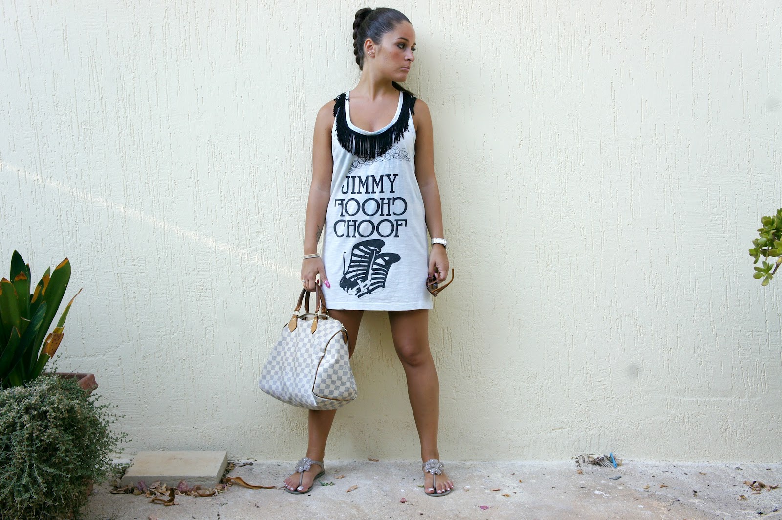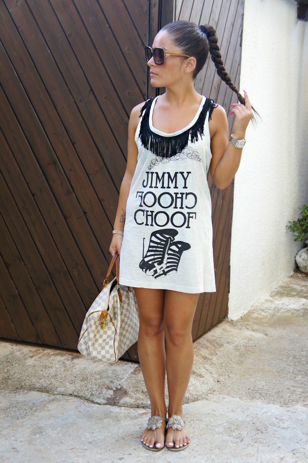 Non potete capire il caldo che fa qui…davvero insopportabile! Che ne pensate di questo look?? Maglia lunga a frange e sandali con strass…un outfit veloce…vi piace?