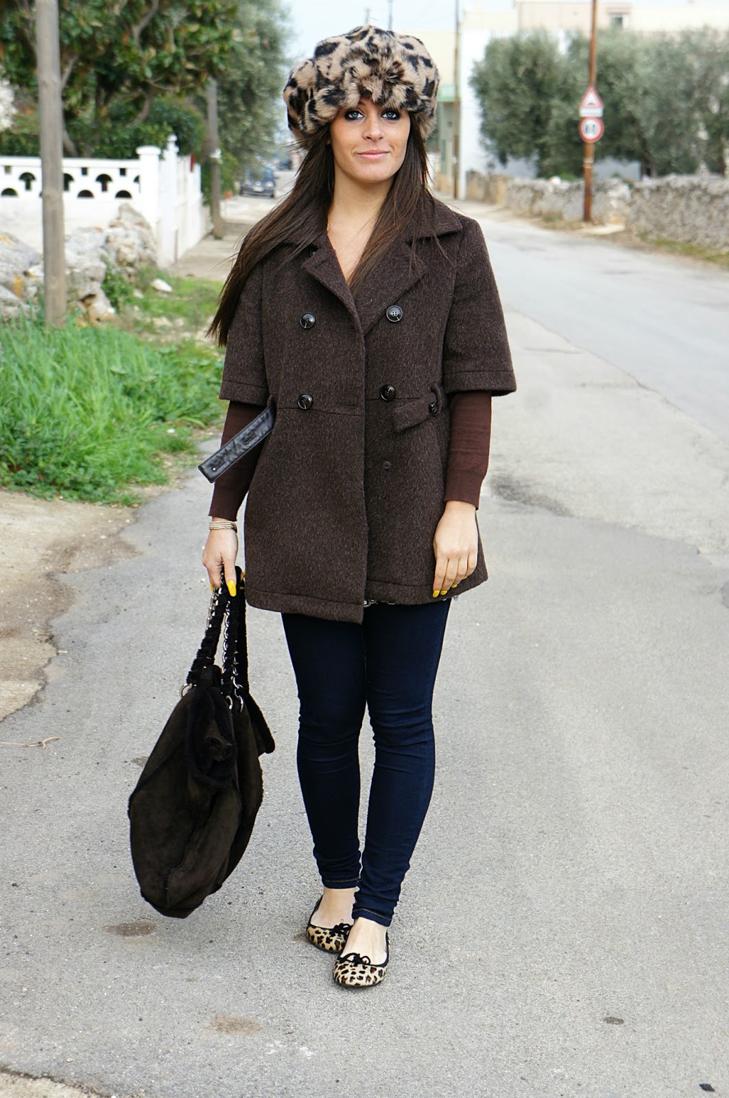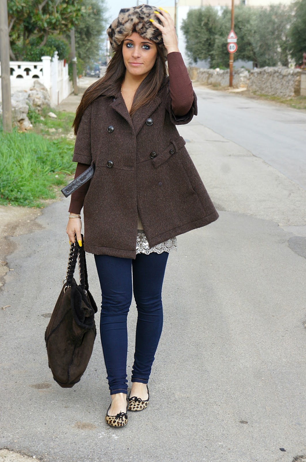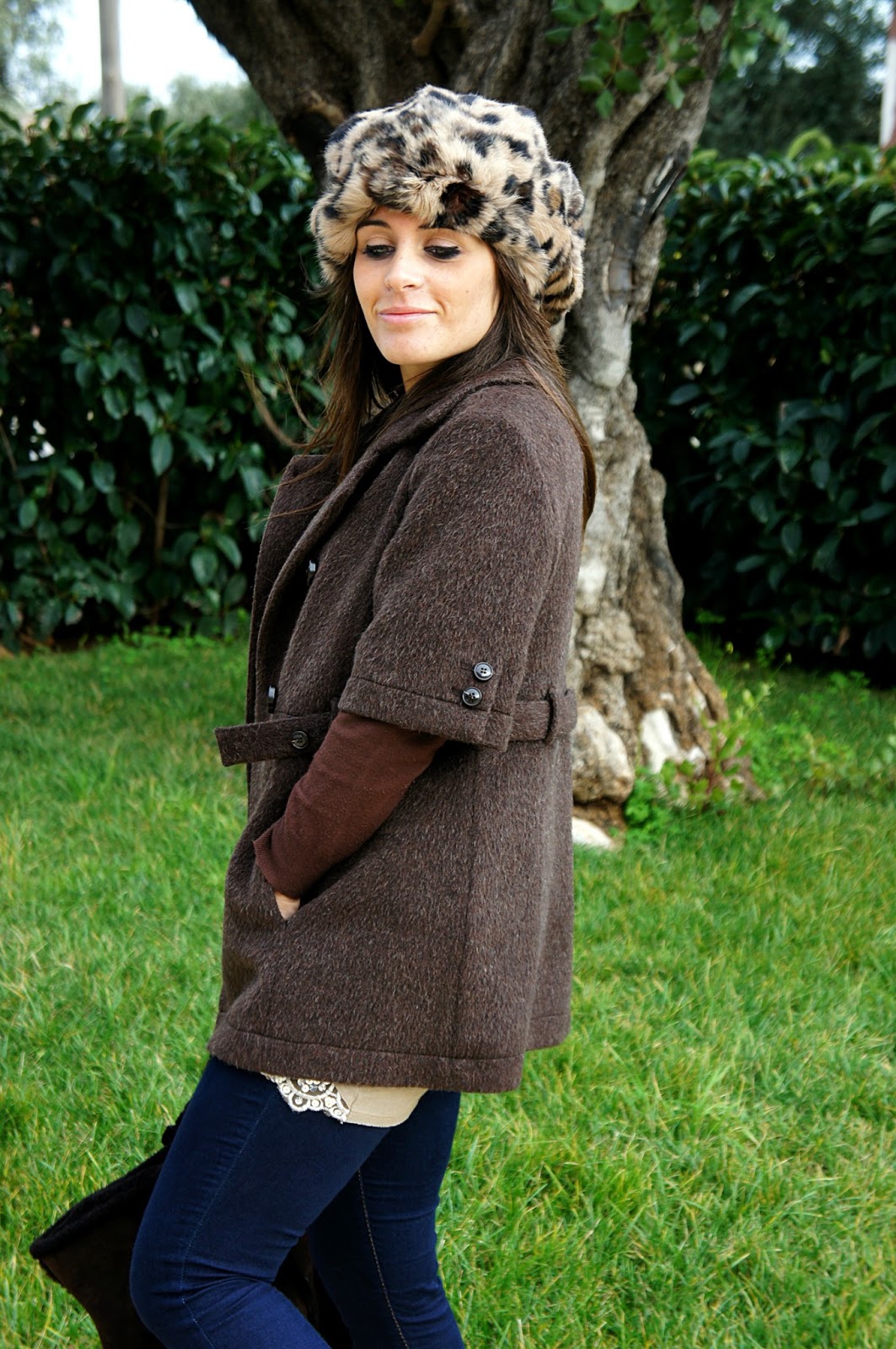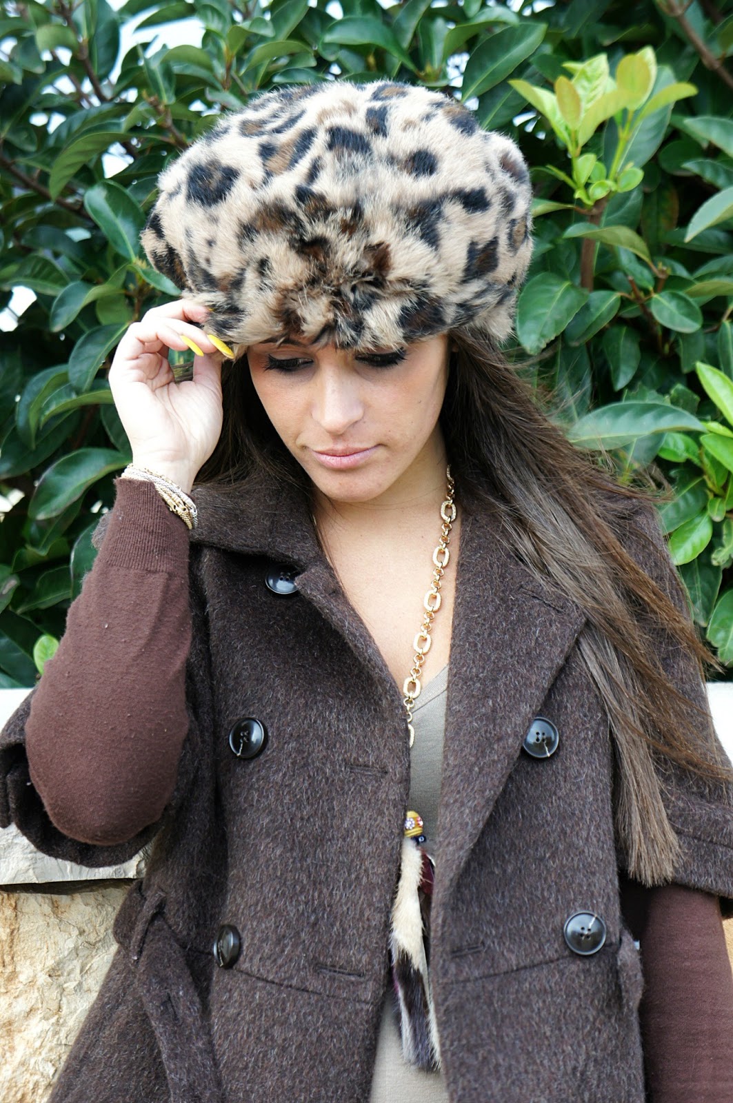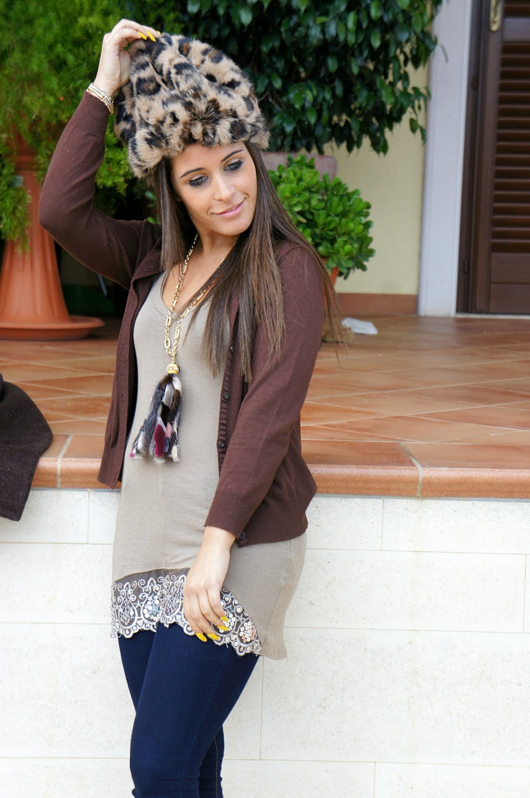 Come ben sappiamo, questi sono gli anni delle stampe animalier. La maggior parte di noi, nel proprio armadio possiede almeno un capo con questa fantasia, certo bella ma non semplice da abbinare, perchè si corre il rischio di eccedere. Personalmente mi è piaciuto questo coordinato scarpe e cappello, che pur essendo di due marchi diversi, si uniscono perfettamente. Ho avuto la giusta idea di rimanere sulle stesse tonalità, indossando un look semplice: leggings di jeans, canotta beige con paillettes e giacca marrone. La collana è l’unico accessorio che ho scelto per dare un tocco brillante di colore.