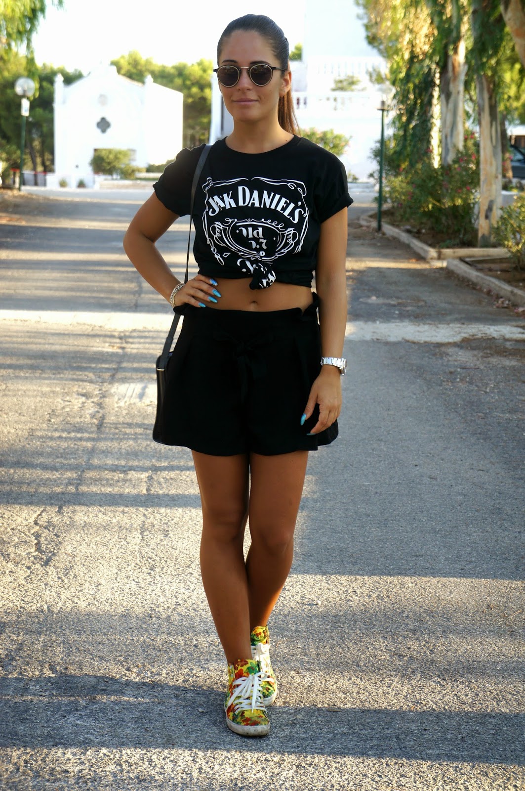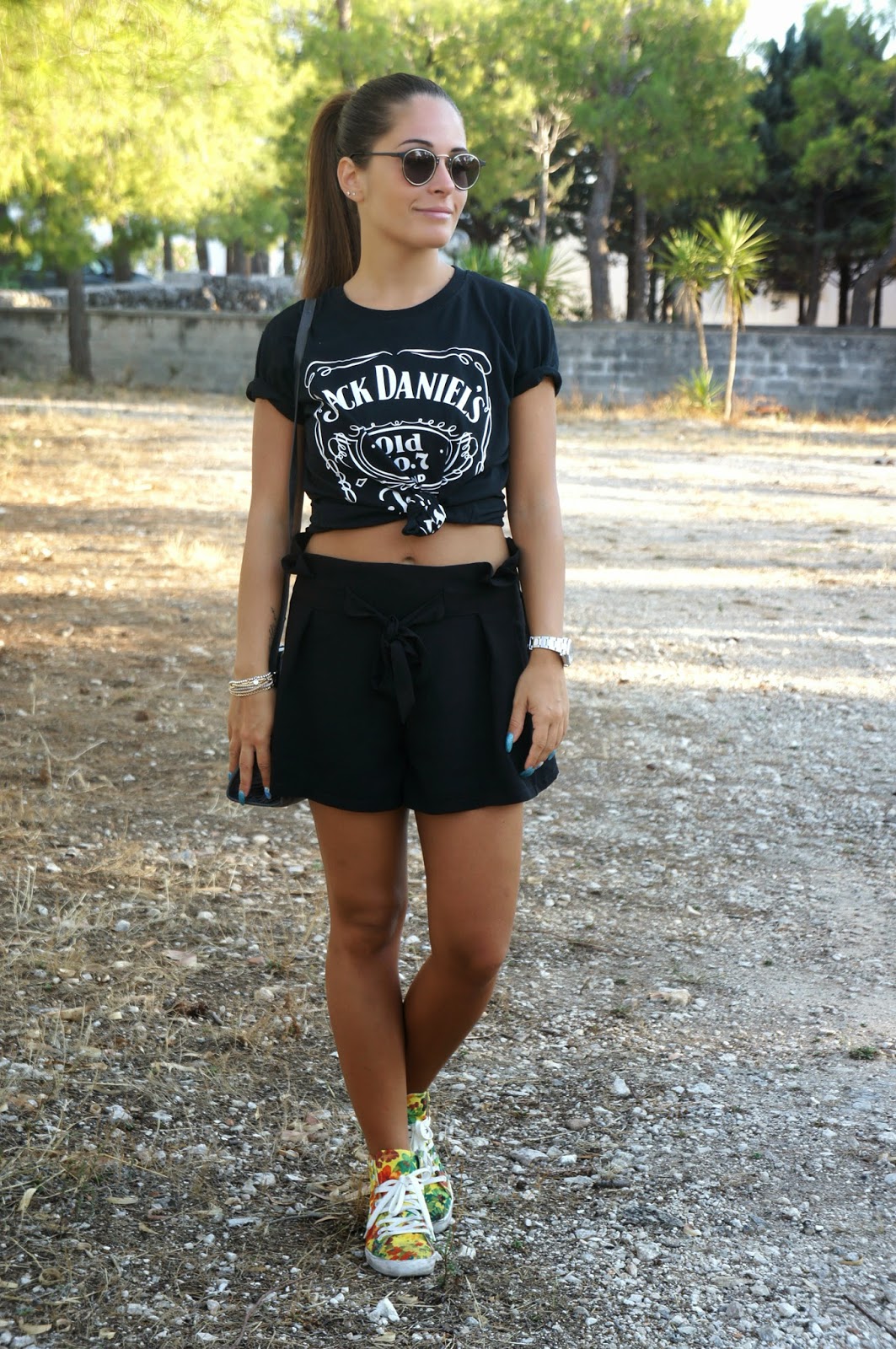Hello to all my readers. After a day off here I am with a new look ready to be published. This time, no color, but just a total black: with a slight mini shorts and t-shirts Jack Daniels purchased online HERE last month, and knotted at the waist. This is the ‘year of the bared belly and I love to wear short clothes and dare why not put it on display. You know I had this “passion” since I was a child, and now that we have returned to the style a bit ’90 years (at least in this case) take the opportunity to discover it too. The only splash of color is given by the flowery Keep Originals sneakers, which in my opinion are a perfect match with the rest of the outfit and I felt ideal to combat it. The location where the photos were taken, it is a beautiful place here in my part. I’m so impressed that I made several shots in different days. To enrich the rest of the look, there is only one piece vintage, but two, as the shoulder strap Emilio Pucci and Blumarine glasses. I love the vintage, the thing that I find it easier to find are certainly some glasses and bag, while for the clothing research is becoming increasingly difficult and every time you look for a new challenge.