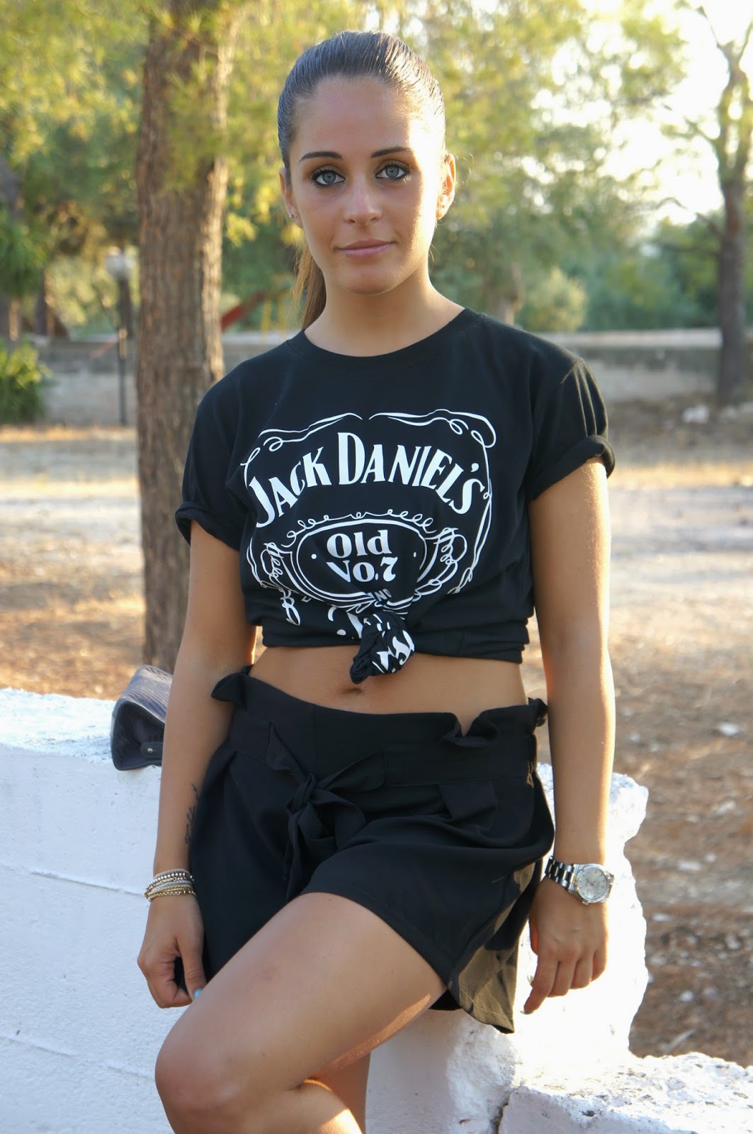 Salve a tutti miei lettori. Dopo un giorno di pausa eccomi con un nuovo look pronto per essere pubblicato. Questa volta niente colore, ma semplicemente un total black: con un leggero mini shorts a gonnellino e t-shirt Jack Daniels acquistata online QUI il mese scorso, e annodata in vita.