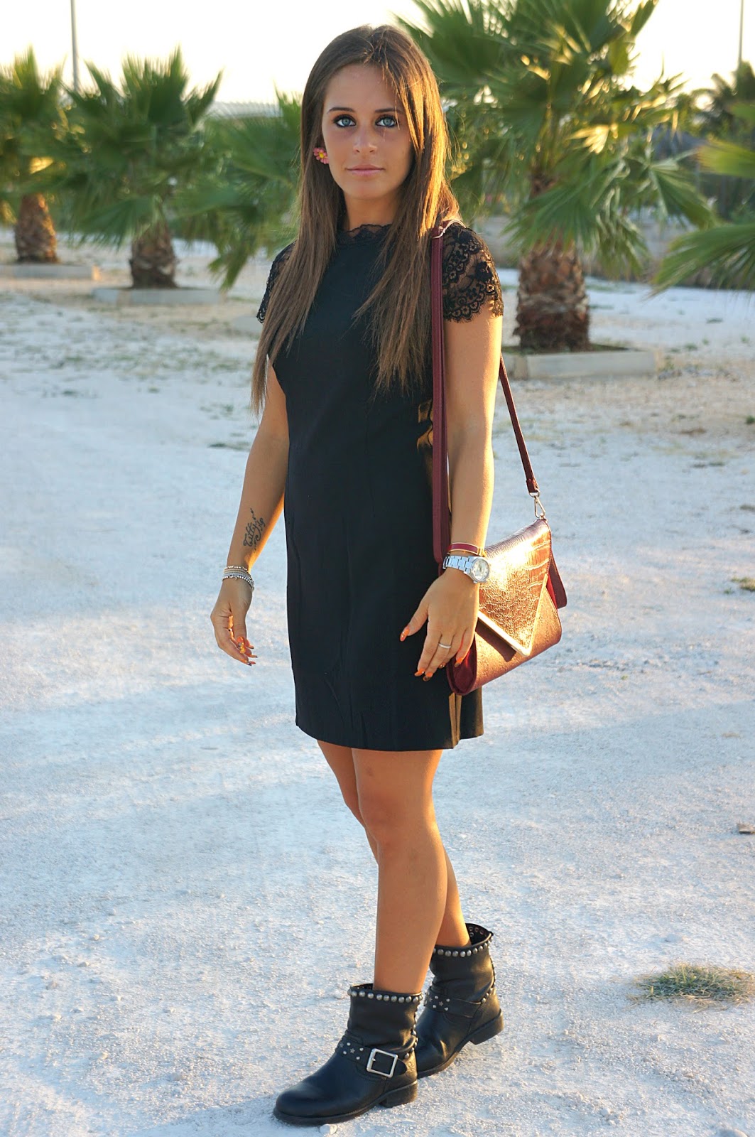 Good morning and welcome back my readers on my blog. Once again and for two posts in a row, a “total black”. Two looks, both represented by a little black dress and a clutch arm, but with obvious differences in styles. In the previous post to catch the eye are certainly the Jimmy Choo covered with glitter and also suitable for a ceremony or evening for some more “in”, while in ‘outfits today there is a piece that stand out in particular. Let’s say I wanted to enrich abbinandoci colorful accessories, such as the clutch burgundy, Hermes bracelet and my new earrings flowers Radà. In May last year (those of you who have followed me will know definitely) I spent two wonderful days as a “fashion blogger” for City Fashion Modugno and at the end of each evening, finished my task, I took the opportunity to choose something for me and the sheath you see today comes from there. Here is the link of the post made at the end of this wonderful experience.
