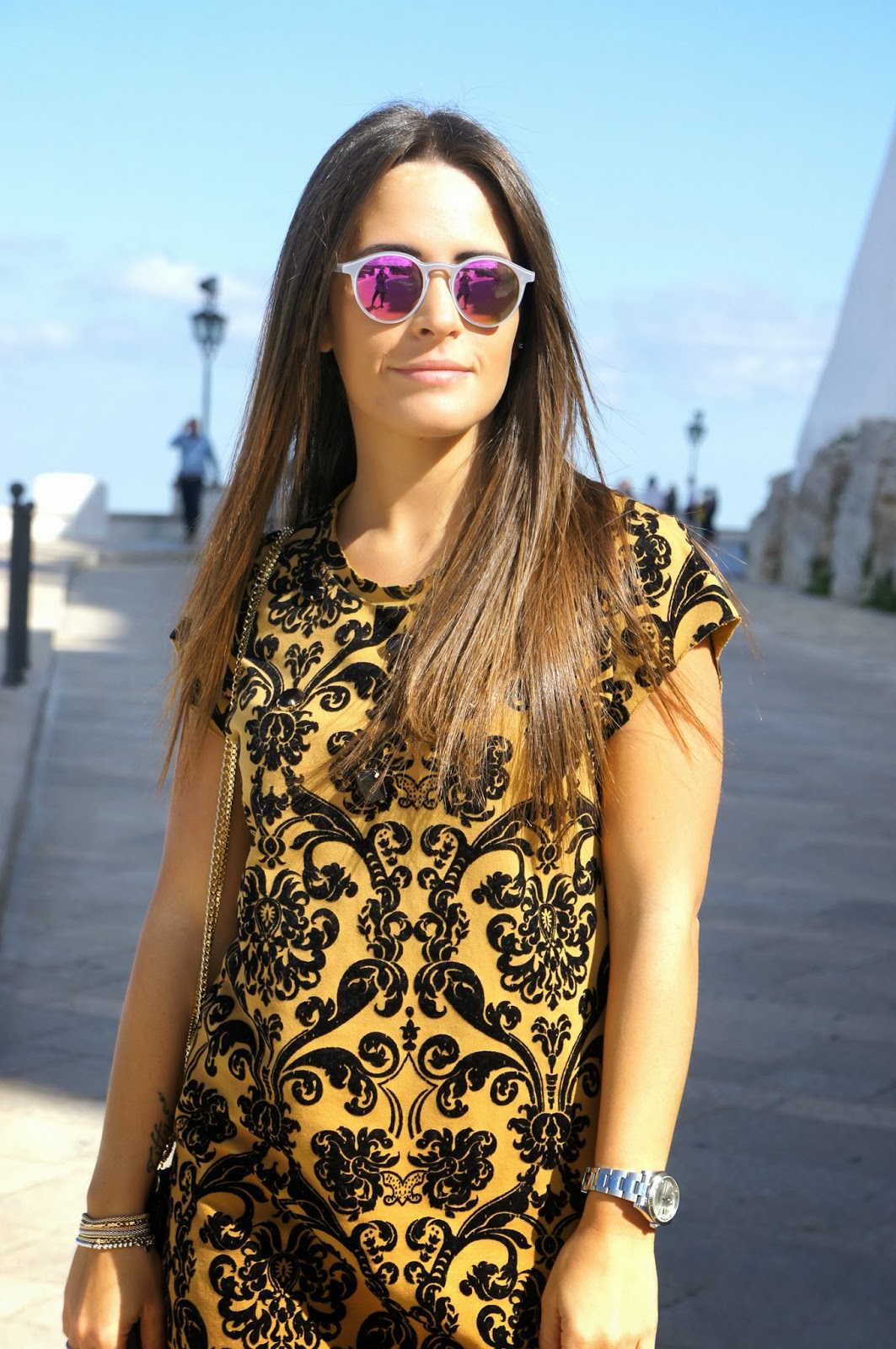 Hai ragione questo abito è pazzesco! Oltretutto i colori ti risaltano tantissimo gli occhi, quindi io farei a meno degli occhiali da sole 😀