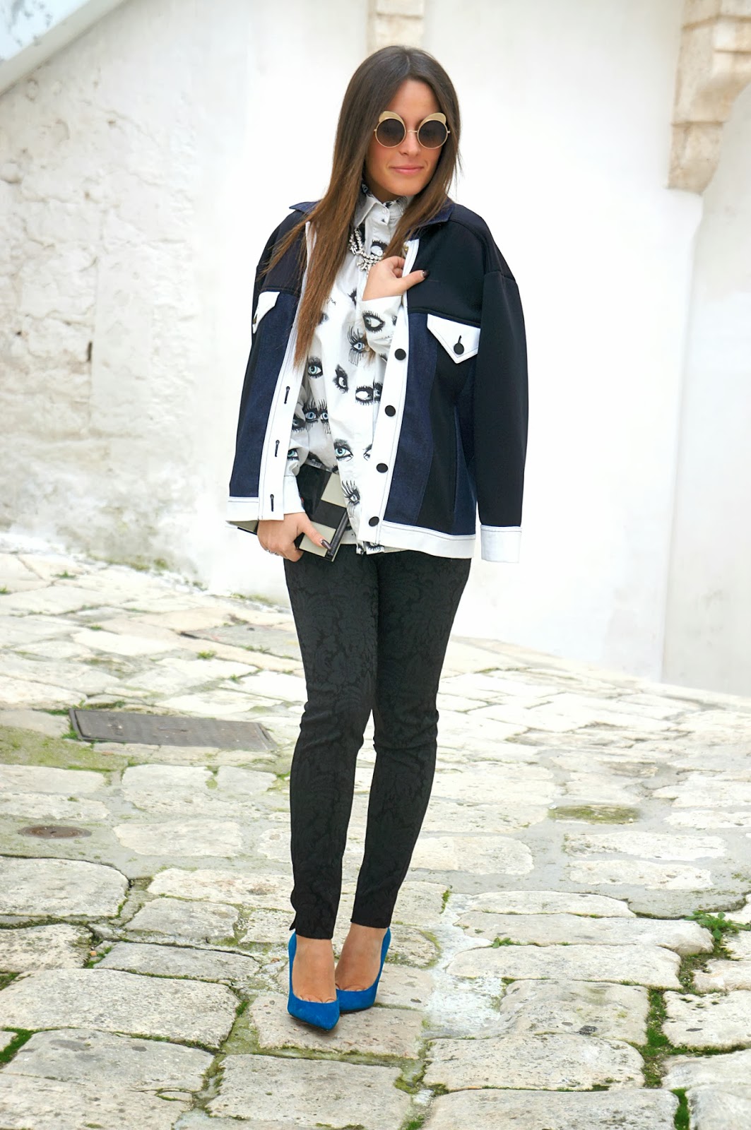 Good morning and welcome back to my blog. There are days now that I fight with my ADSL line , but unfortunately the fault has not yet been repaired. I’m sick , I go from house to house looking for a connection to be able to post on the blog, as at this time. I have a lot of outfits to show you, some very interesting , especially for the various combinations created. Also there are some clothing that I want to show to have your opinion. The look of today is one of those among the most beautiful that I will show you. I love the combination of two strong colors like black and blue, especially when combined with two clothing so singular as the Au Jour Le Jour shirt and the Capsule bomber, and the So Allure pants. They make you think of something the paint on my jacket? Remember the bomber I wore HERE, in fact both clothing are Capsule, a new and original brand that recognized in every clothing. The Jessica Simpson shoes have just become part of my collection. To be honest, I missed a model and so I immediately bought. To complete the outfit there is my new clutch White T-shirt made entirely from Plexiglass, beautiful yes, but not very large. I leave you look at the photos and see you at the next post.