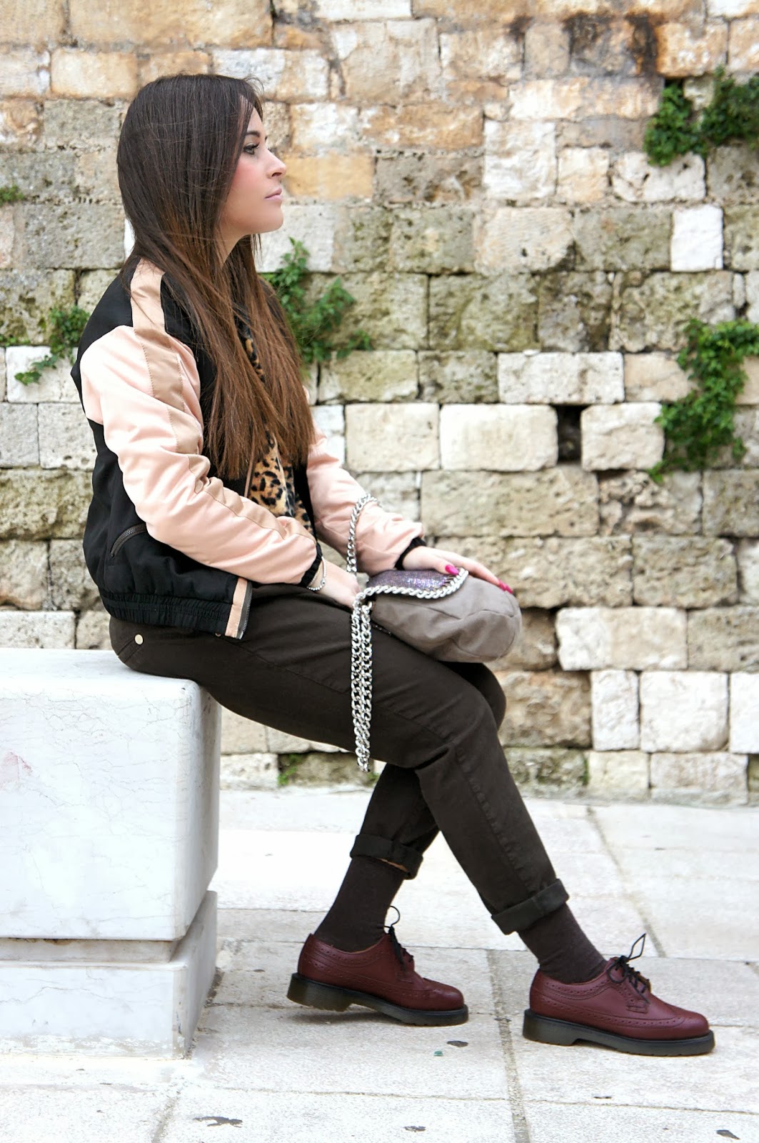How to define this look? I honestly do not know … I can usually give a name to each combination such as animal prints, mix & match, floral or oversized, but this time I do not know how to define it, if not using the usual synonyms such as casual and street… Surely this is an outfit comfortable, practical and easily imitable by anyone and can be used by any woman, the color that predominates among all is the brown in its many shades combined with flashes of old rose and burgundy. The maxi Zara bomber jacket is the first time that I wear it, even though it is already in my closet by this summer, but I had no idea of how to wear it, nor when, nor with what. So I chose to mix it in a very simple way, along with a brown pants Manila Grace and Dr. Martens shoes oxford , a model present in every woman’s shoe rack. A warm sweater animal print and you’re done, ready for a new day of work and various chores. Last thing to be mentioned , but no less important, indeed, is my watch, last online purchase on Sammydress. I receive many questions from my readers about this e-commerce and finally I can give you a demonstration of how things actually are beautiful and especially good quality. I hope that you enjoy this look! A hug, I run to make two clicks!