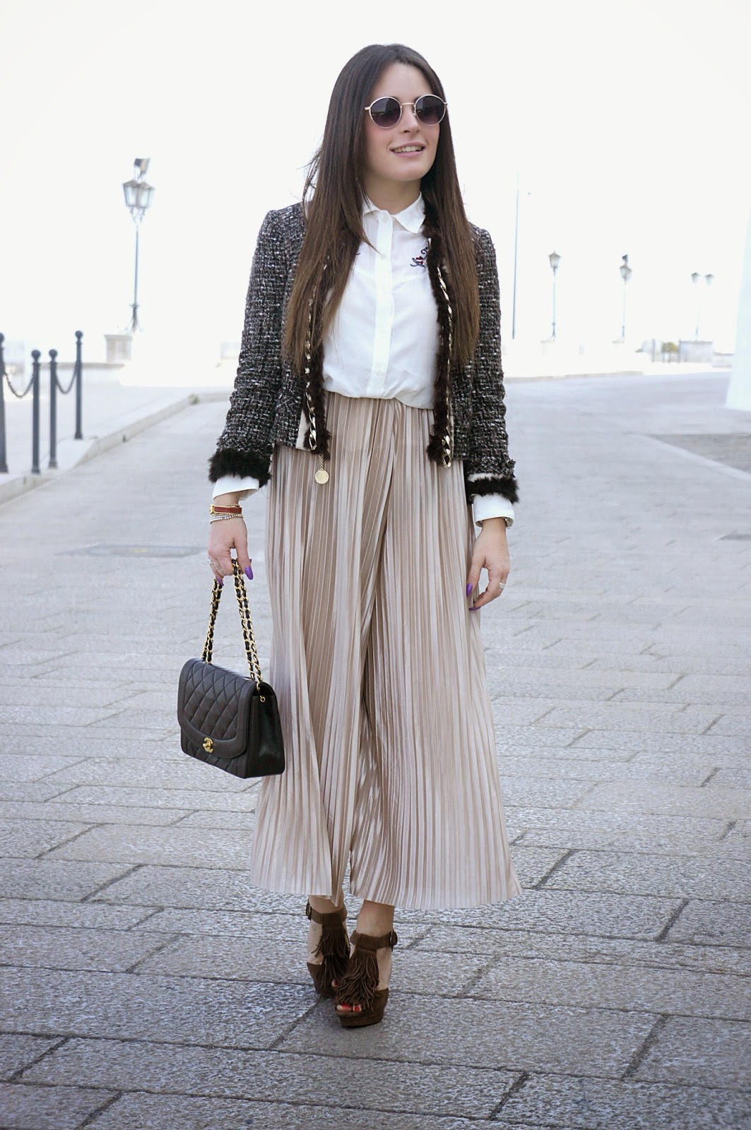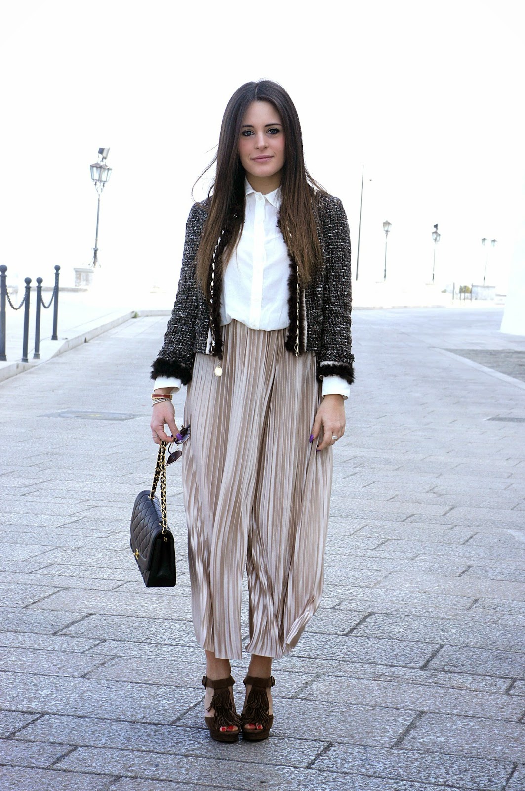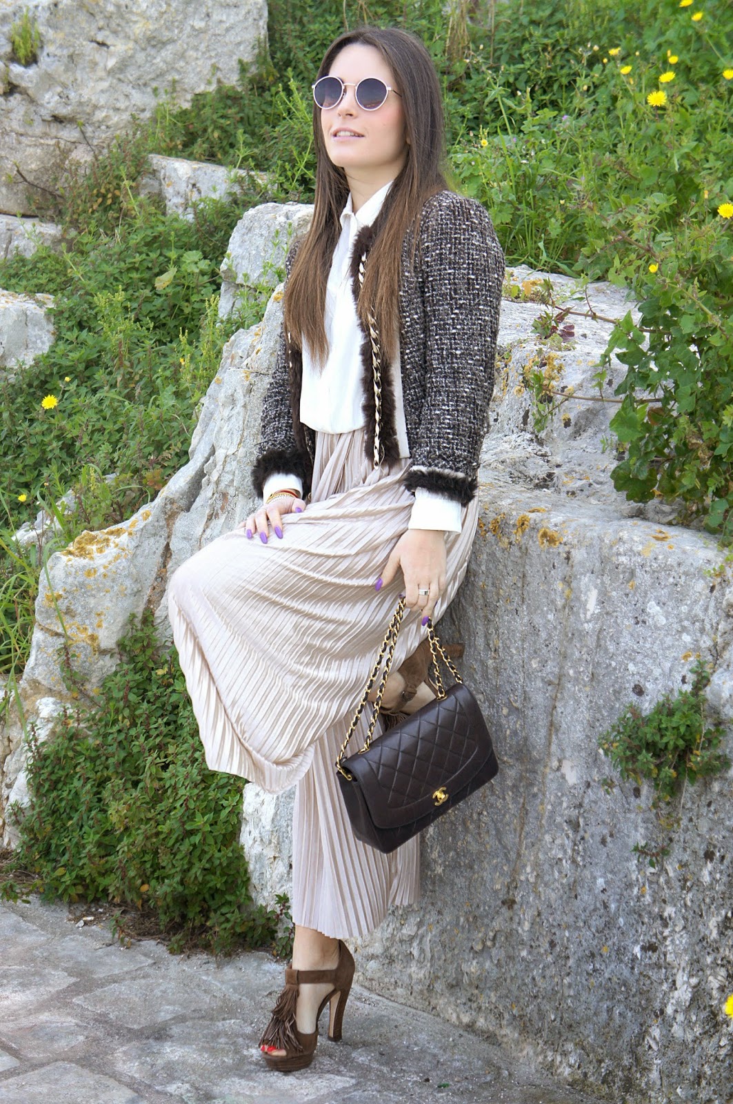 This has happened to me a few days ago while I was home ! I went out of old boxes these “new” Pura Lopez shoes since they have been worn a few times and I immediately sought out the right clothes to combine. You have learned to know me and so you know that I like to be daring and especially change gender, so I opted for a pleated pants semi-transparent, model Chanel jacket of an old collection Elisabetta Franchi and vintage Chanel bag. A style retrò and modern, with the design of the shoe that resembles the old style and the fringes that are now in the latest trends, pattern jacket seen and reviewed by dozens of years and the iconic Chanel bag always trendy but vintage model. I’d love to know what you think. I wish you a good weekend.