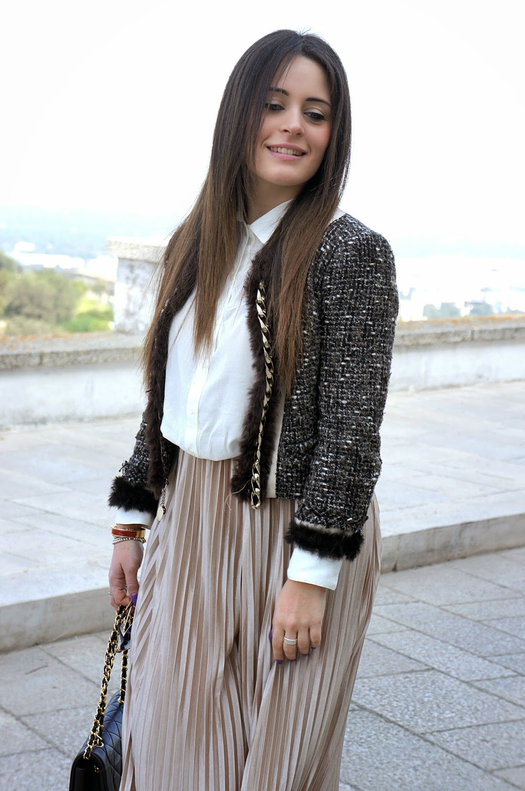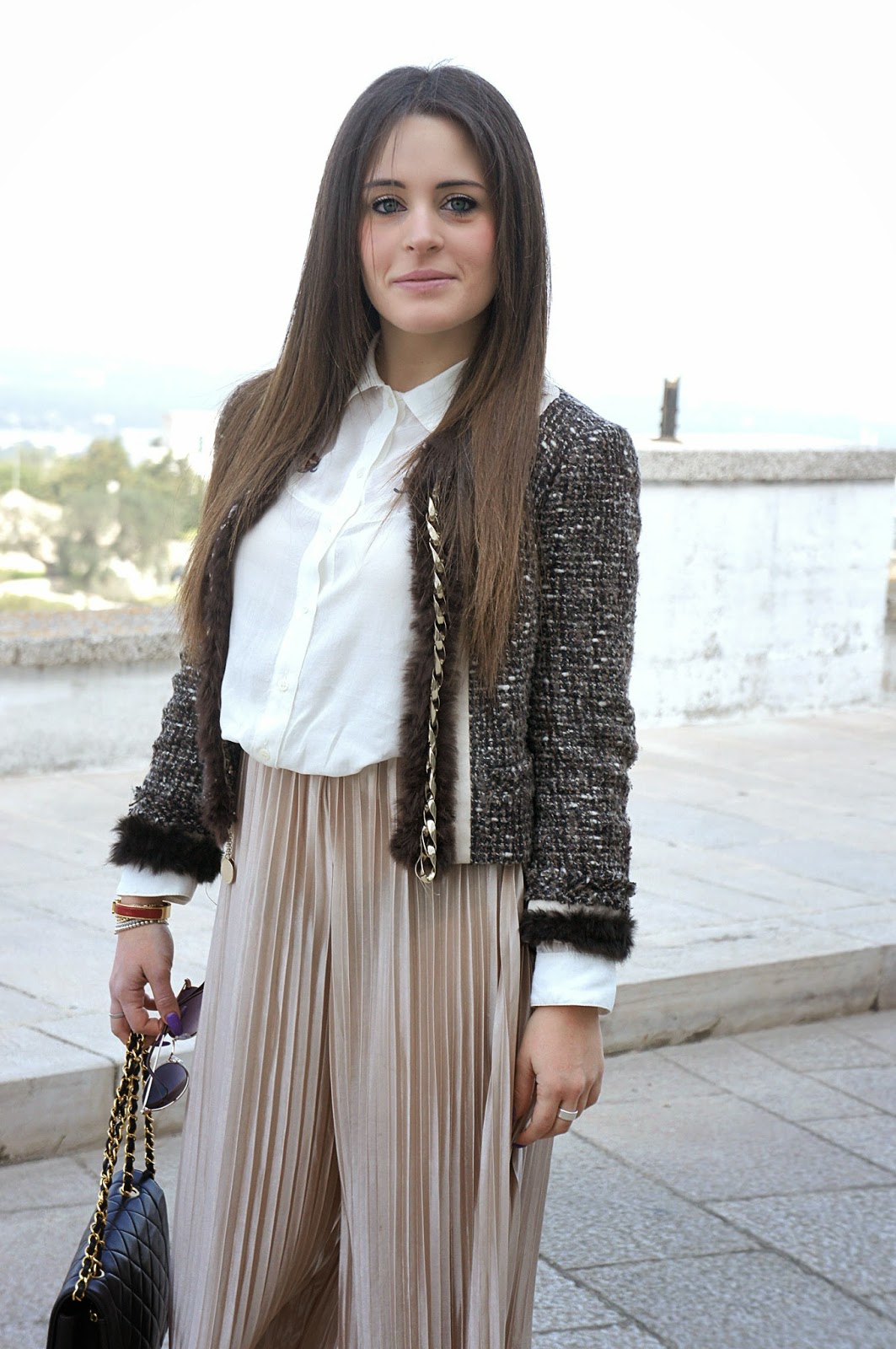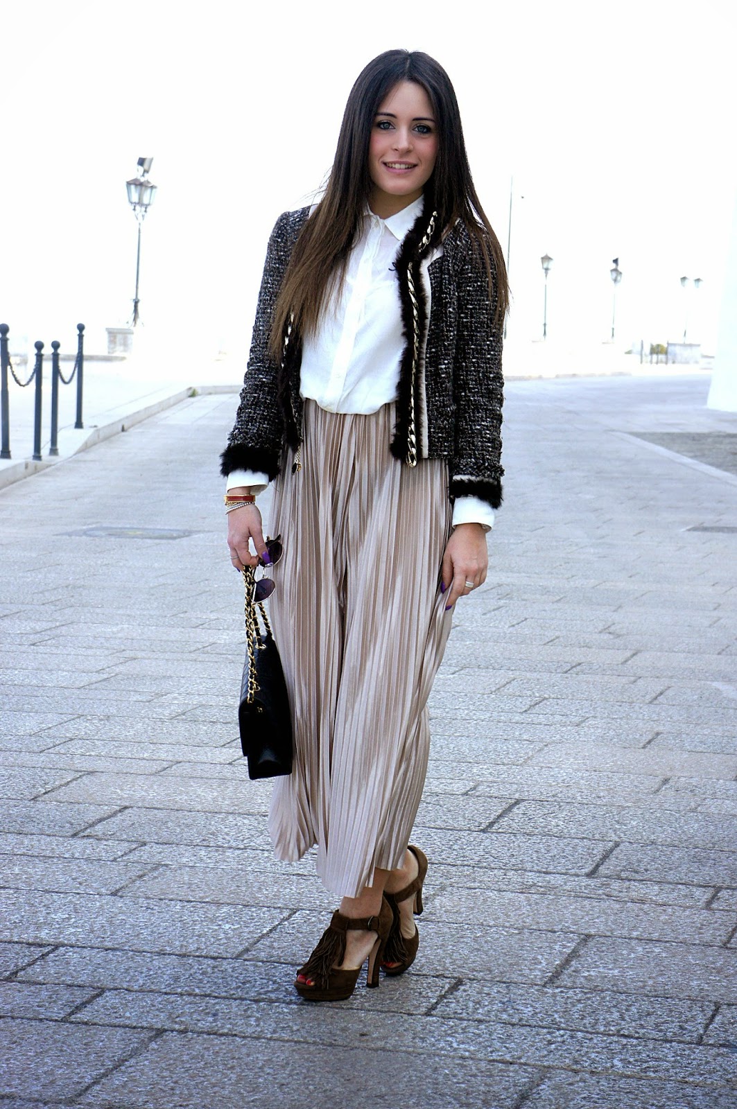 This has happened to me a few days ago while I was home ! I went out of old boxes these “new” Pura Lopez shoes since they have been worn a few times and I immediately sought out the right clothes to combine. You have learned to know me and so you know that I like to be daring and especially change gender, so I opted for a pleated pants semi-transparent, model Chanel jacket of an old collection Elisabetta Franchi and vintage Chanel bag. A style retrò and modern, with the design of the shoe that resembles the old style and the fringes that are now in the latest trends, pattern jacket seen and reviewed by dozens of years and the iconic Chanel bag always trendy but vintage model. I’d love to know what you think. I wish you a good weekend.