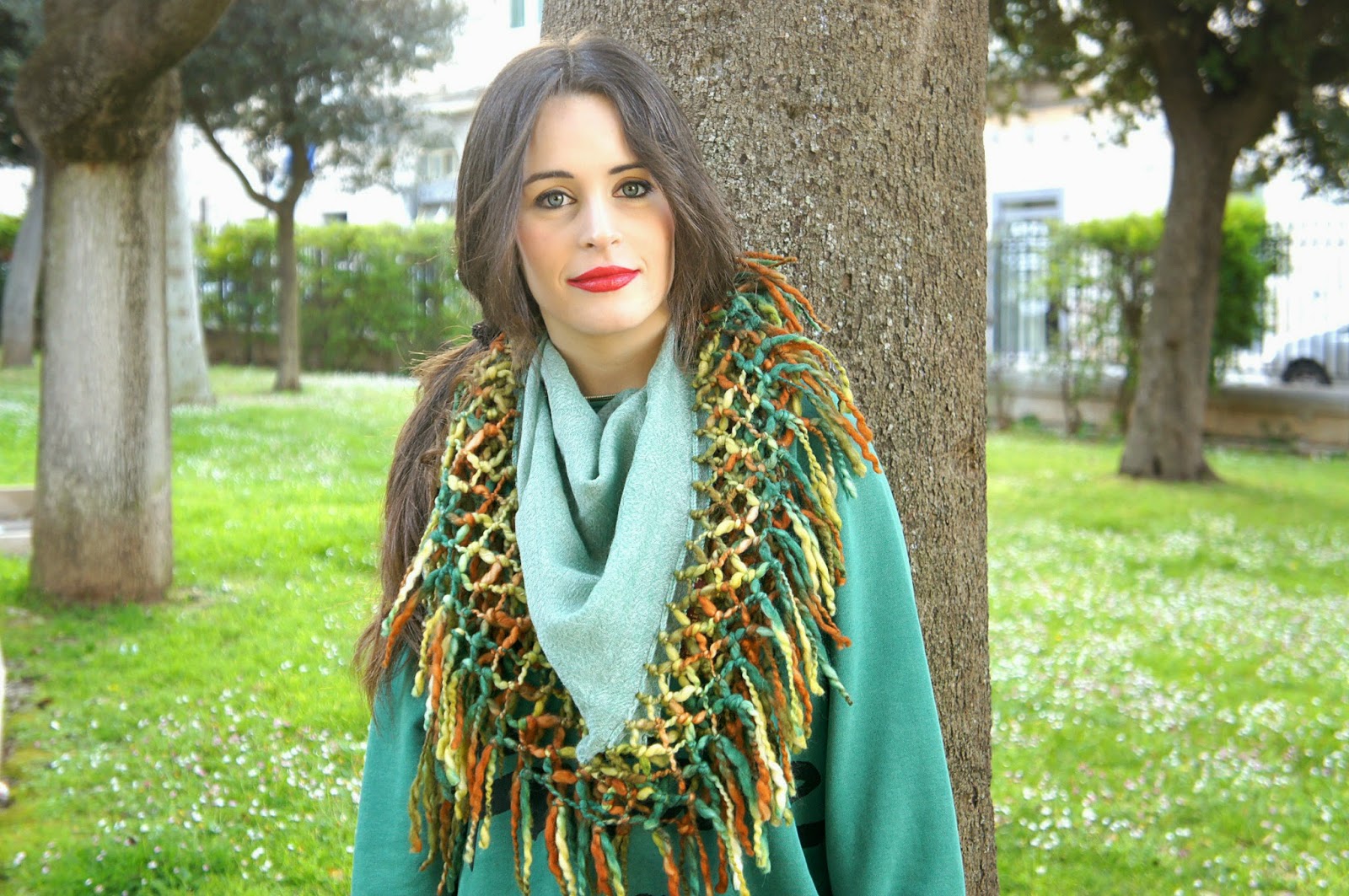 ciao annalisa! questi toni del verde ti stanno molto bene perchè riprendono il colore dei tuoi occhi, la sciarpa è molto particolare, quasi etnica! baci da mamma e figlia blogger, se ti va passa a vedere il nostro ultimo post http://redhead-blondie.blogspot.it/2014/04/serata-inaugurale-Bifest-Bari.html