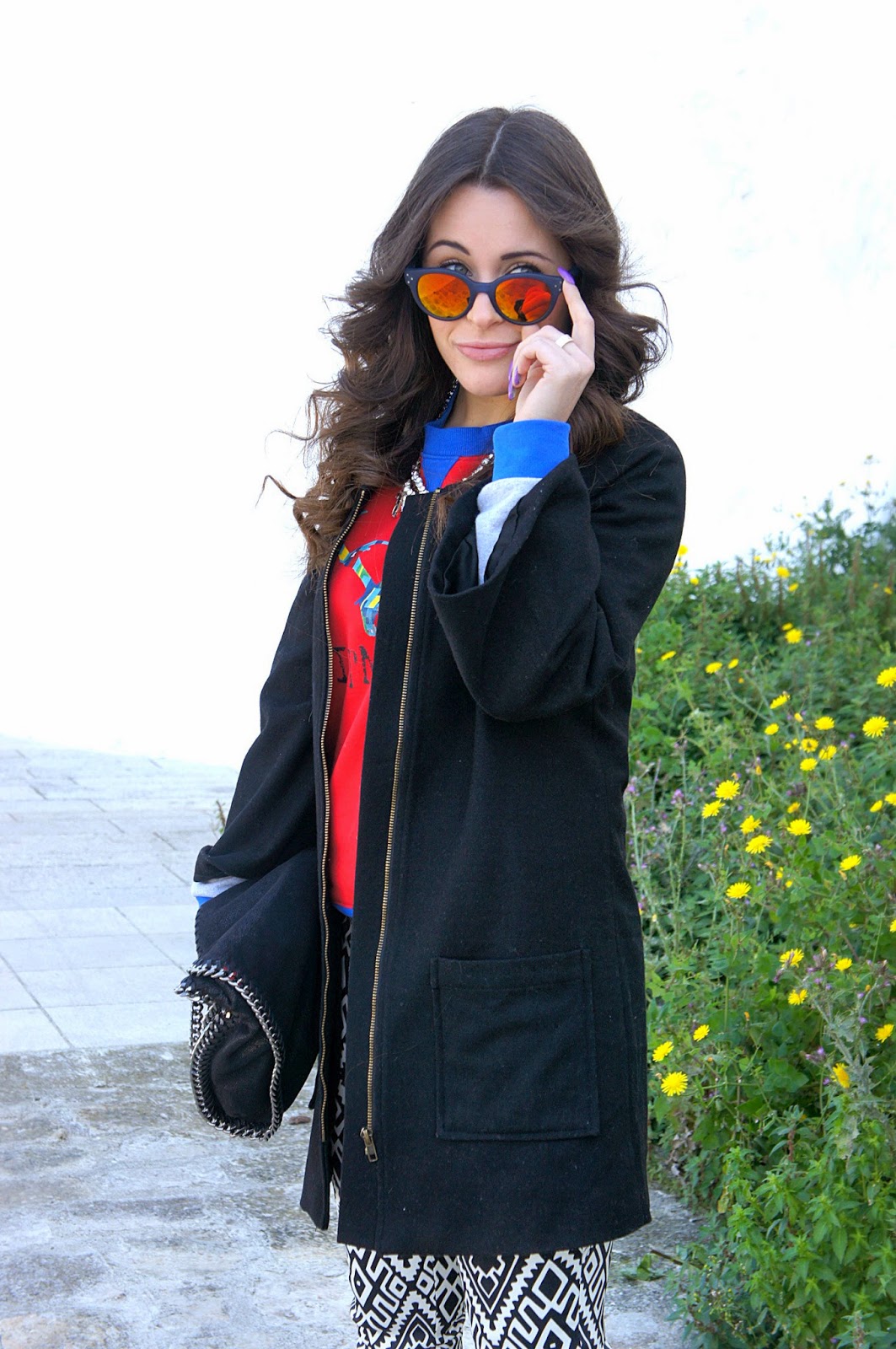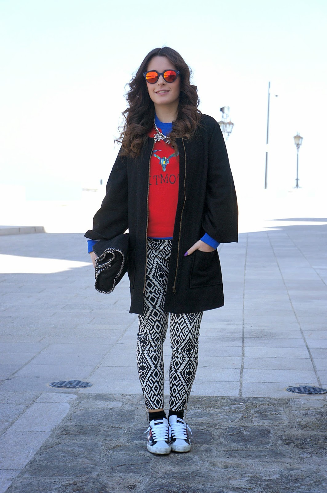 La stampa di questo pantalone è bellissima e mi piace il contrasto che crea con il rosso e blu della felpa.
