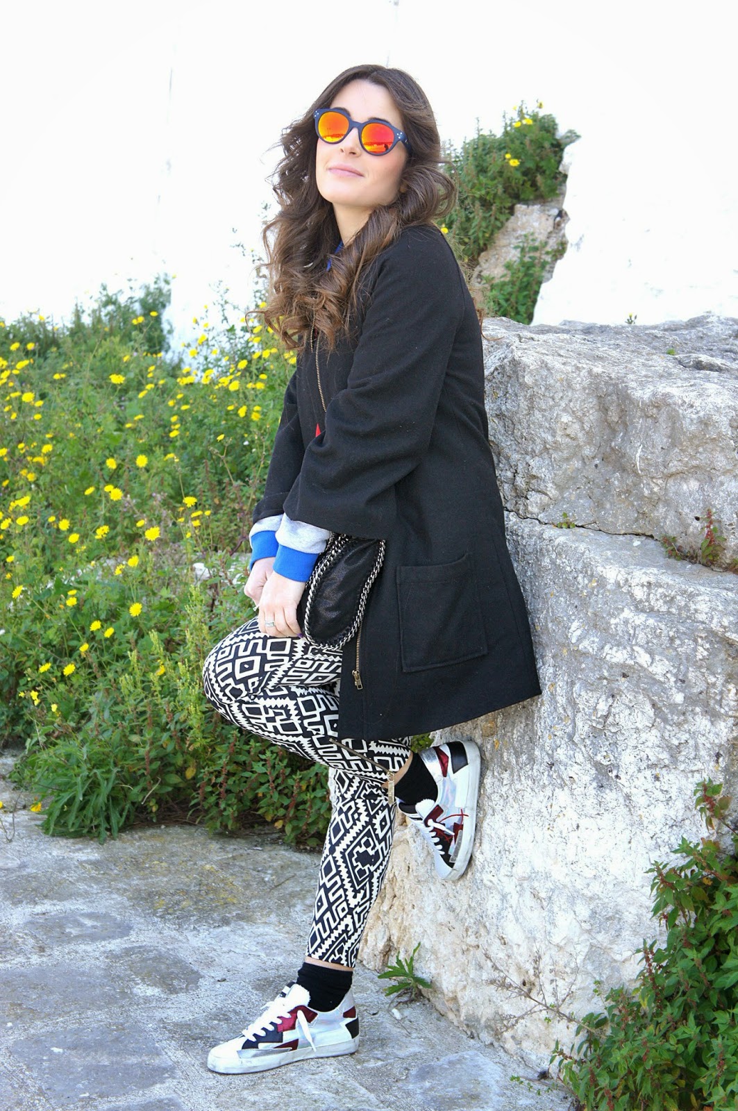 Good Sunday, I just got back from the stadium where I saw him play my half and it seems almost absurd to say but I am a bit ‘tired, I do not know why, but every time I go out the Sunday afternoon I get a crazy sleep. Obviously I can not go to sleep, otherwise how would I do with you? This look I had to post it yesterday, but I could not for some unexpected and so here I am… Do you remember these pants Elisabetta Franchi leatherette worn for my sister’s birthday? It ‘spent a year and a half and they are still perfect. I’ve worn them just last Sunday in a fairly cool and breezy day, so much to choose my warm Leitmotiv sweatshirt and black coat to warm. A look colorful and full of geometries, including the pants, sweatshirt (also worn here) and especially my fantastic new Philippe Model that struck me from the first moment I saw them. A mise for me promoted. What do you think? Good Sunday.
