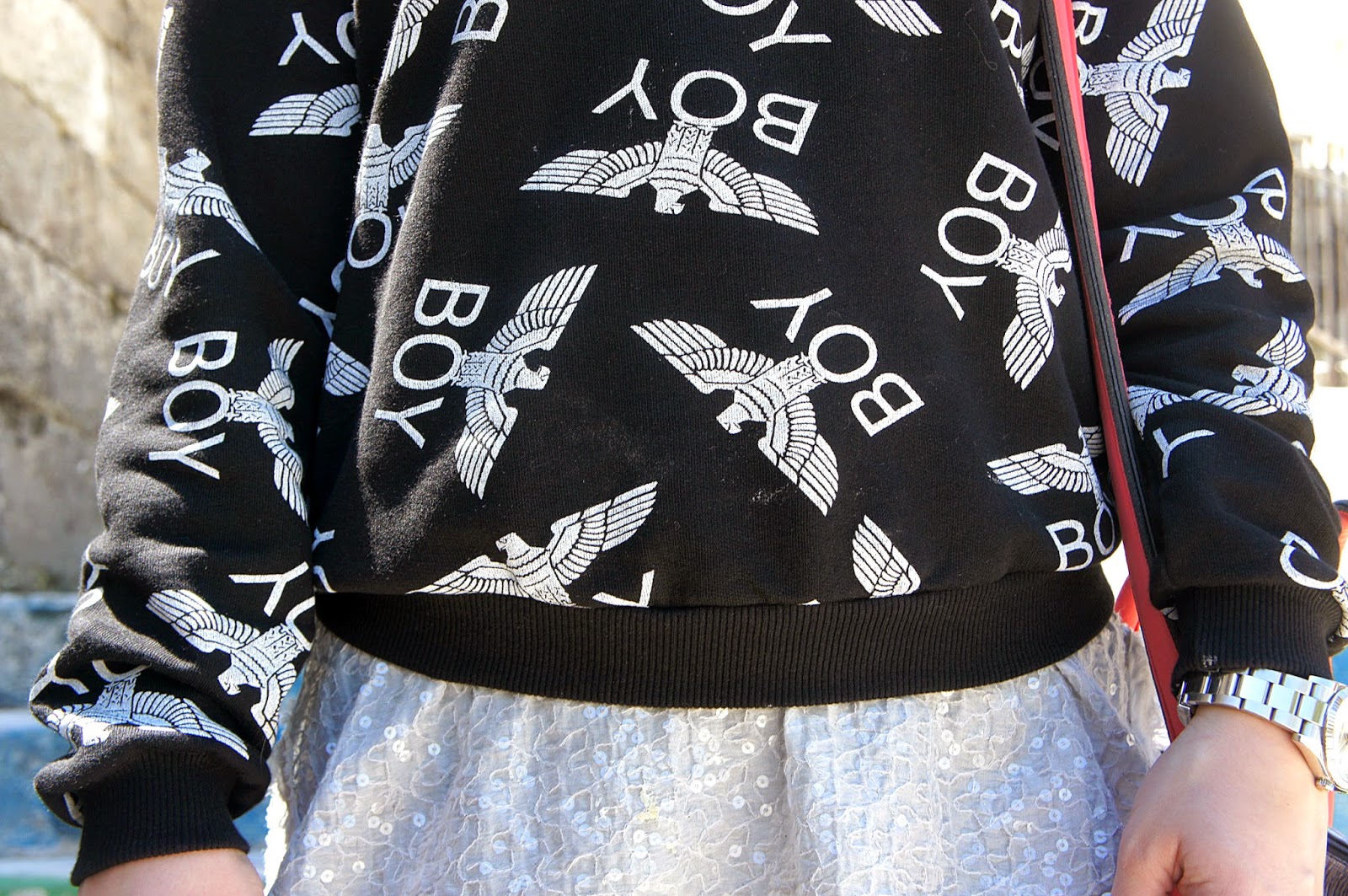 Ho acquistato la mia felpa super figa Boy London da qualche mese e fin dal primo momento me ne sono innamorata, a dir la verità ero indecisa fra i due modelli di punta ma alla fine ho optato per la versione tempestata di scritte e non me ne sono affatto pentita. L’ho fatta aspettare un po’ nel mio guardaroba, ma alla fine eccola qua, abbinata a leggings in eco pelle e canotta con paillettes che sbuca al di fuori della felpa per equilibrare le lunghezze. In un total black & white, ho voluto inserire due pezzi forti e colorati come la borsa ViaMailBag e le sneakers Philippe Model, che con le sue geometrie brillano da far paura. Tanto belle quanto comode, e di questo ne sono felice perchè finalmente posso dire di avere un paio di scarpe che non mi fanno male.