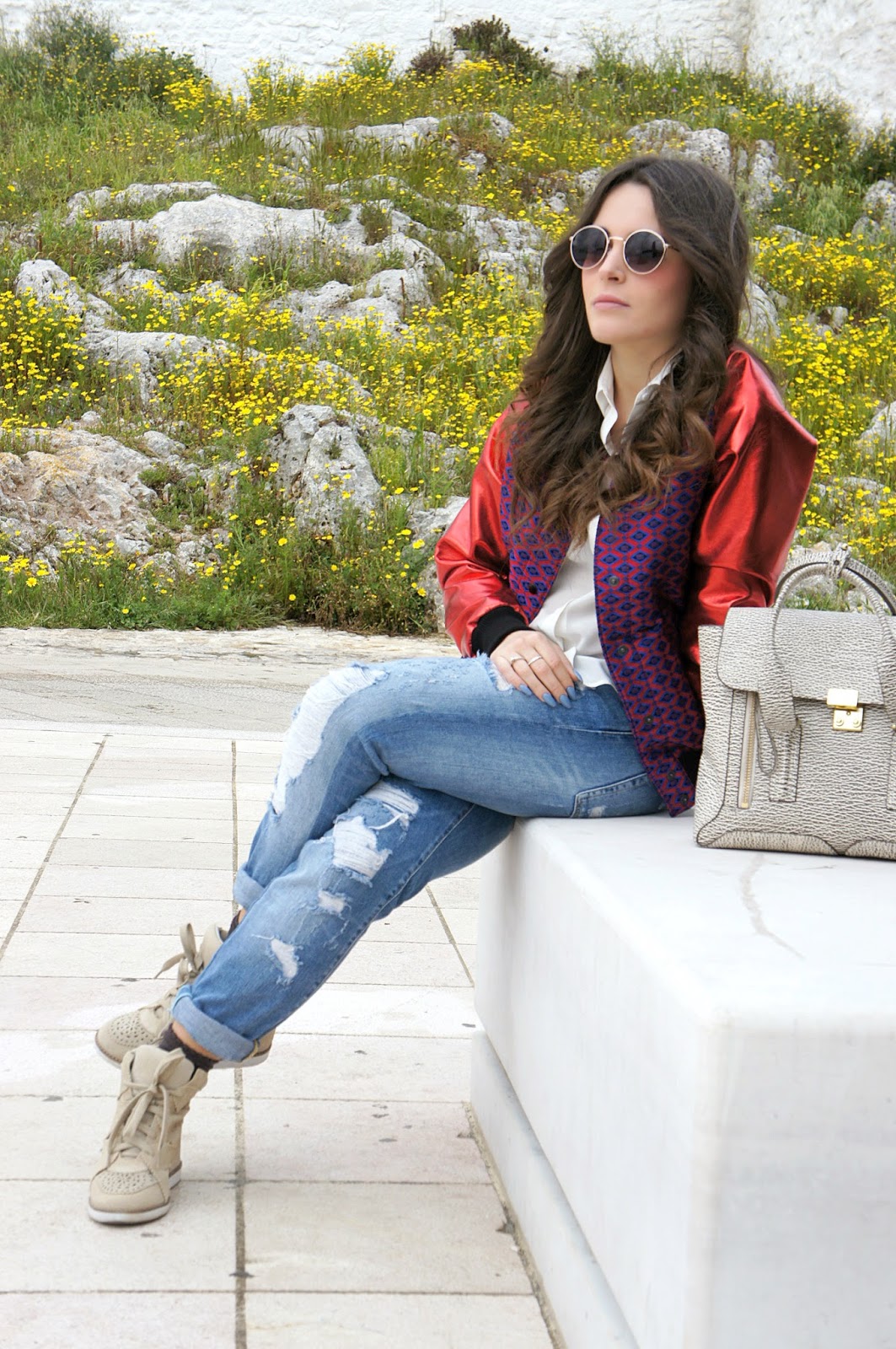 Quando ho visto per la prima volta questo bomber in questa versione, me ne sono subito innamorata e non potevo lasciarmelo scappare, in più ho anche acquistato lo shorts a completo che non appena il tempo permetterà, vi vorrei mostrare. Come vedete, a differenza dell’altra volta in cui l’ho indossato con una gonna lunga in total black e sneakers (vedi qui), questa volta ho scelto un semplice jeans strappato, camicia in seta e le mie wedge sneakers Jeffrey Campbell Venice Hi (vedi qui un altro look).